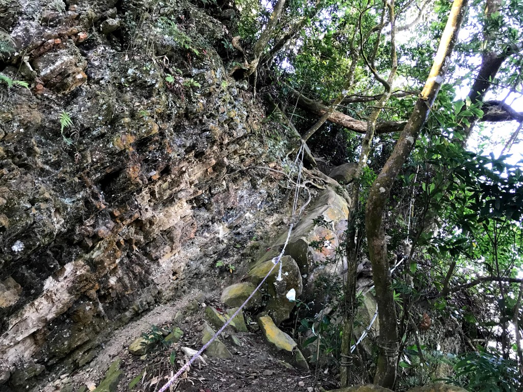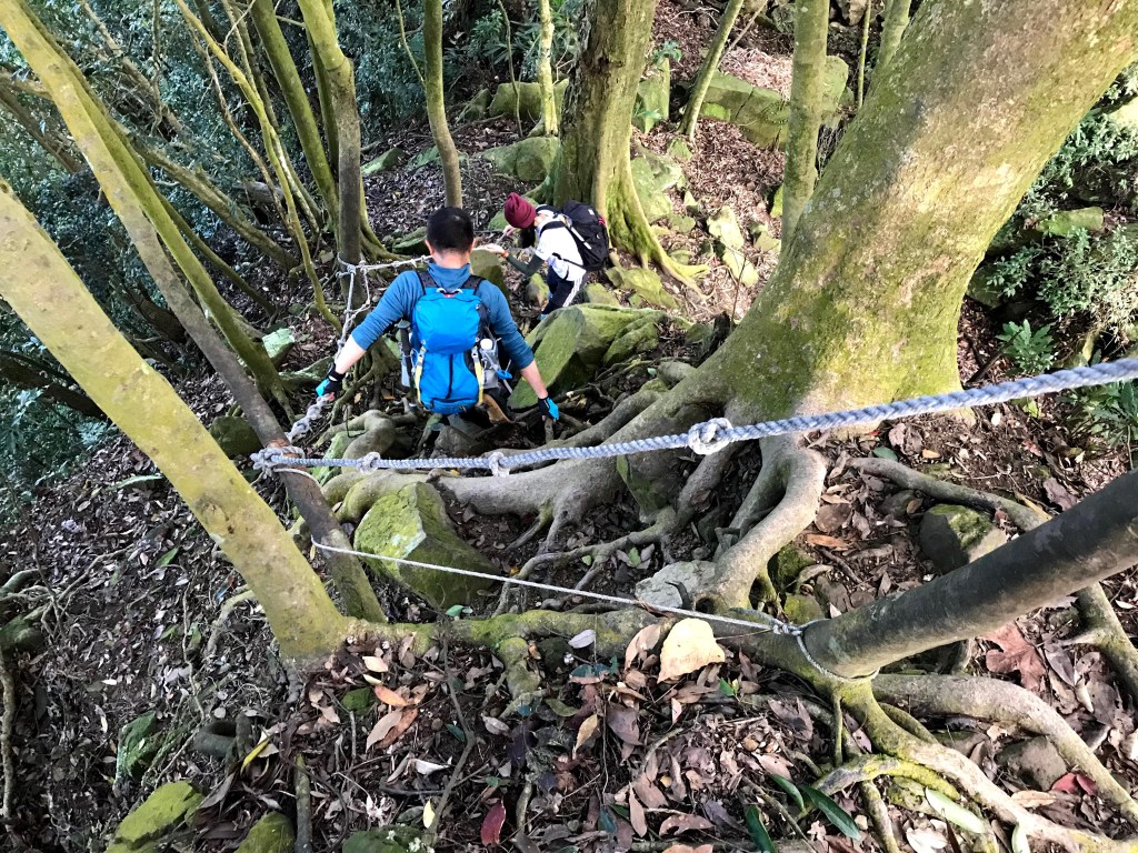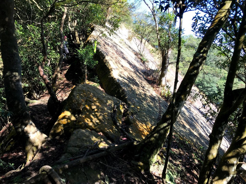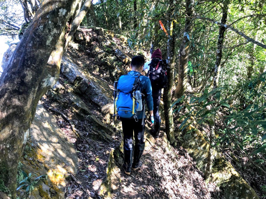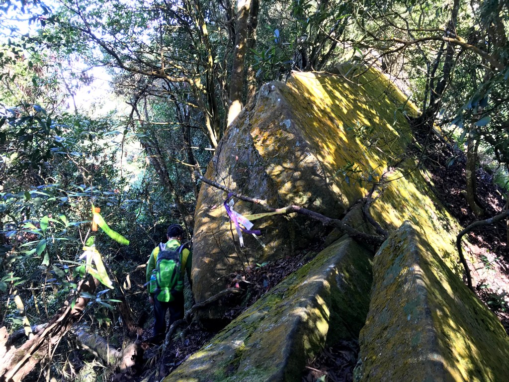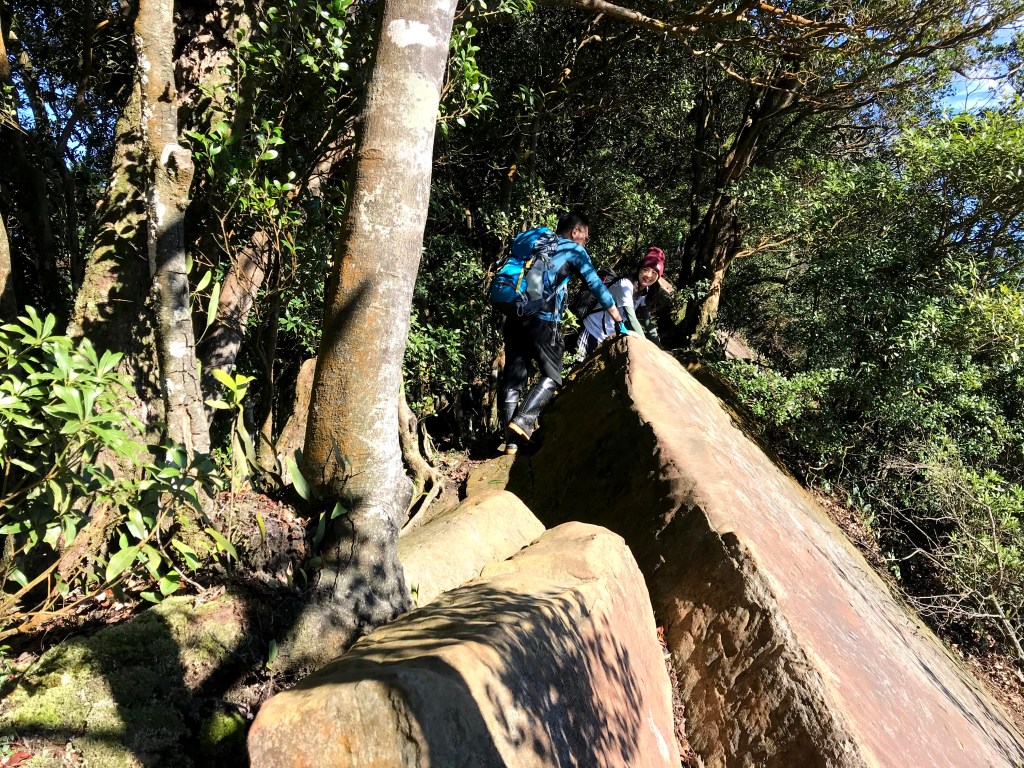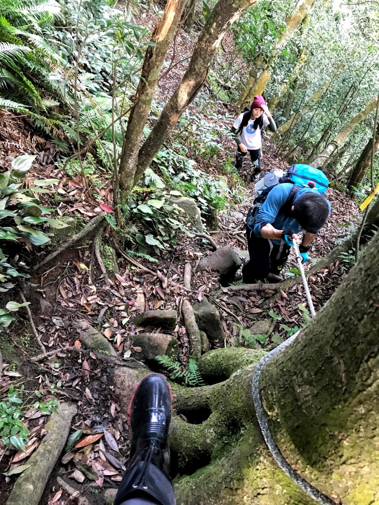 略微休息一下後,開始往福南山走,由仙山到福南山這一段的距離有2.3K,也是今天整天路徑中最原始的一段,一開始就是一路陡下,幾乎都是走在瘦稜上,沿路的路徑上有很多附著苔蘚的岩石,要經過三個假山頭,陡上陡下的角度都很大,但都有繩索輔助,部份的瘦稜邊坡是斷崖型態,行走時要特別小心!中途會經過一處岩壁展望點,而在接近到達福南山前,會出現一處極為陡深的岩壁,經過後即可抵達福南山。