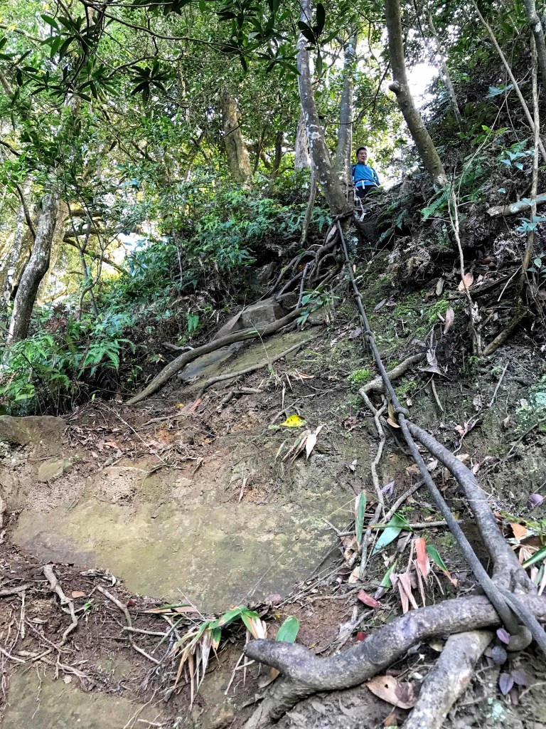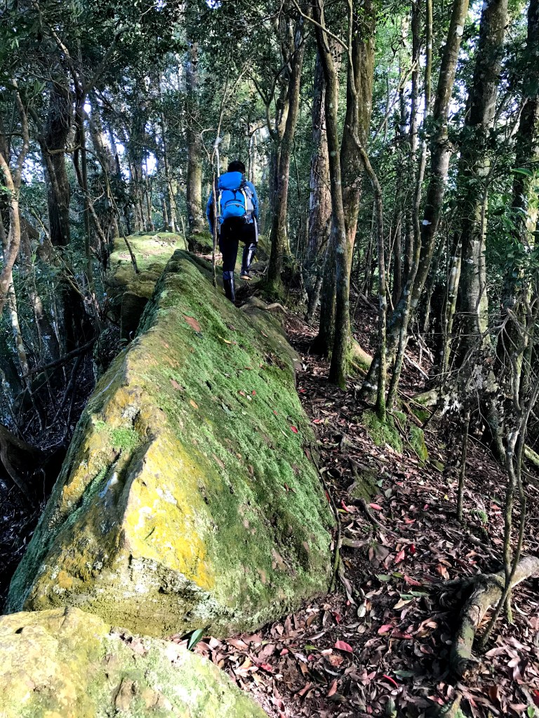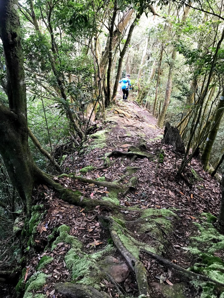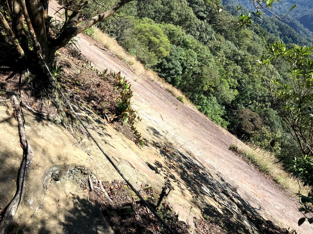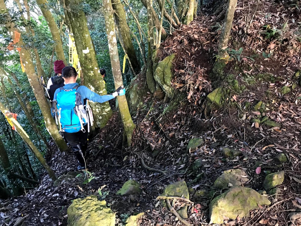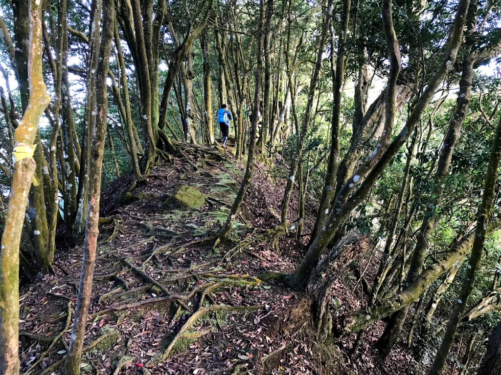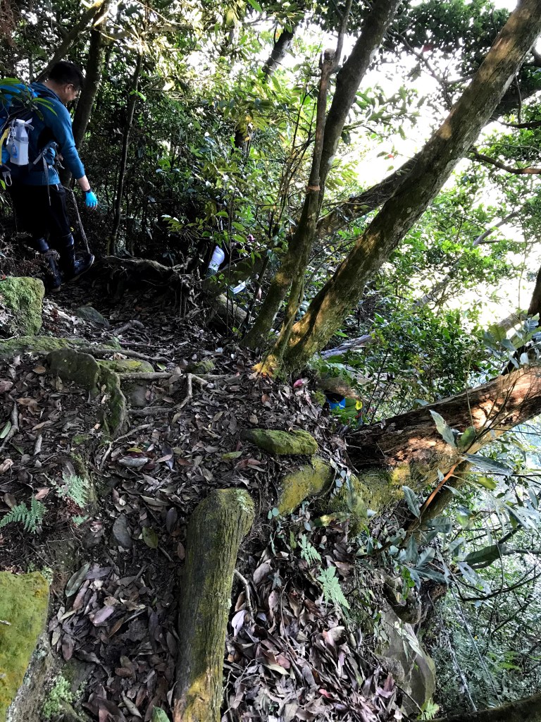 略微休息一下後,開始往福南山走,由仙山到福南山這一段的距離有2.3K,也是今天整天路徑中最原始的一段,一開始就是一路陡下,幾乎都是走在瘦稜上,沿路的路徑上有很多附著苔蘚的岩石,要經過三個假山頭,陡上陡下的角度都很大,但都有繩索輔助,部份的瘦稜邊坡是斷崖型態,行走時要特別小心!中途會經過一處岩壁展望點,而在接近到達福南山前,會出現一處極為陡深的岩壁,經過後即可抵達福南山。