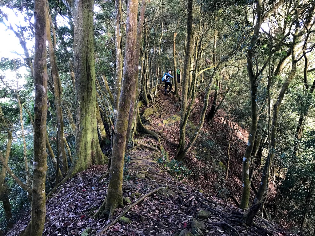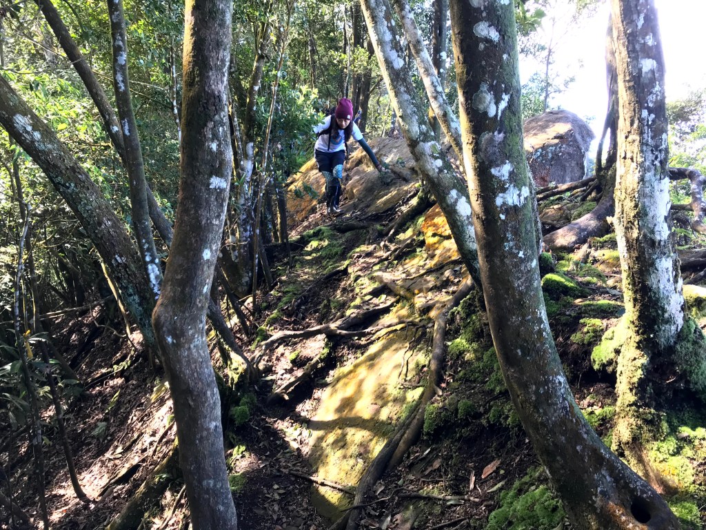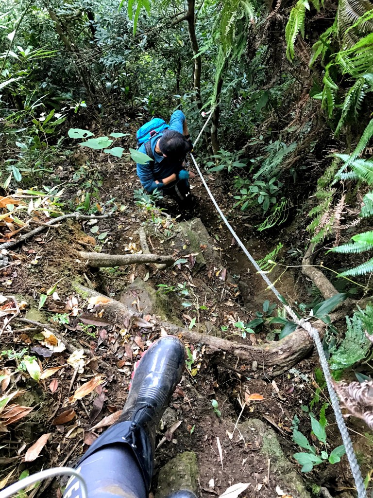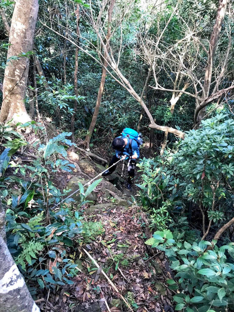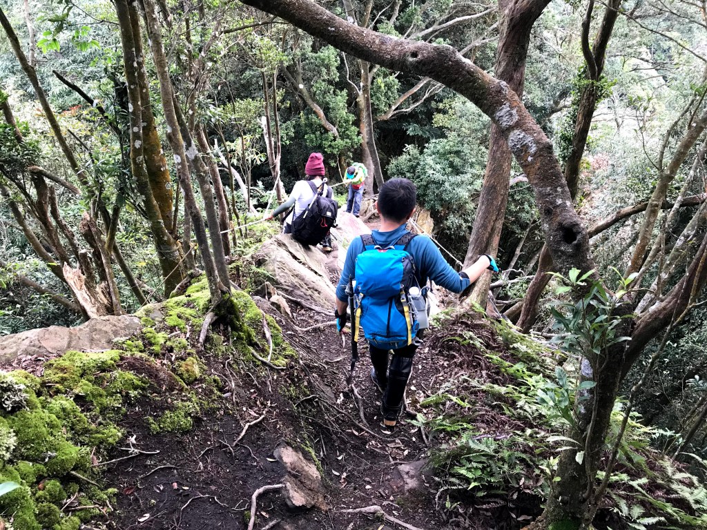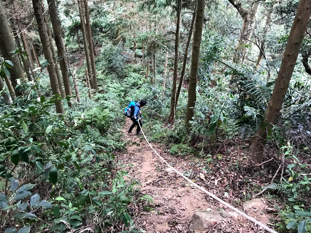 略微休息一下後,開始往福南山走,由仙山到福南山這一段的距離有2.3K,也是今天整天路徑中最原始的一段,一開始就是一路陡下,幾乎都是走在瘦稜上,沿路的路徑上有很多附著苔蘚的岩石,要經過三個假山頭,陡上陡下的角度都很大,但都有繩索輔助,部份的瘦稜邊坡是斷崖型態,行走時要特別小心!中途會經過一處岩壁展望點,而在接近到達福南山前,會出現一處極為陡深的岩壁,經過後即可抵達福南山。