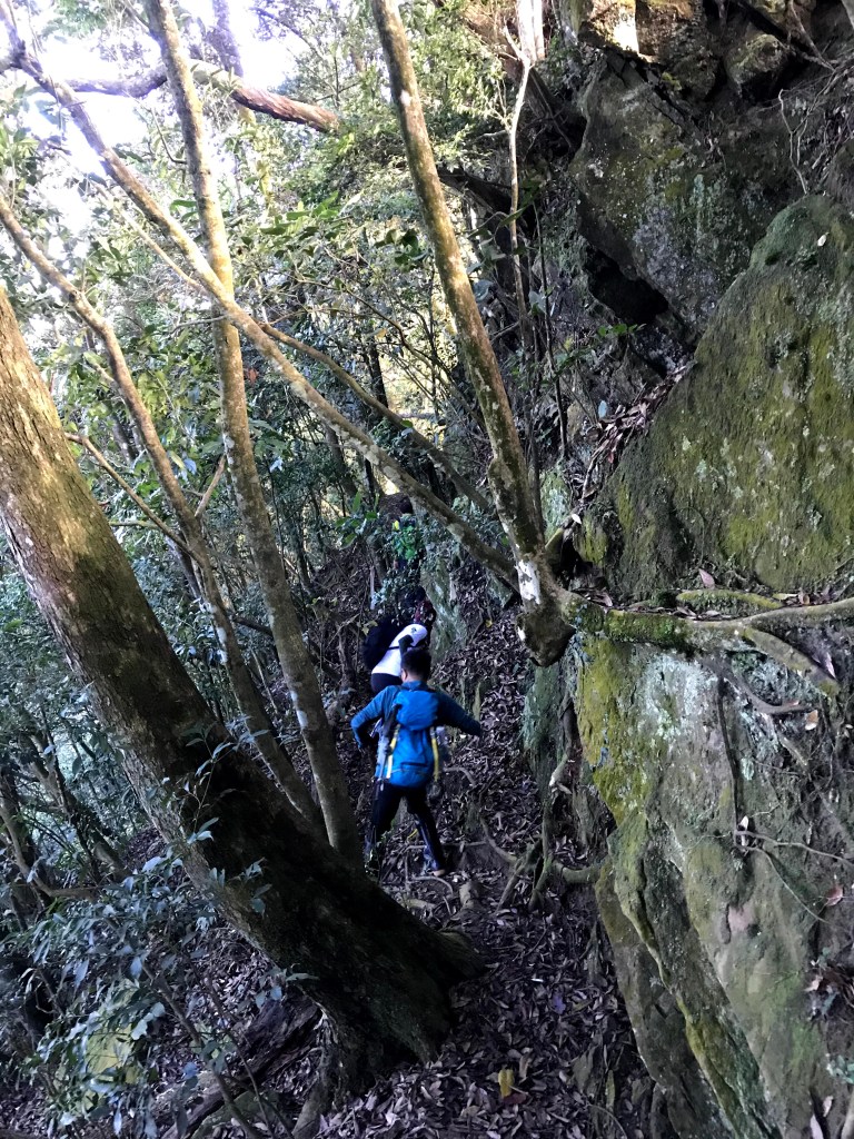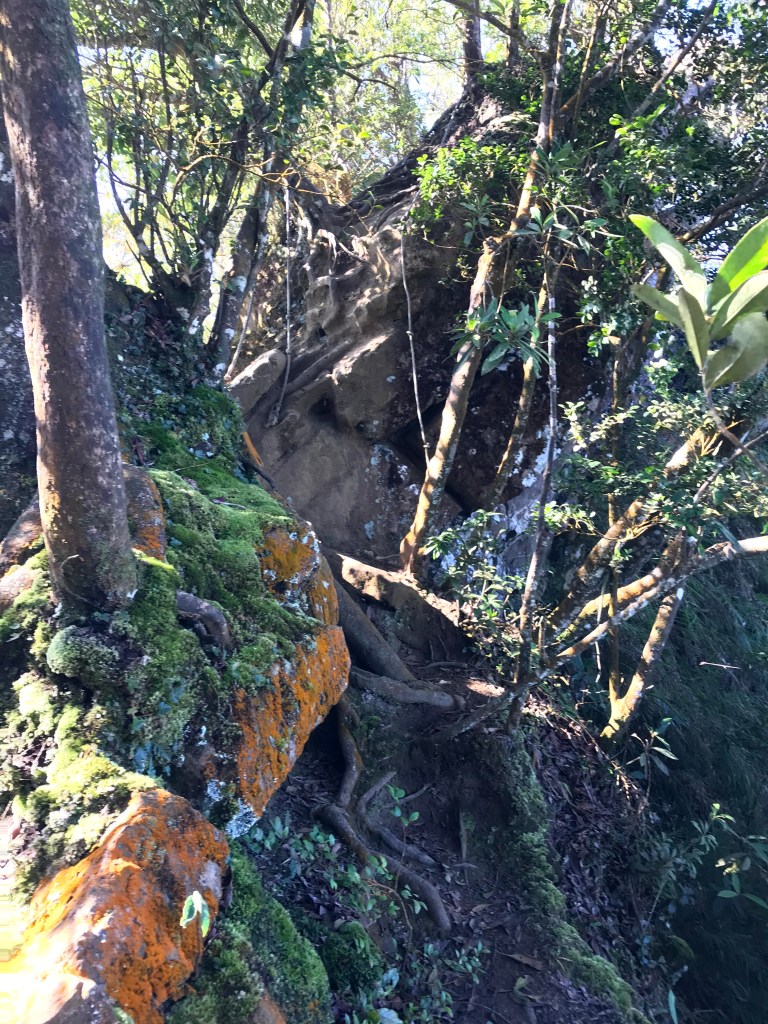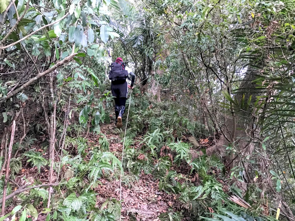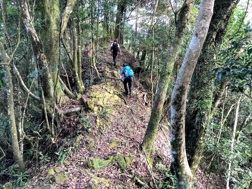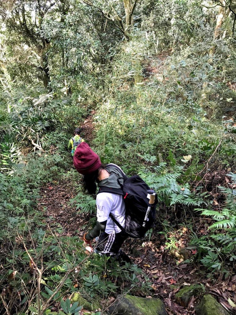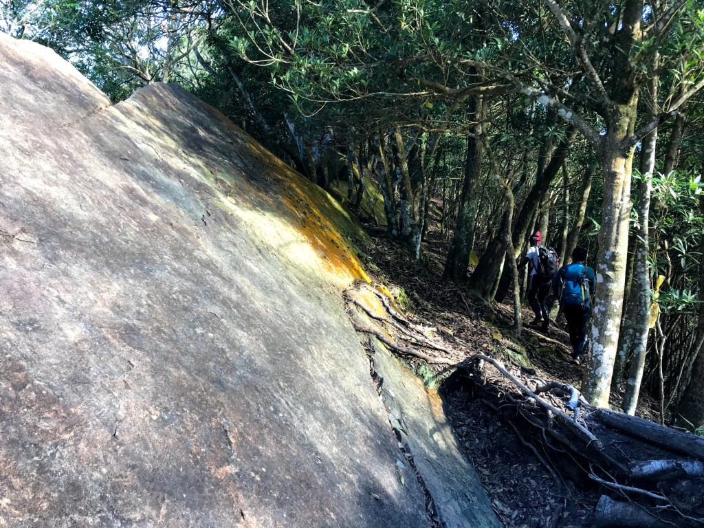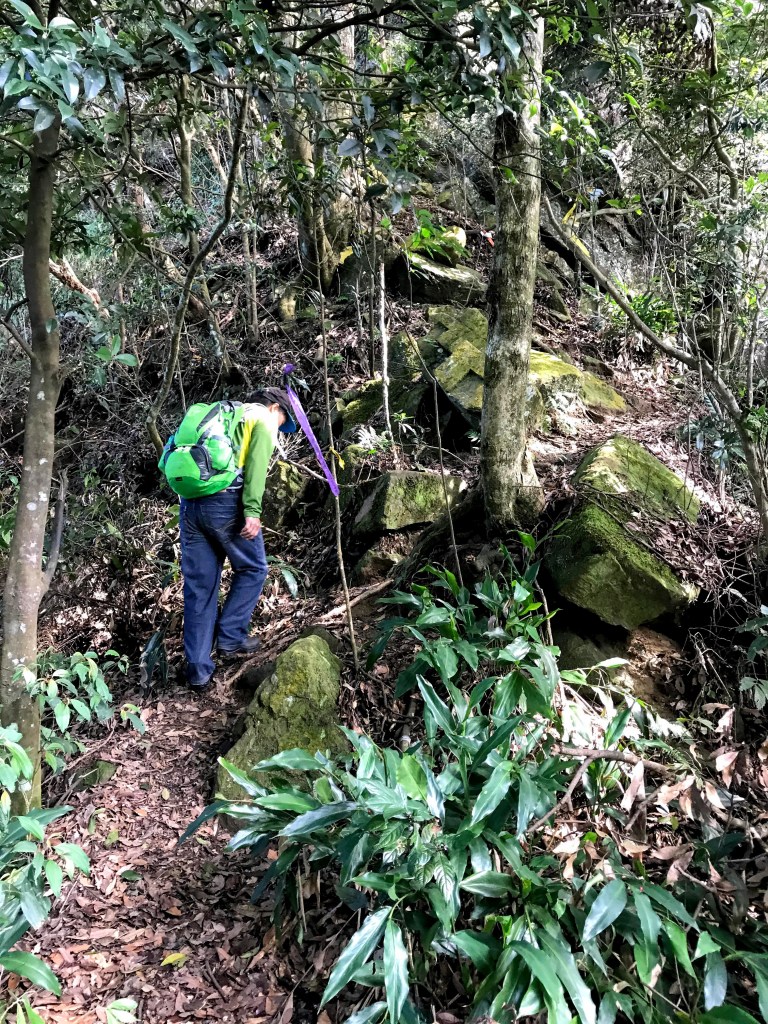 略微休息一下後,開始往福南山走,由仙山到福南山這一段的距離有2.3K,也是今天整天路徑中最原始的一段,一開始就是一路陡下,幾乎都是走在瘦稜上,沿路的路徑上有很多附著苔蘚的岩石,要經過三個假山頭,陡上陡下的角度都很大,但都有繩索輔助,部份的瘦稜邊坡是斷崖型態,行走時要特別小心!中途會經過一處岩壁展望點,而在接近到達福南山前,會出現一處極為陡深的岩壁,經過後即可抵達福南山。