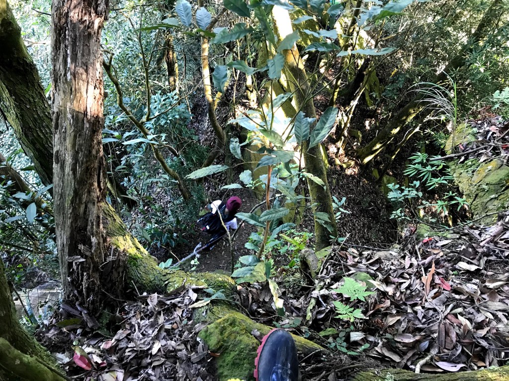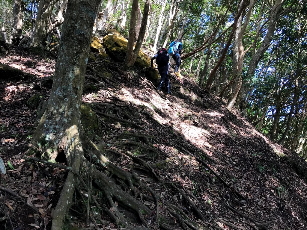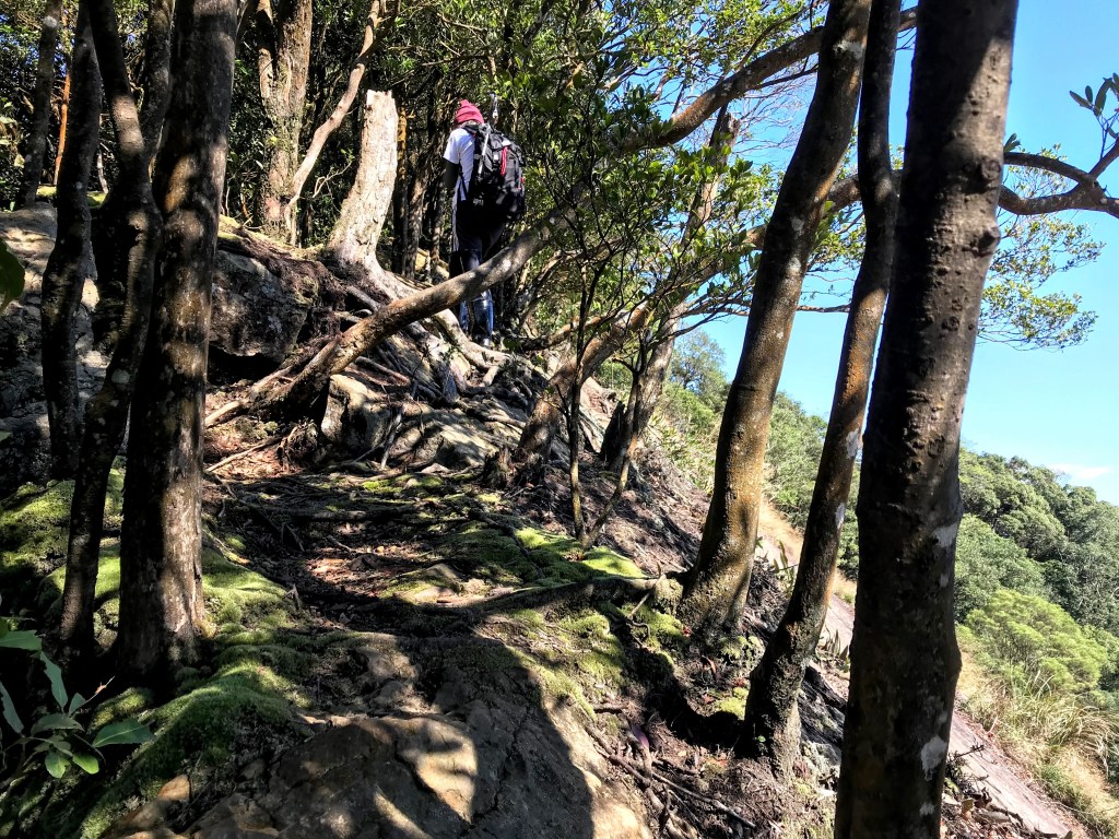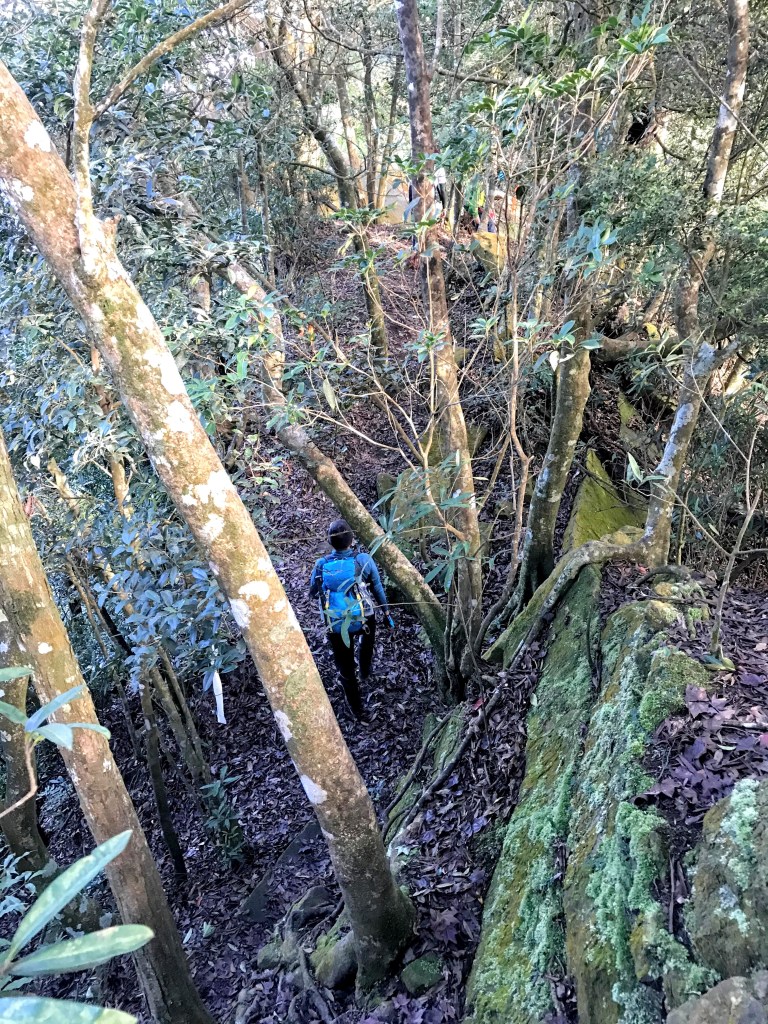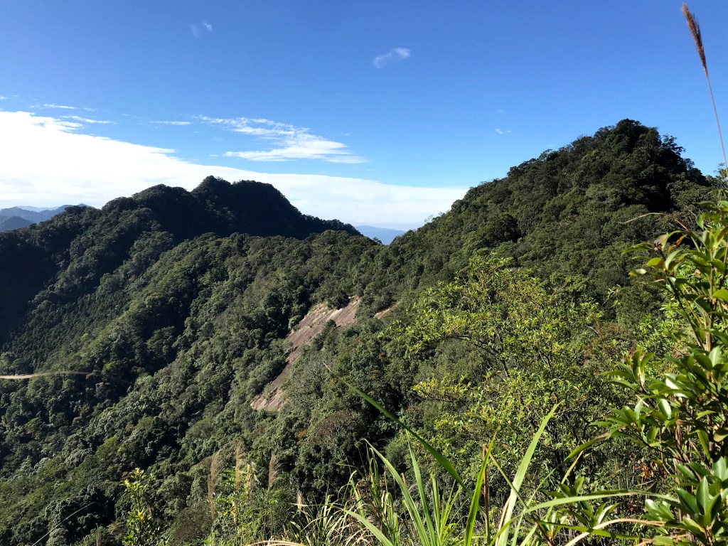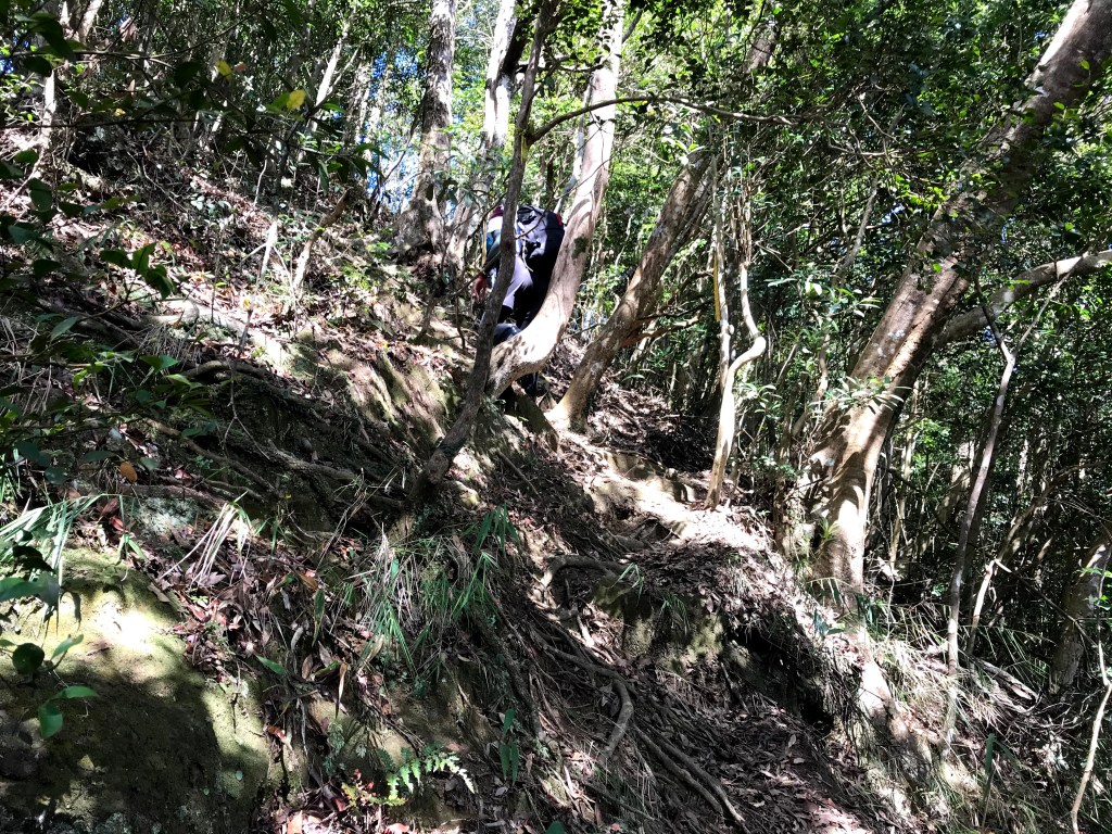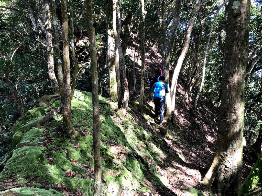 略微休息一下後,開始往福南山走,由仙山到福南山這一段的距離有2.3K,也是今天整天路徑中最原始的一段,一開始就是一路陡下,幾乎都是走在瘦稜上,沿路的路徑上有很多附著苔蘚的岩石,要經過三個假山頭,陡上陡下的角度都很大,但都有繩索輔助,部份的瘦稜邊坡是斷崖型態,行走時要特別小心!中途會經過一處岩壁展望點,而在接近到達福南山前,會出現一處極為陡深的岩壁,經過後即可抵達福南山。
