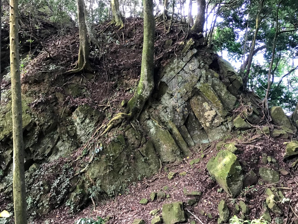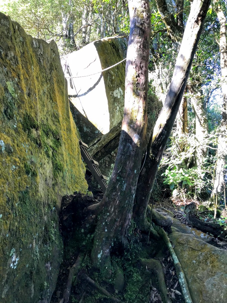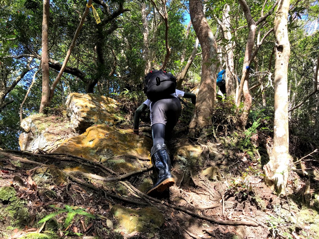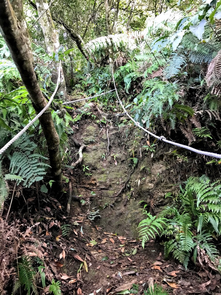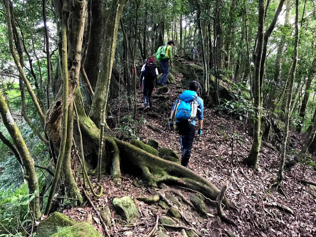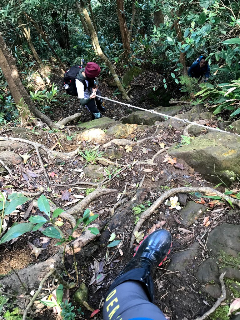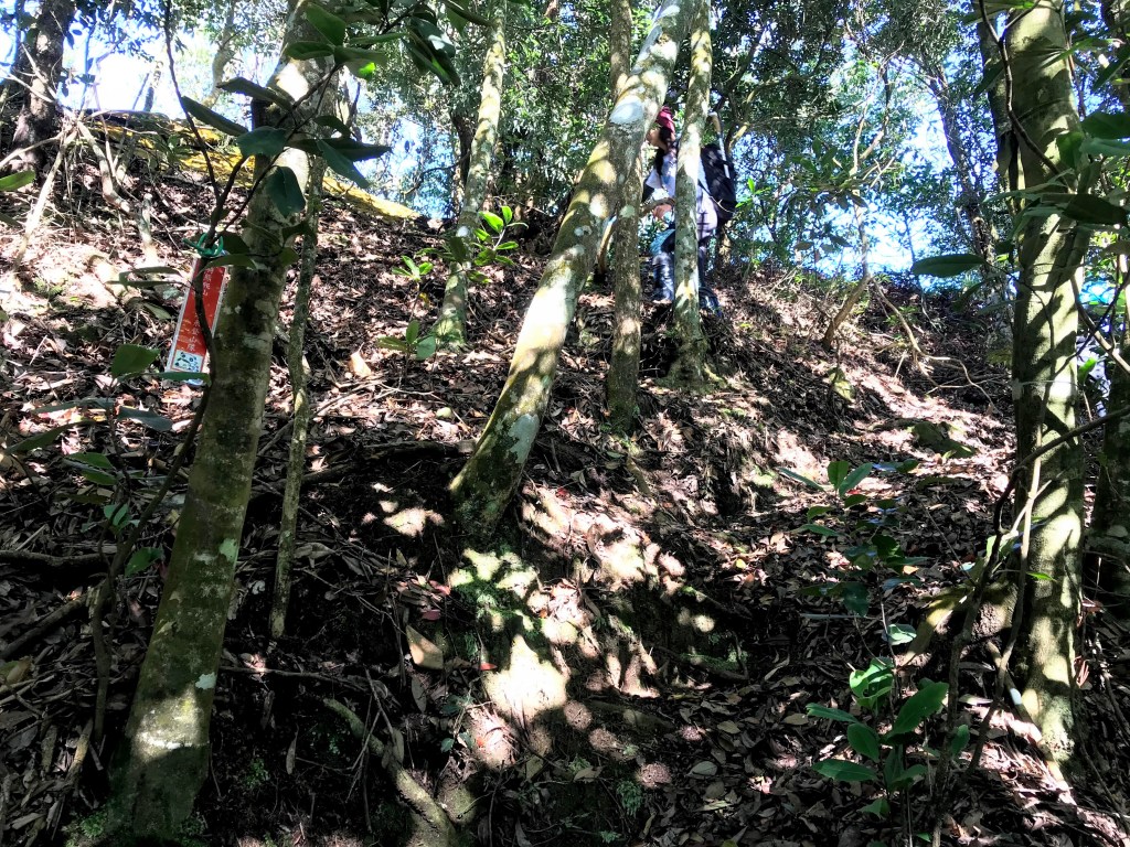 略微休息一下後,開始往福南山走,由仙山到福南山這一段的距離有2.3K,也是今天整天路徑中最原始的一段,一開始就是一路陡下,幾乎都是走在瘦稜上,沿路的路徑上有很多附著苔蘚的岩石,要經過三個假山頭,陡上陡下的角度都很大,但都有繩索輔助,部份的瘦稜邊坡是斷崖型態,行走時要特別小心!中途會經過一處岩壁展望點,而在接近到達福南山前,會出現一處極為陡深的岩壁,經過後即可抵達福南山。