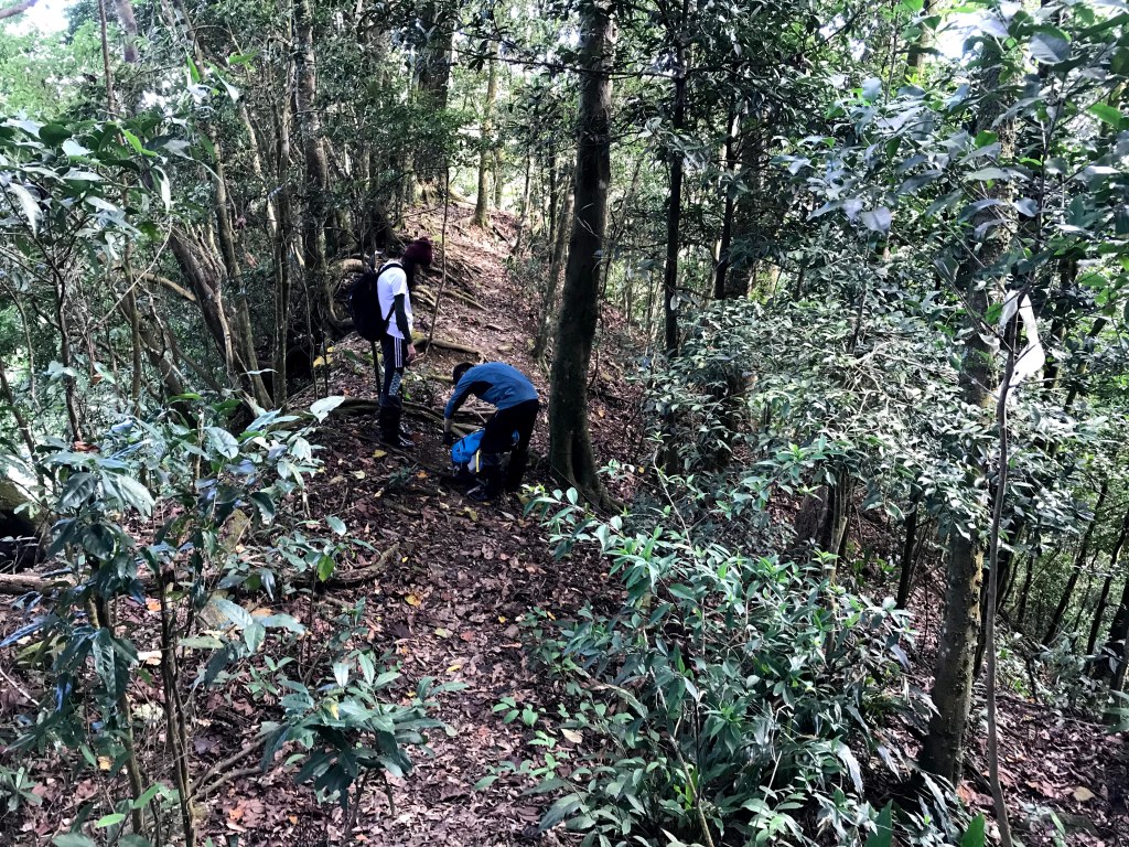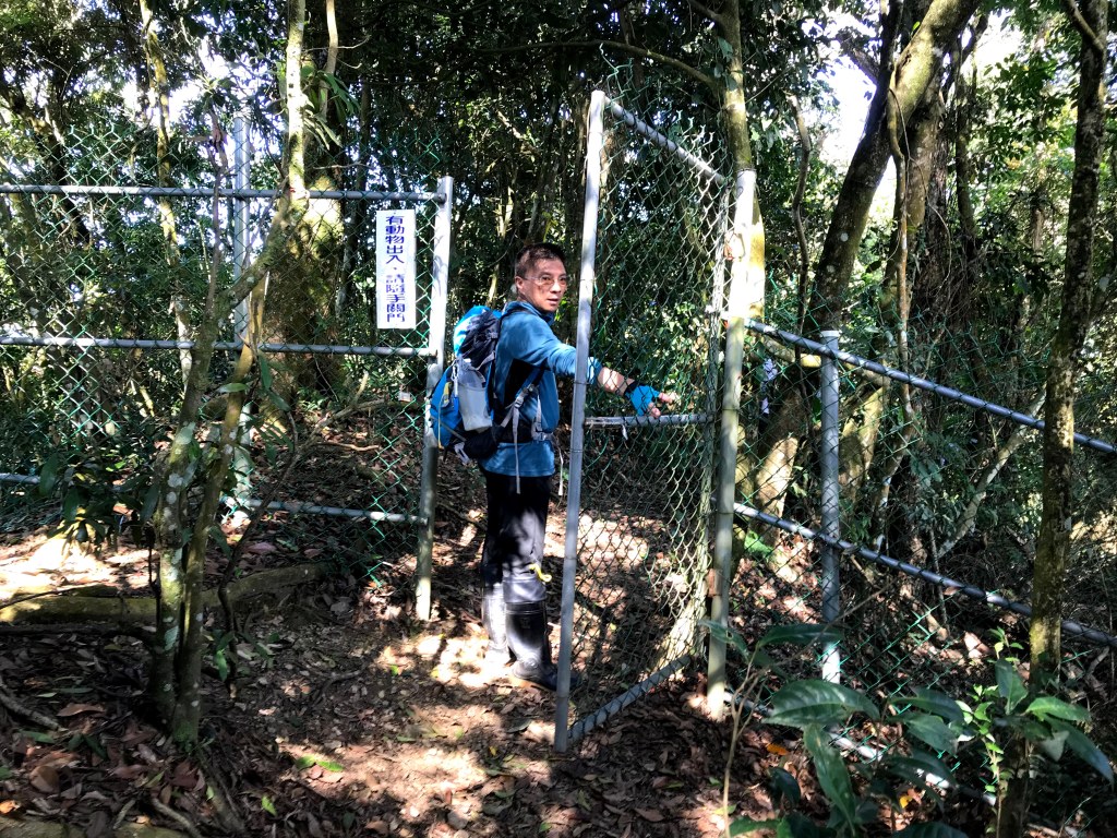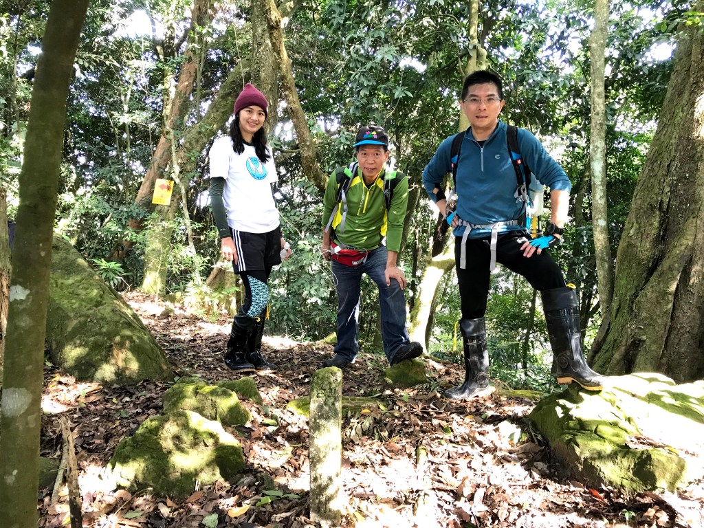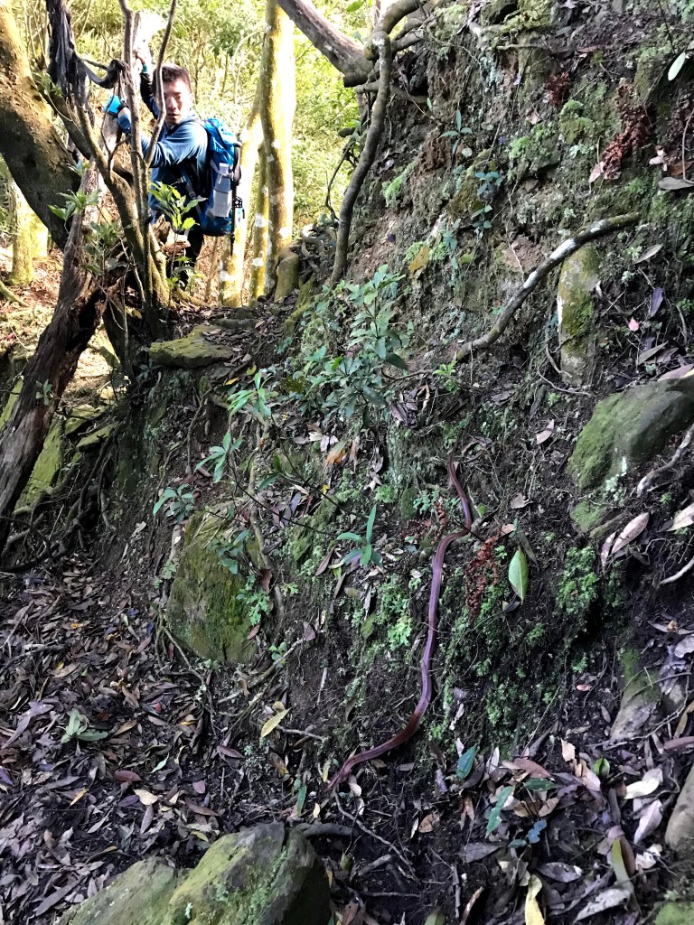 福南山的三角點其實是水源保護區界27水泥樁,此處的腹地不大,兩邊仍然是斷崖型態,抵達時別太靠近兩邊的邊坡。在仙山到福南山之間,楊咩咩在過一段岩壁過程中,沒有注意到應選擇走樹根的這一面而選擇走平滑的那一面,結果造成雙腳一滑被我(Gosen)一手拉住!也嚇了我一跳!由此,我要求楊咩咩不能離我太遠,不然就是要跟緊Peter,避免再選錯路徑而走到有風險的路徑上。在這一段路徑上,也看到了兩條蛇。
