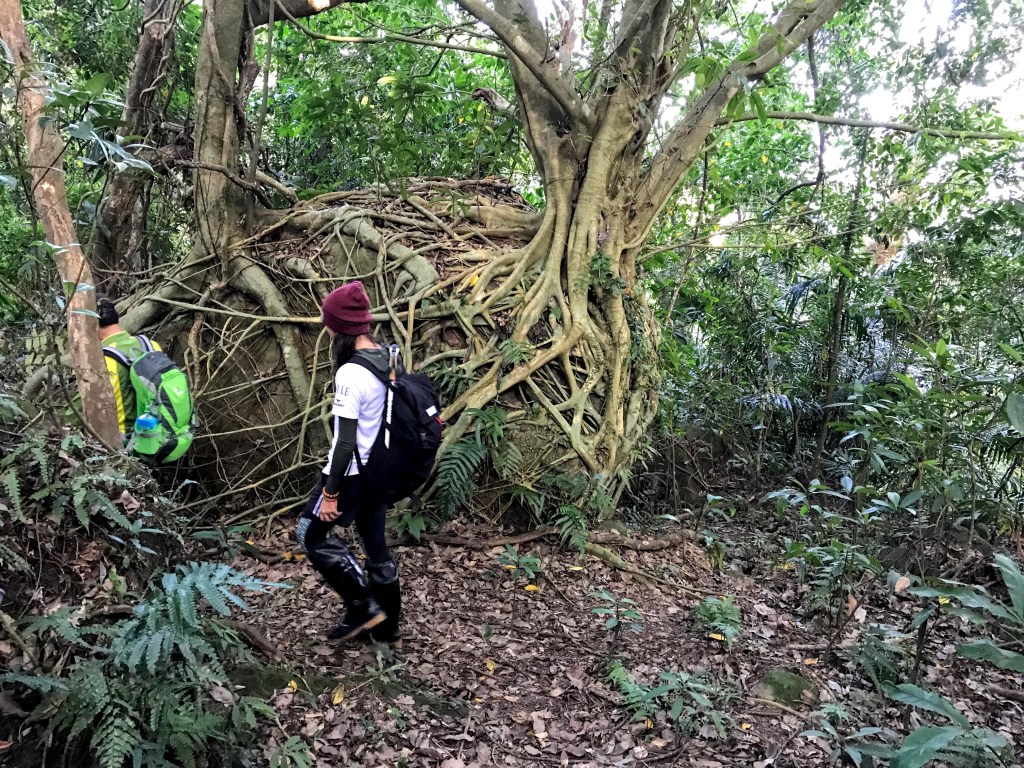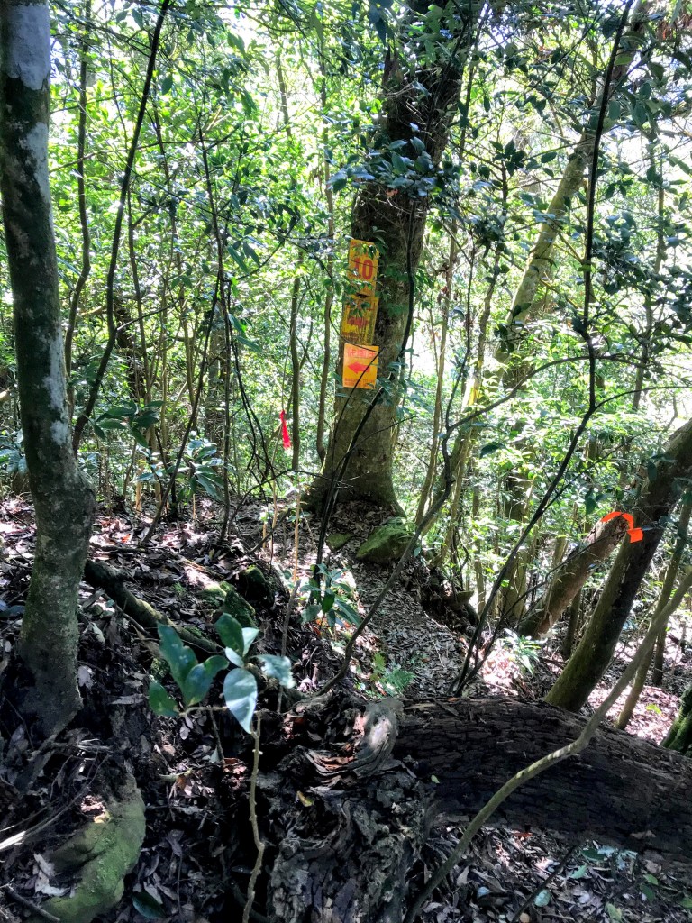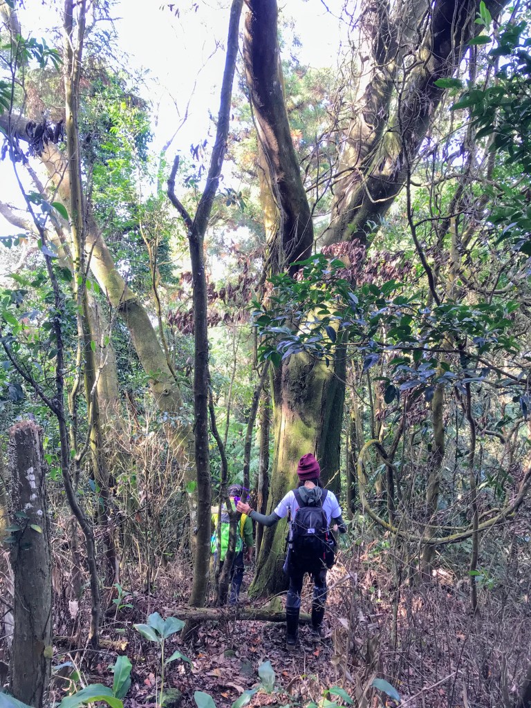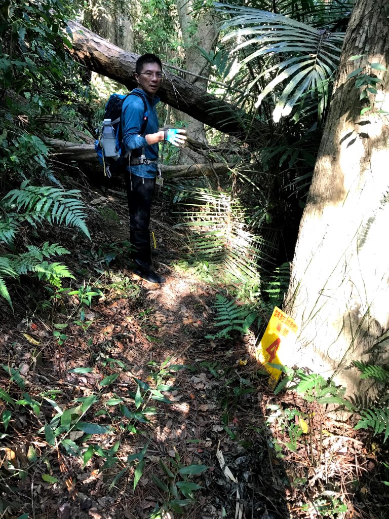 福南山的三角點其實是水源保護區界27水泥樁,此處的腹地不大,兩邊仍然是斷崖型態,抵達時別太靠近兩邊的邊坡。在仙山到福南山之間,楊咩咩在過一段岩壁過程中,沒有注意到應選擇走樹根的這一面而選擇走平滑的那一面,結果造成雙腳一滑被我(Gosen)一手拉住!也嚇了我一跳!由此,我要求楊咩咩不能離我太遠,不然就是要跟緊Peter,避免再選錯路徑而走到有風險的路徑上。在這一段路徑上,也看到了兩條蛇。