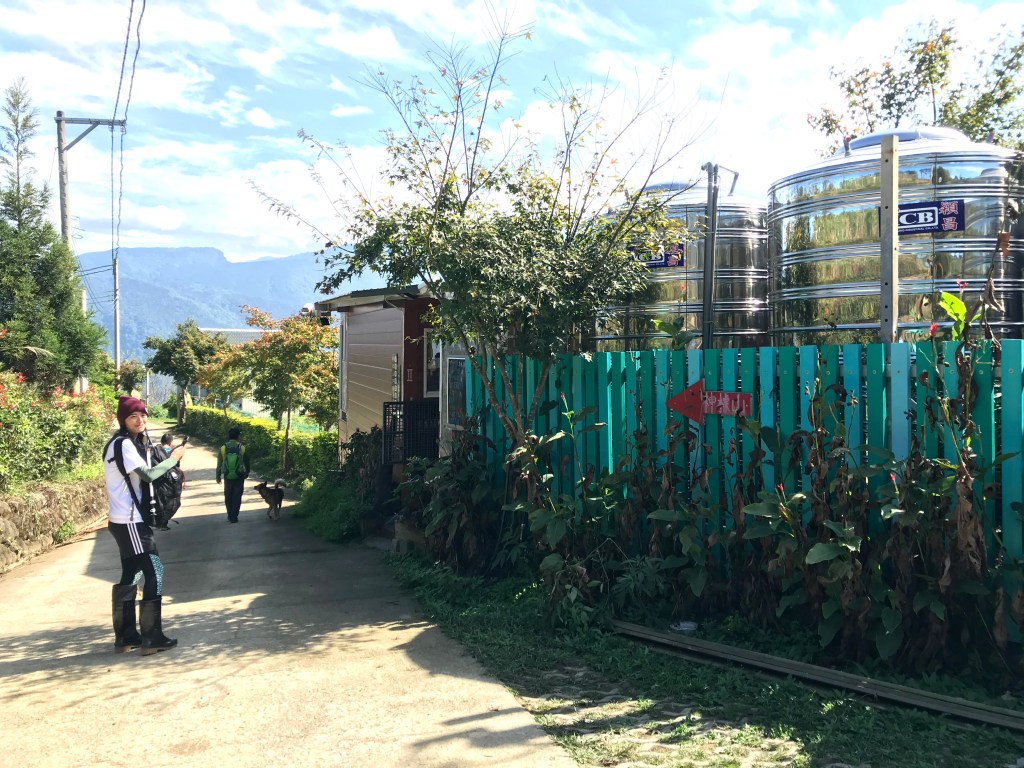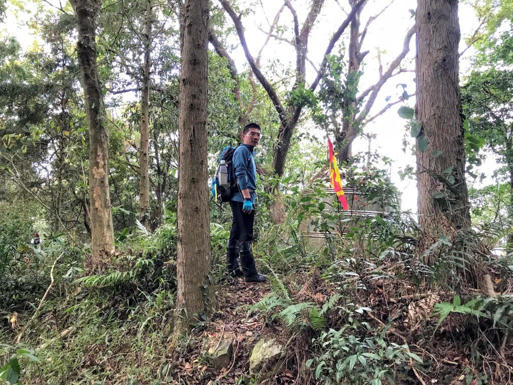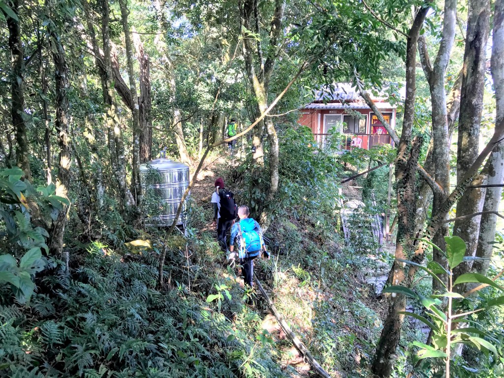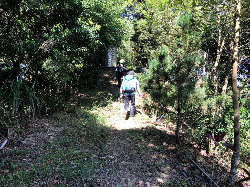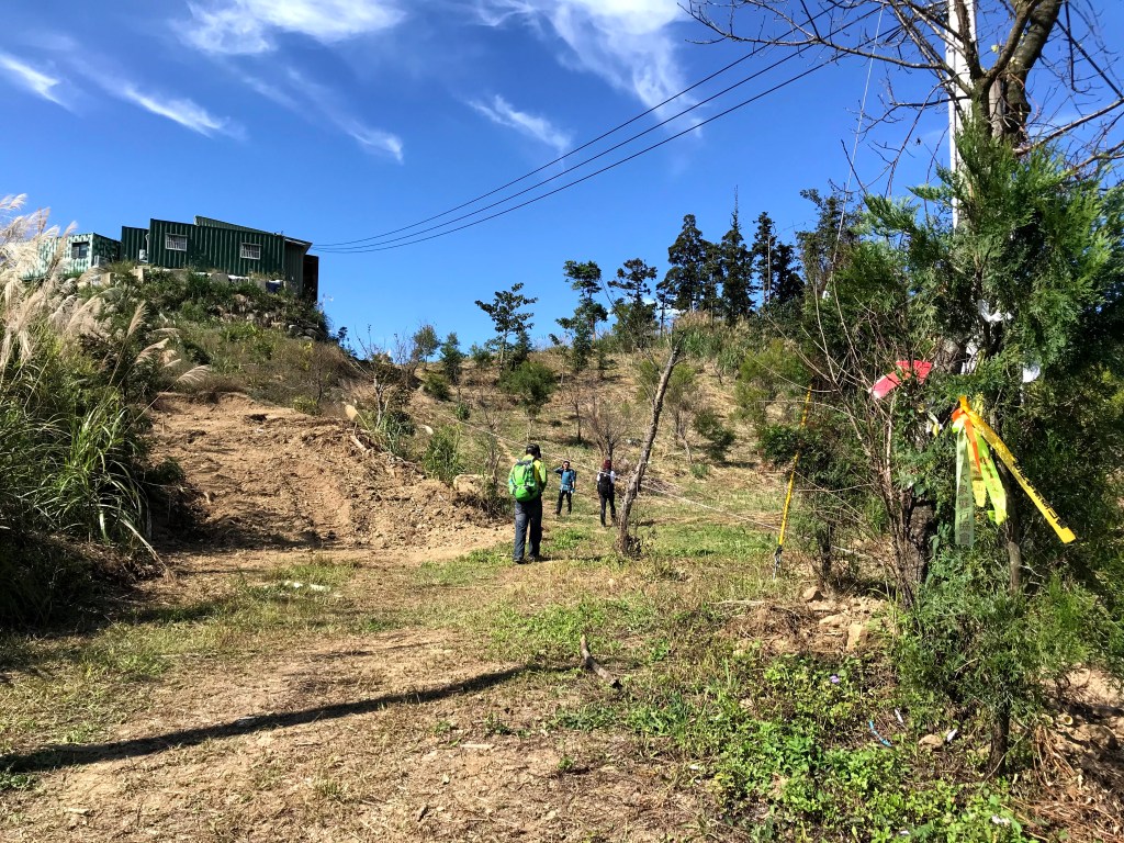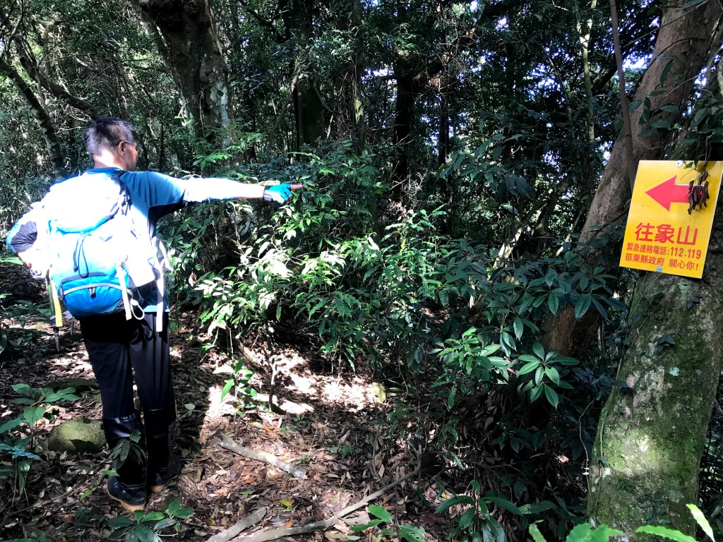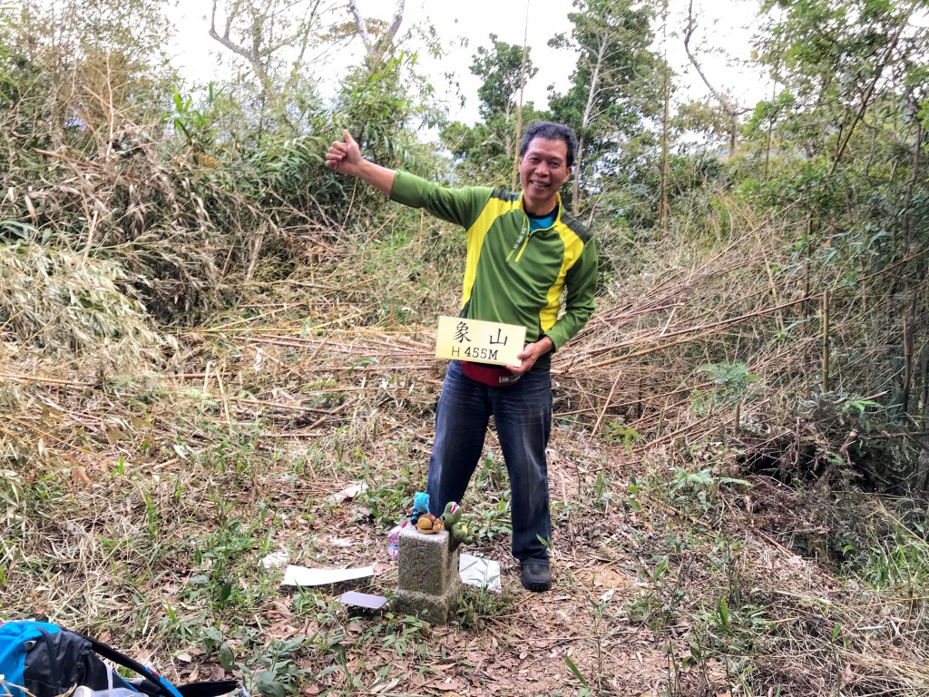 通過大湖嶺後,續走200m會看到東興水庫水源保護區界30水泥樁,接著就是進入人造林沿著泥土路徑一路陡下,此段有繩索輔助,當路徑平緩後,就會持續看到鐵製水桶及農舍,再來陡上一小段即達今天的第十峰:象山。此時要下山有兩個選擇,一是繼續往前走600m接回產業道路的土地公廟,或者是往回走一小段在穿越私人農家接上產業道路,這兩種走法都會在土地公廟會合。我們選擇後者,往回走穿越私人農家接上產業道路,由於Peter總是提早動身,所以當我們往回走時,Peter與楊咩咩已經跟農家男主人聊了一會功夫的天了!