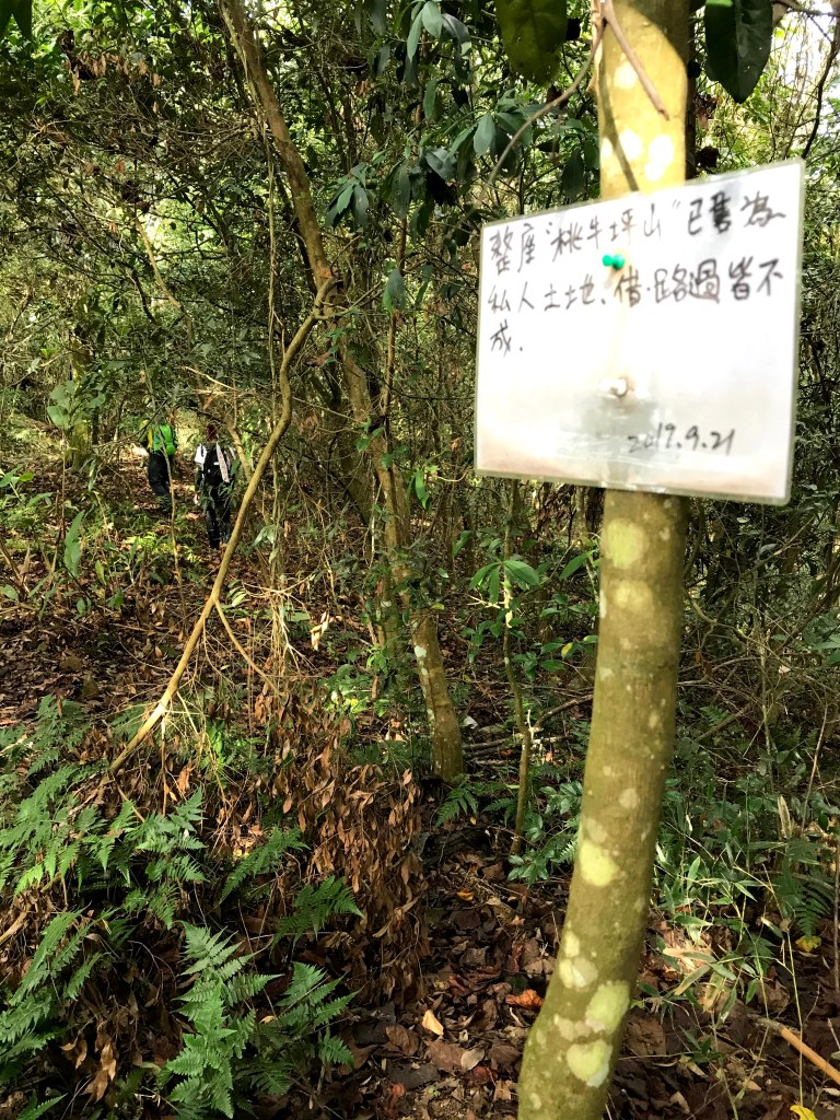 接著,由福南山往崩山走,這一段的距離為0.7K,仍然延續之前的路徑型態,但就是一路陡下,約20分鐘後就抵達。拍完照後,接著往桃牛坪山走,先陡下再陡上到800峰(自己取名的),再陡下並再陡上至750峰,接著拉繩陡下岩壁後就接上人造林區,繼續往前一段就會看到造林租界三角點,此時會看到一個大大的木製招牌,如同下面的照片所示,這表示我們要脫離「原始」開始進入「文明」,亦即開始要進入幾乎都是私人土地的路徑上。