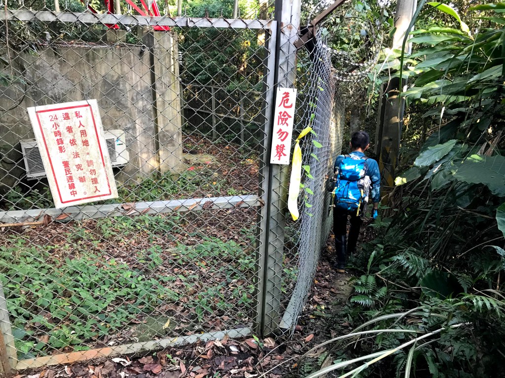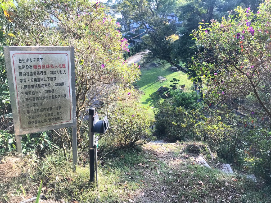 接著,繼續往象山方向走,路徑大多都是平緩好走且海拔逐漸下降的路徑,經過685峰(沒有名牌,自行比對等高線圖來看)後,再緩下一段抵東興水庫水源保護區界28水泥樁,接著拉繩陡上一段可到大屋坑山,這是今天的第七峰。沿著路徑繼續前進,會看到不少的造林租界碑,兩個假山頭後,開始進入廢棄的景觀步道,有一個指示牌寫著「←啞嗎頂古道出口200M/台視轉播台就只900M→」而前方就是高壓電塔,沿著鐵絲往右側路徑繞過,再來就會經過東興水庫水源保護區界29水泥樁,再來就進入「嶺秀登峰私人社區」,就會看到今天的第八峰:細湖頂山。