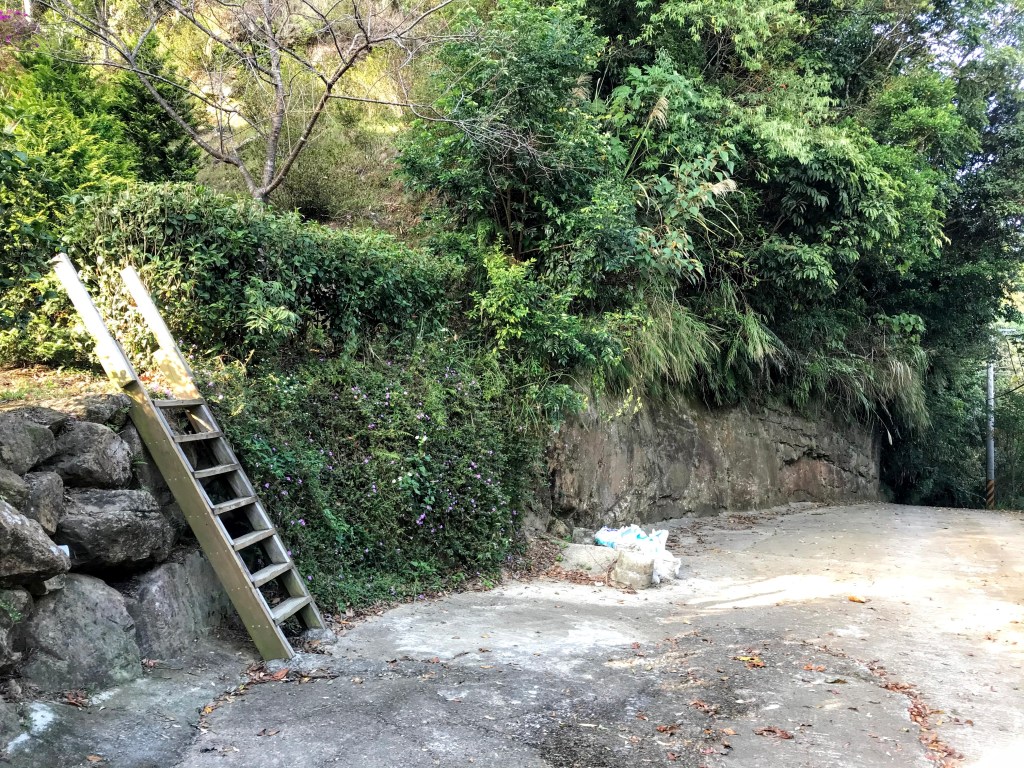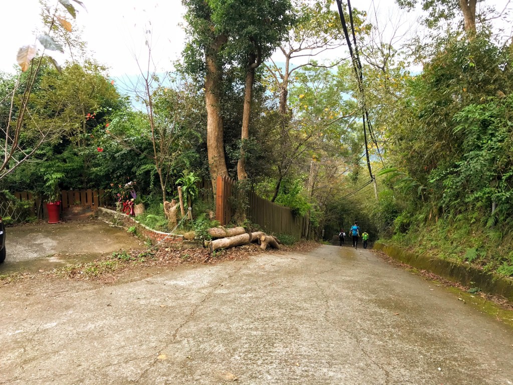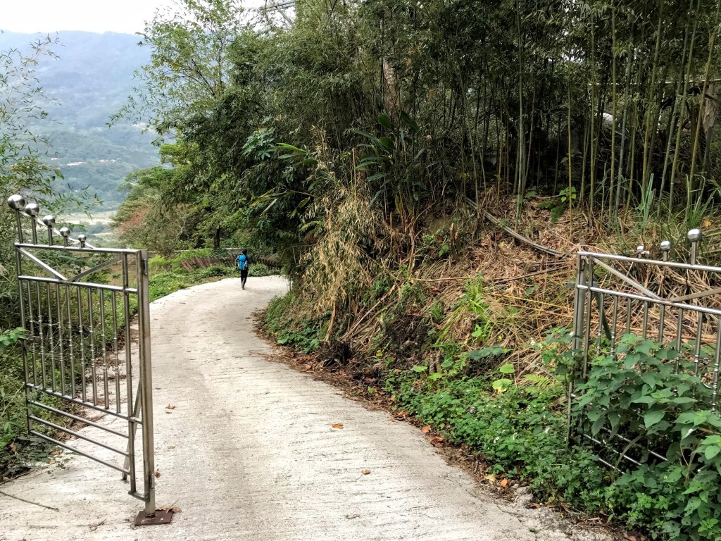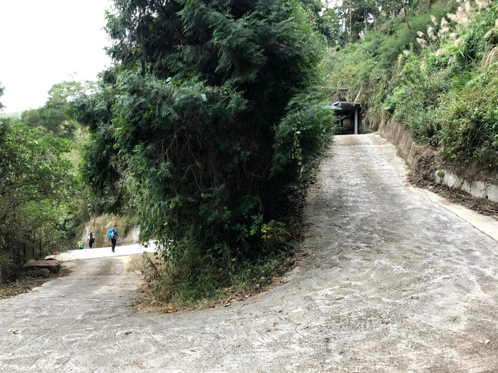 過了細湖頂山後100m即接上水泥的產業道路,往前走200m後看到左側有一個小鐵梯,就由小鐵梯而上,在此我們都沒有注意到,沿著水泥產業道路多走了50m才意識到好像過頭了,再回頭回到小鐵梯左上。在這一小段路徑上,可以看到兩側的漂亮房屋及優美草坪,但因為是私人土地,我們就沿著仙神象步道路徑走就是。由小鐵梯上來後走約400m即可到達今天的第九峰:大湖嶺,此處沒有三角點。