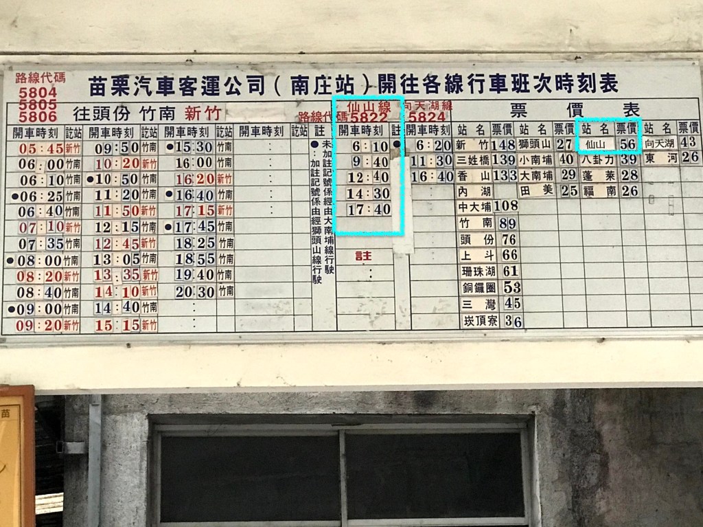 因為我們是打算走回南庄後,再搭客運回到靈洞宮,因此朋友們要注意客運的車次,其班次並不是很多,由下面的照片就可以知道,5822仙山線下午就只有14:30及17:40兩班次可回到仙山。如果朋友們走到神棹山後覺得會來不及趕上最後一班,可以回走到等高線圖上所標註的撤退路線直接沿著產業道路回到南庄,這樣就是神仙縱走的路線了。