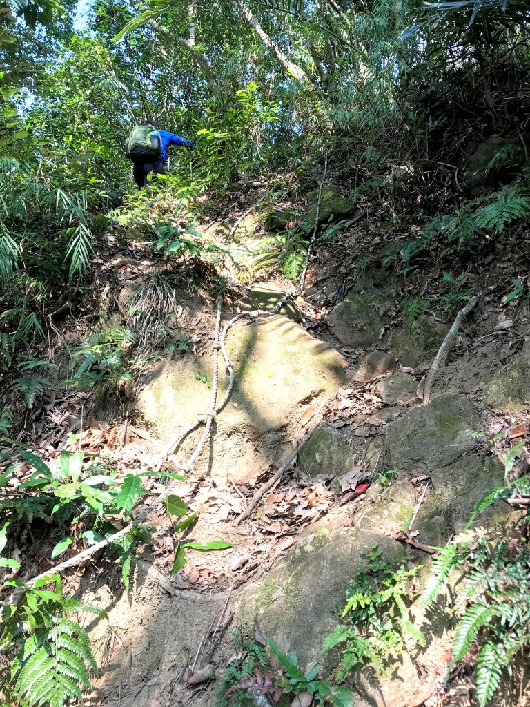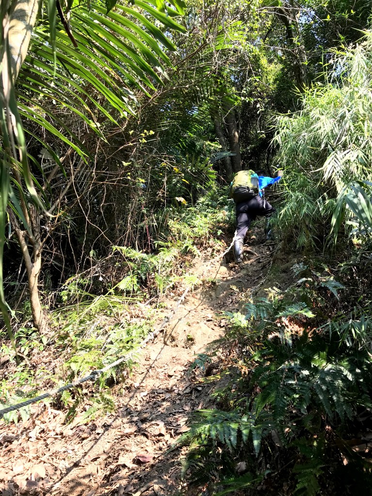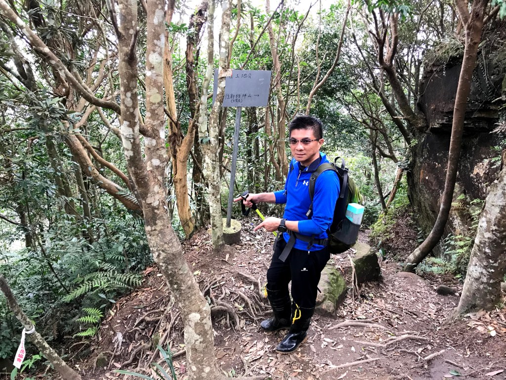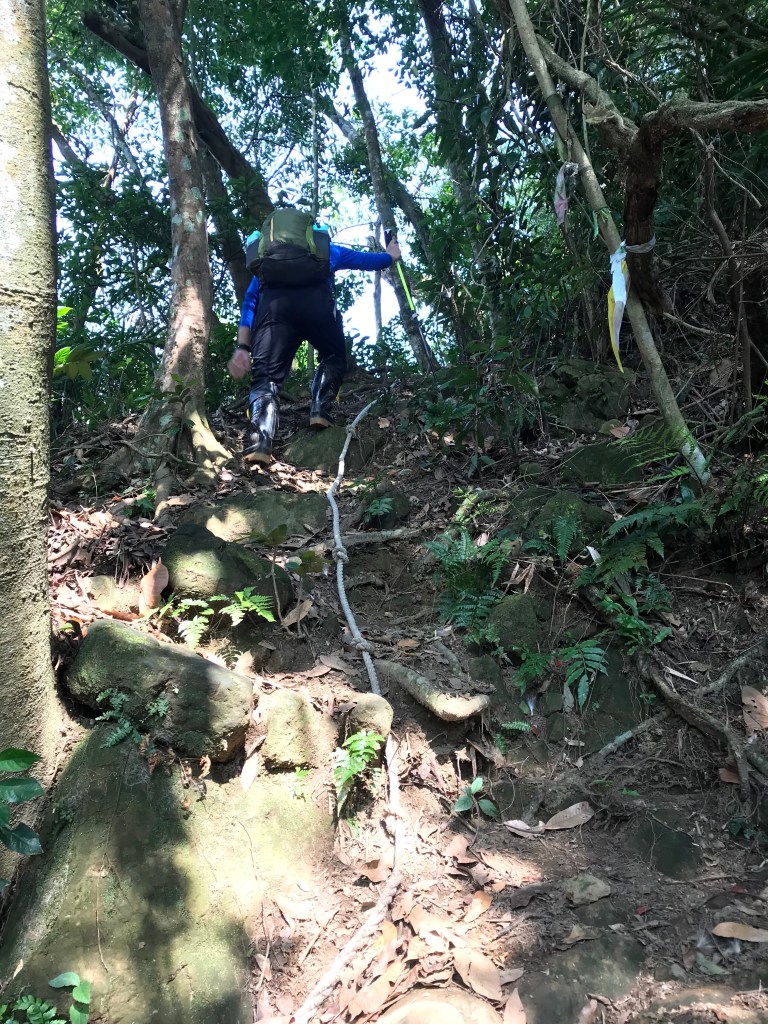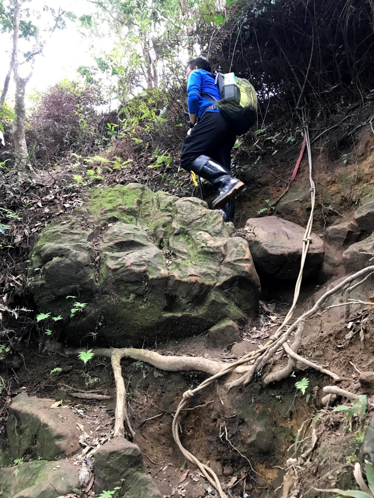 我們將汽車停在統一馬武督渡假中心停車場(按文字即可進入Google地圖),約在台118線羅馬公路33.7km左右,起登後開始往33.5km路標方向走,約走300m後會過錦山一號橋,即可看到前往高甫山及彩和山的路口(約在118縣道33.4K處)。路牌上寫的是「雞竇山」與「彩和山步道」,一進入步道就是一路拉繩陡上,且陡上的坡度斜率頗大,要從H220m爬升至H500m,過了三個假山頭後陡下一段,再往上即可到達高甫山(10:51,總行程第1.8km)。這一段陡上,應該是今天最辛苦的一段了。
