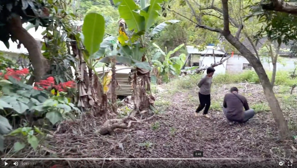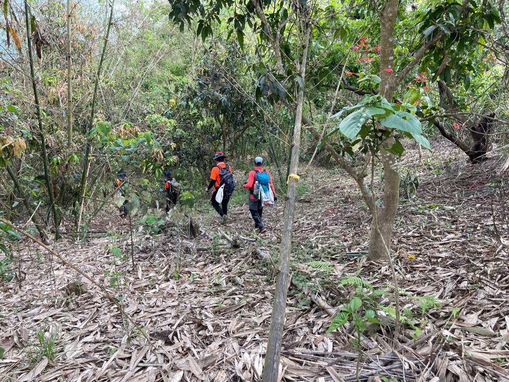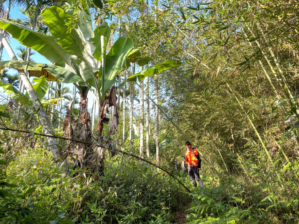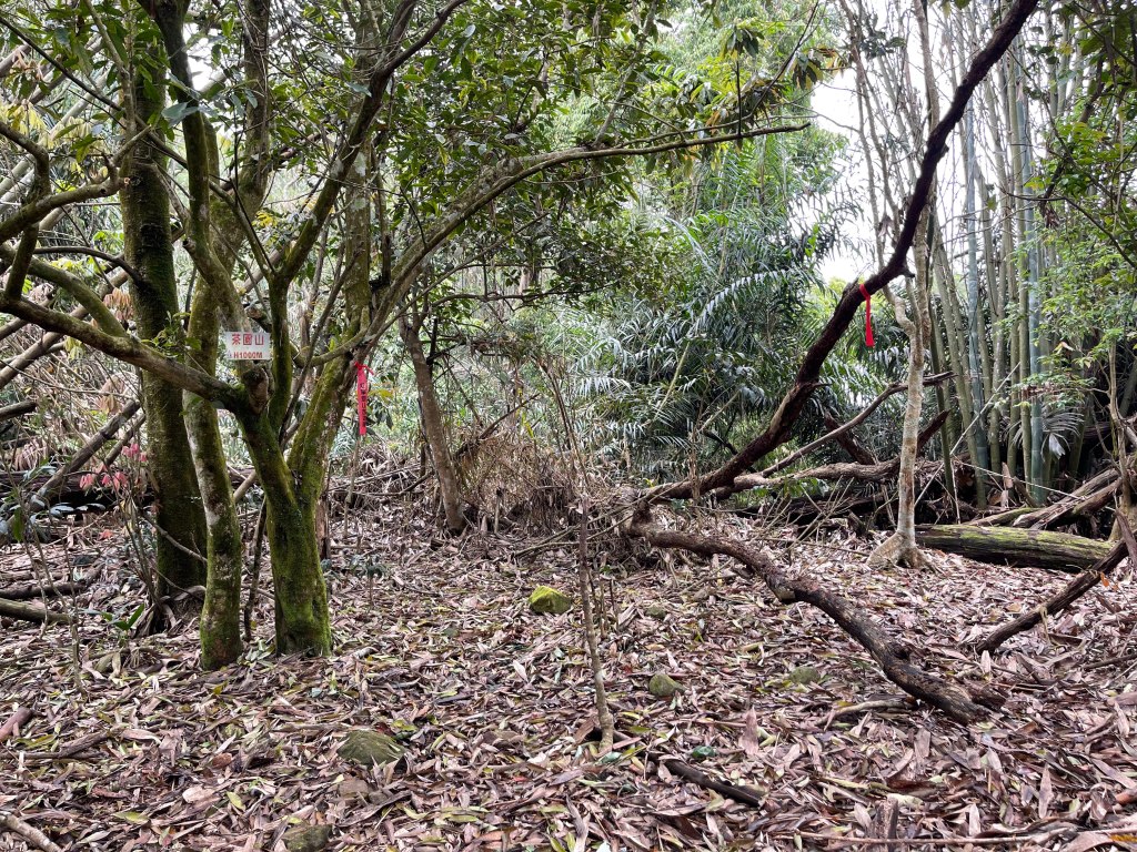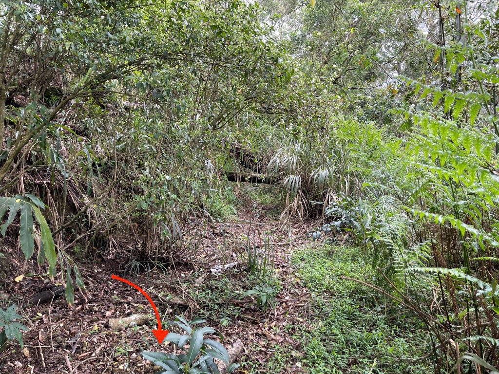 過了茶園山後,直接進入陡下邊坡,有一小段的左側邊坡是危崖型態,經過後就進入兩側邊坡皆頗深的瘦稜,就在這一段比較危險的路段,兩側的黃藤也多到嚇人!再來下到鞍部會看到「跌死馬崁土地公廟」,但裡面的土地公都被請走了。過了跌死馬崁土地公廟後就是一小段的拉繩陡上左側邊坡路徑,接著就會進入梅園區,恰好今天有一家人在此採梅子,繼續往前走到鐵皮屋民宅就要往右轉進產業道路,產業道路走200m緩上後,會看到路邊左側有路標寫著往天池,還有路標寫著往李子園,這個寫著往李子園的路標是指會下山往李子園而不是去李子園山喔!所以,我們要離開產業道路進入山徑往天池方向走,也就是往二凍山方向走。