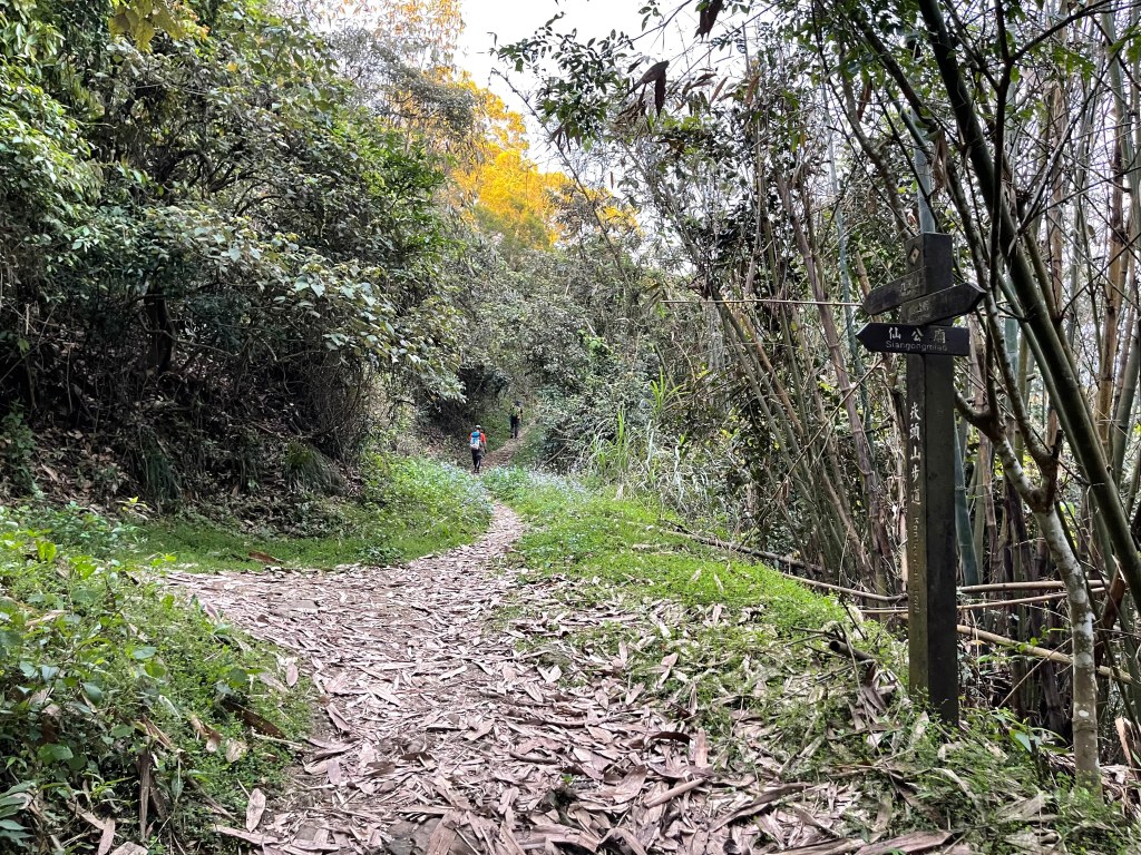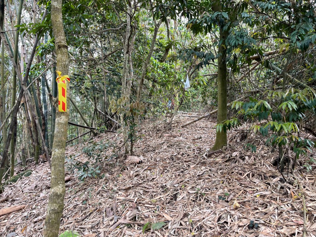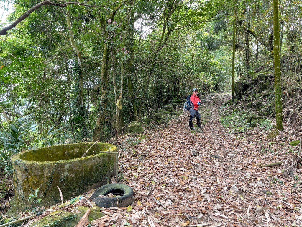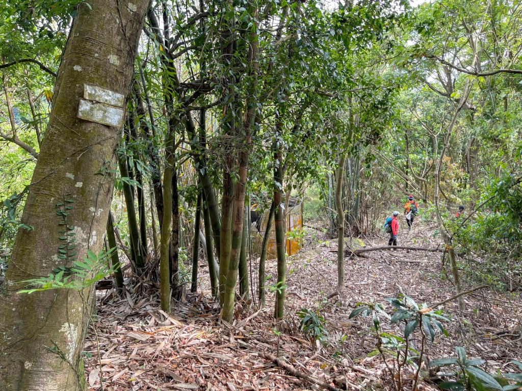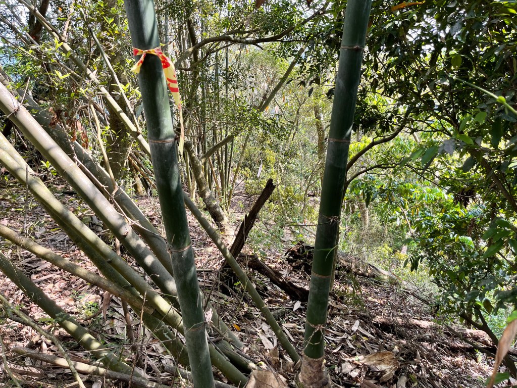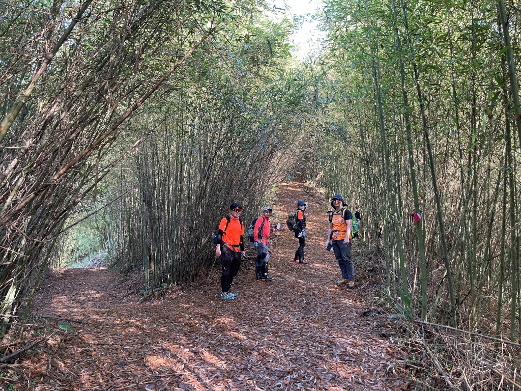 過了截彎取直段後,持續下坡陡下,但路徑就開始變得比較好走了,會經過鐵製水桶,接著會看到煮筍工寮,到此工寮後直接右轉接上林道路徑,接著會接上梅園就會抵達竹崙山,今天的第十一峰,但是竹崙山座落在私人梅園內,目前已經不方便去攻頂,因此我們五人就在梅園內拍照表示來過了!由截彎取直處到竹崙山的距離為1.2K。