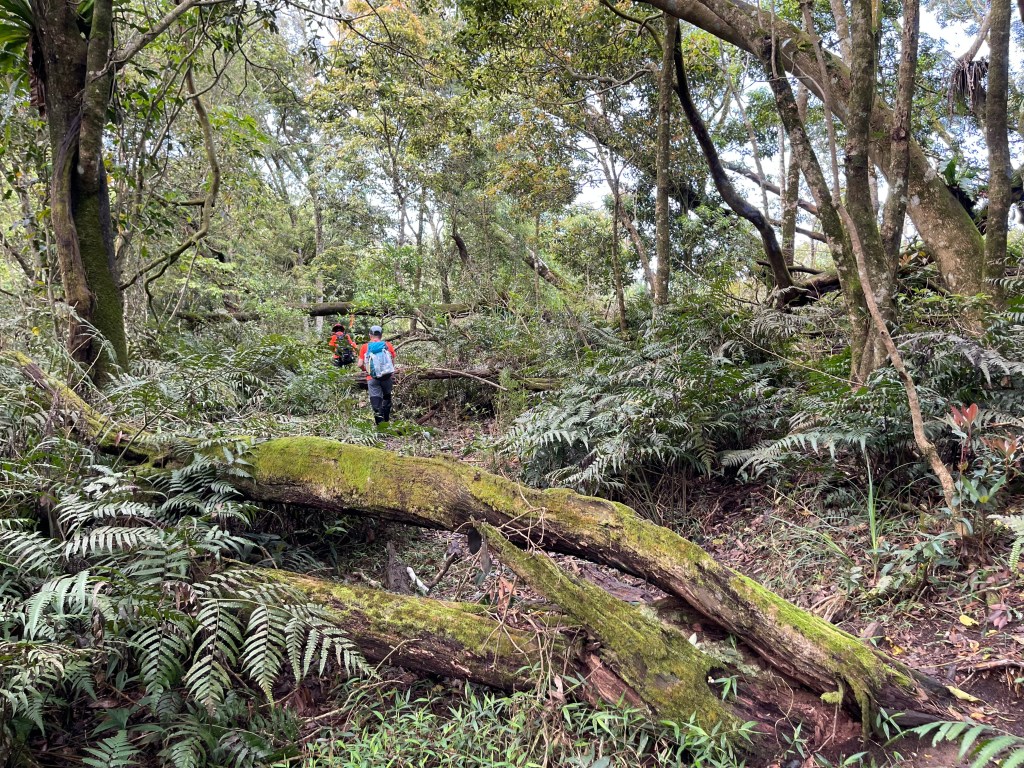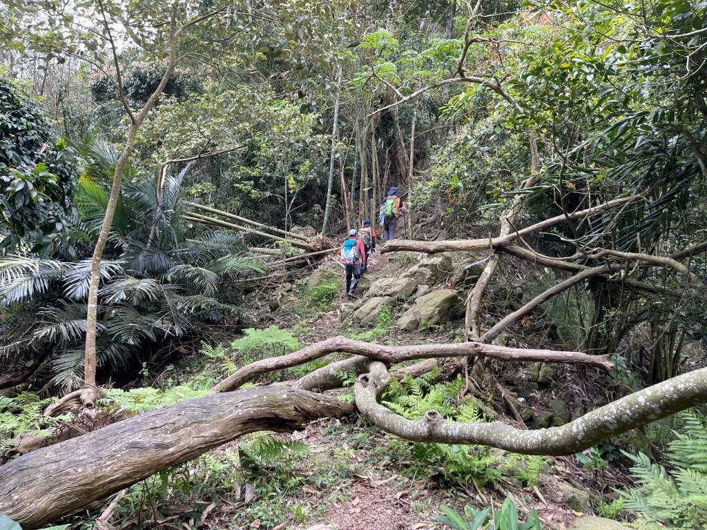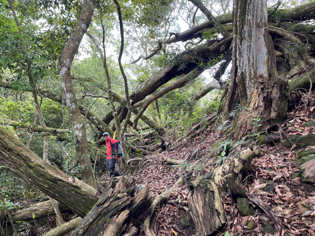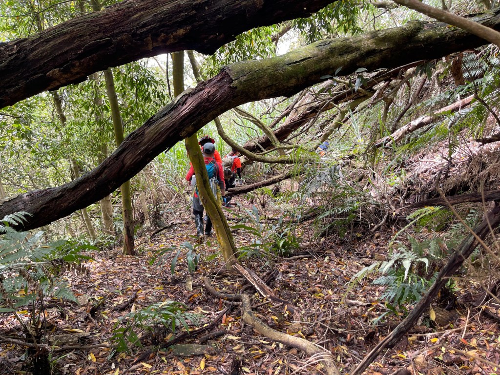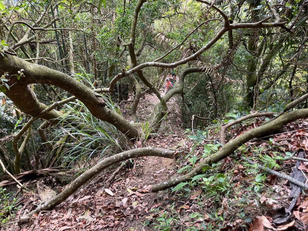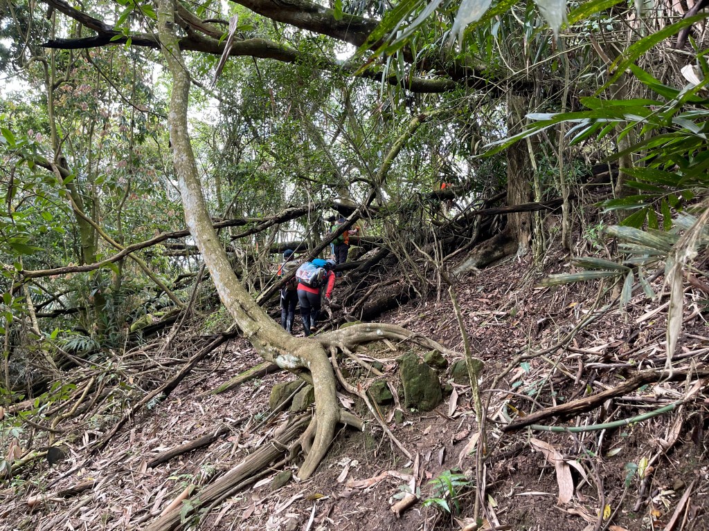 接著要走1K的距離才能今天的第五峰:茶園山。這1K的過程,一開始就是直接拉繩且極滑的陡下,一般我們爬登山步道,如果遇到極陡下,除了拉繩就是利用兩側的樹木來支持,但是這一段的陡下過程中,兩側有很多刺人且大量的黃藤,不能隨便想扶樹幹或拉草莖,一不小心就會讓你刺傷!陡下後接著鞍部再接上稜線路,但沿路倒木仍然沒有少過,其實就是一段「阿雜」的路段。
