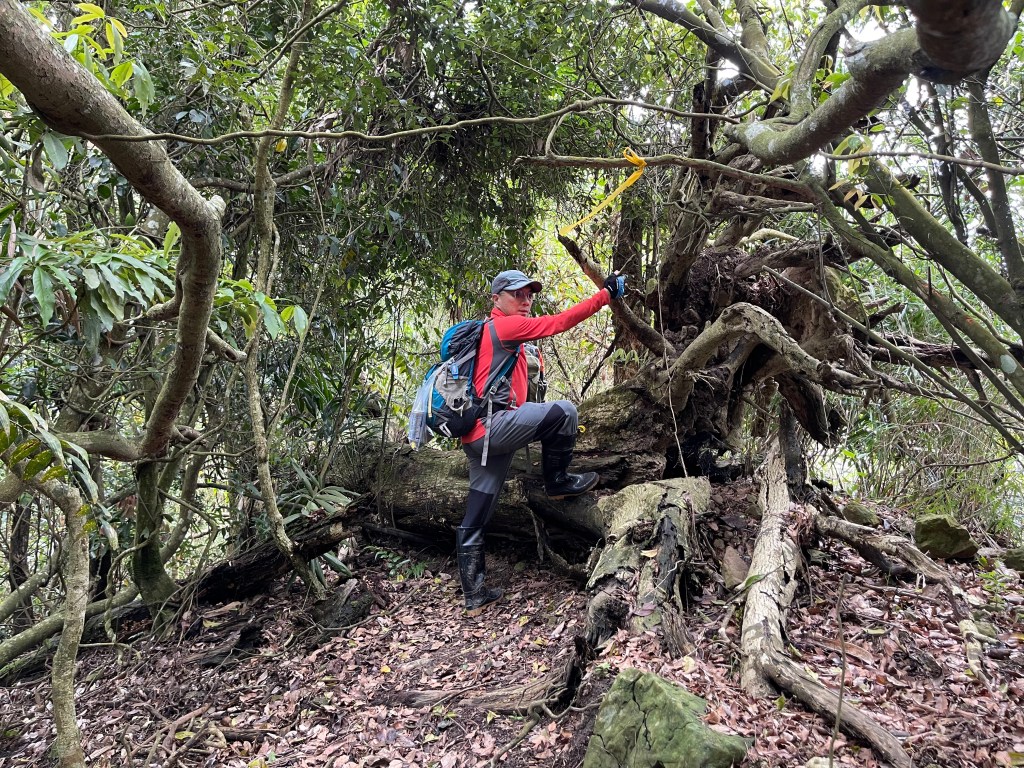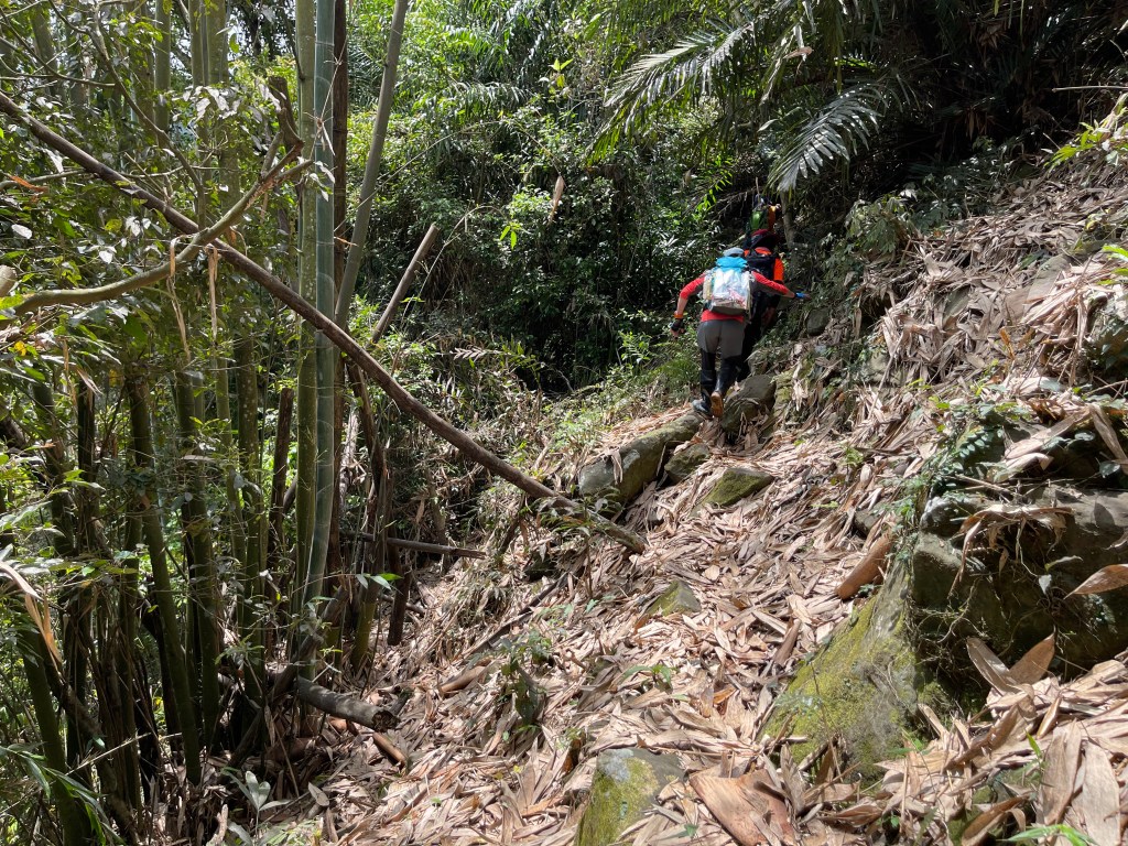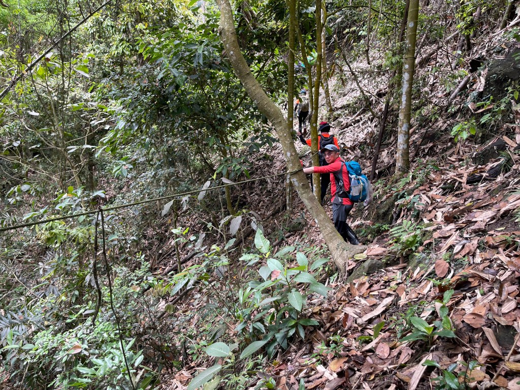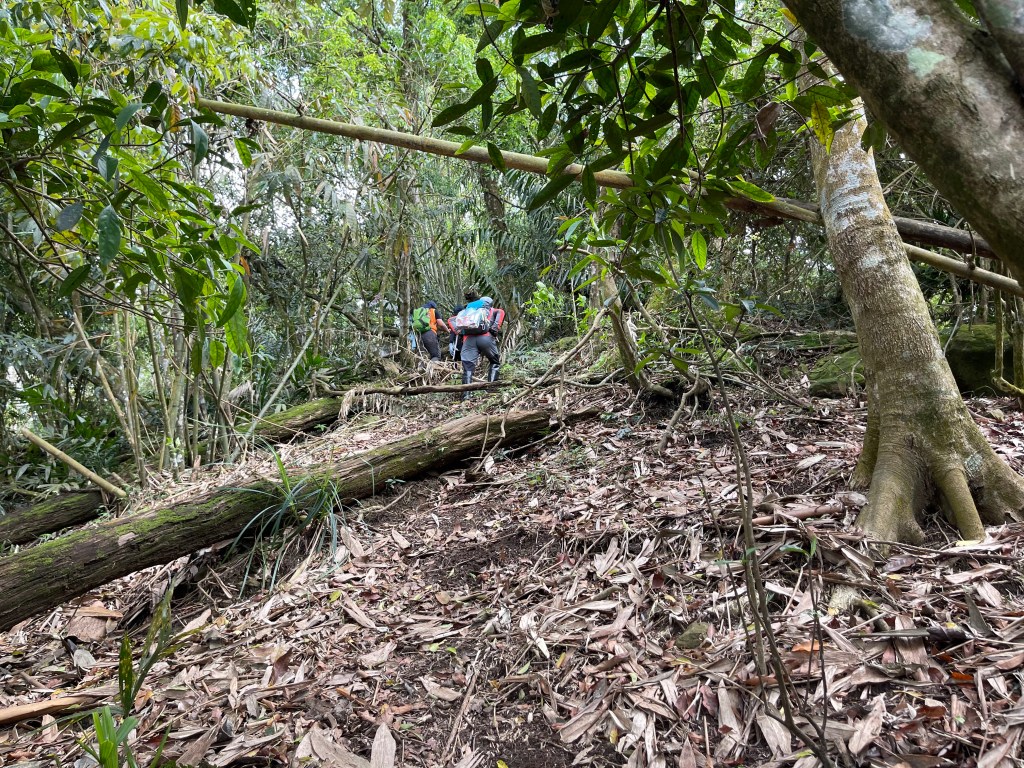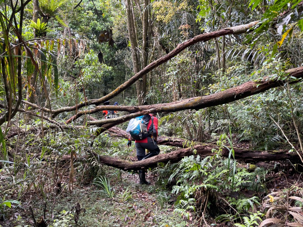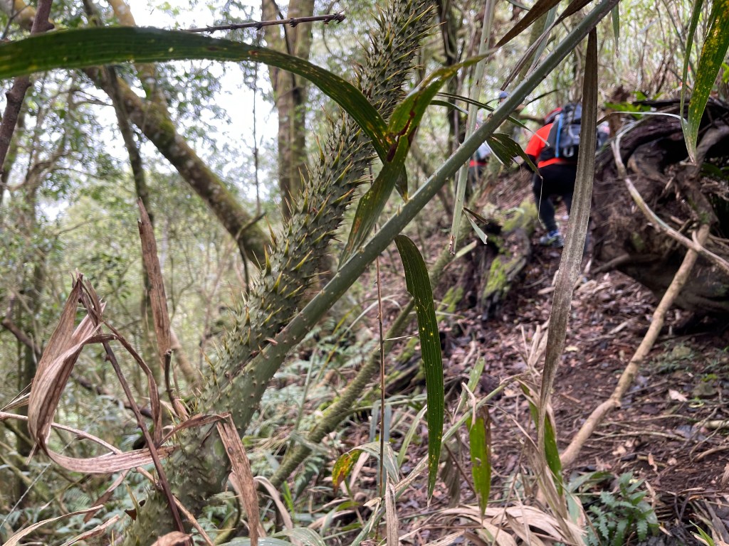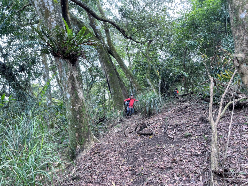 接著要走1K的距離才能今天的第五峰:茶園山。這1K的過程,一開始就是直接拉繩且極滑的陡下,一般我們爬登山步道,如果遇到極陡下,除了拉繩就是利用兩側的樹木來支持,但是這一段的陡下過程中,兩側有很多刺人且大量的黃藤,不能隨便想扶樹幹或拉草莖,一不小心就會讓你刺傷!陡下後接著鞍部再接上稜線路,但沿路倒木仍然沒有少過,其實就是一段「阿雜」的路段。