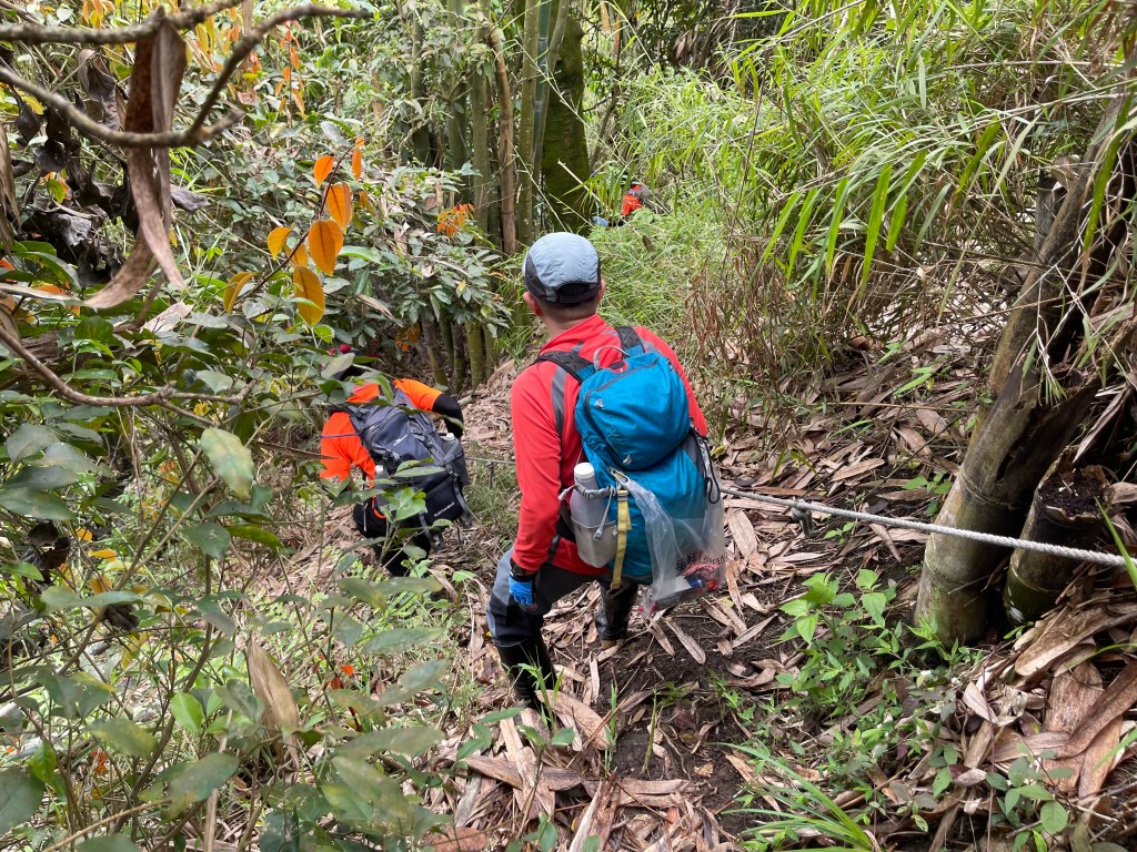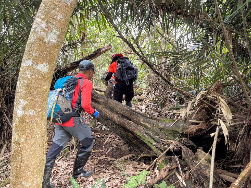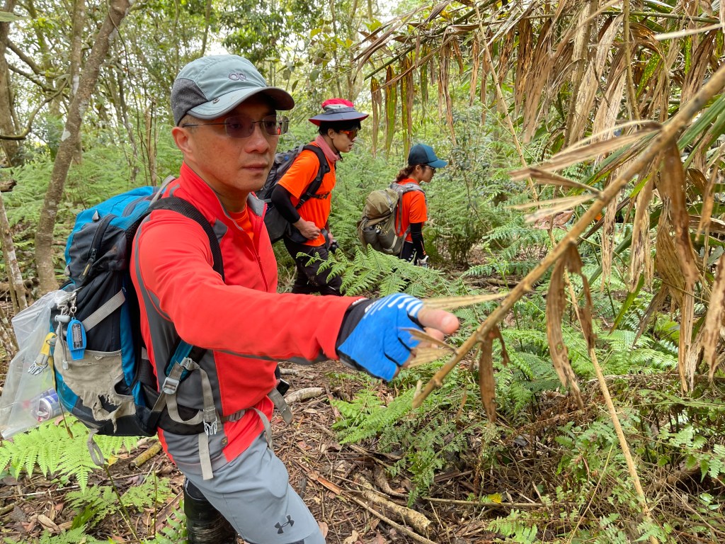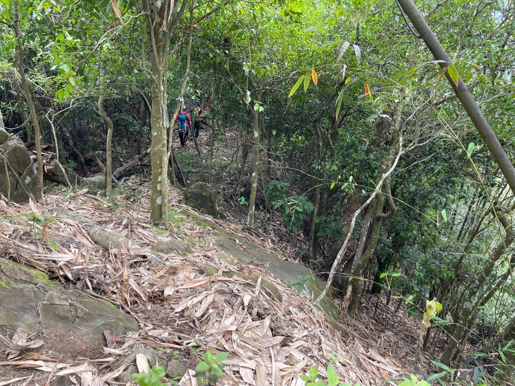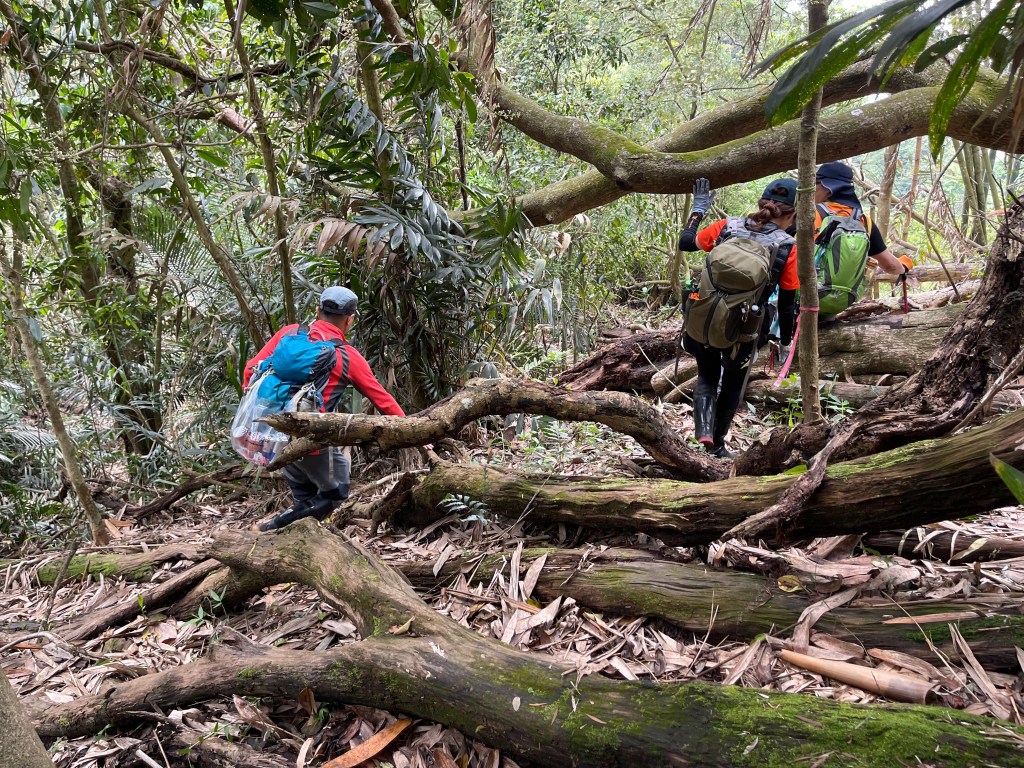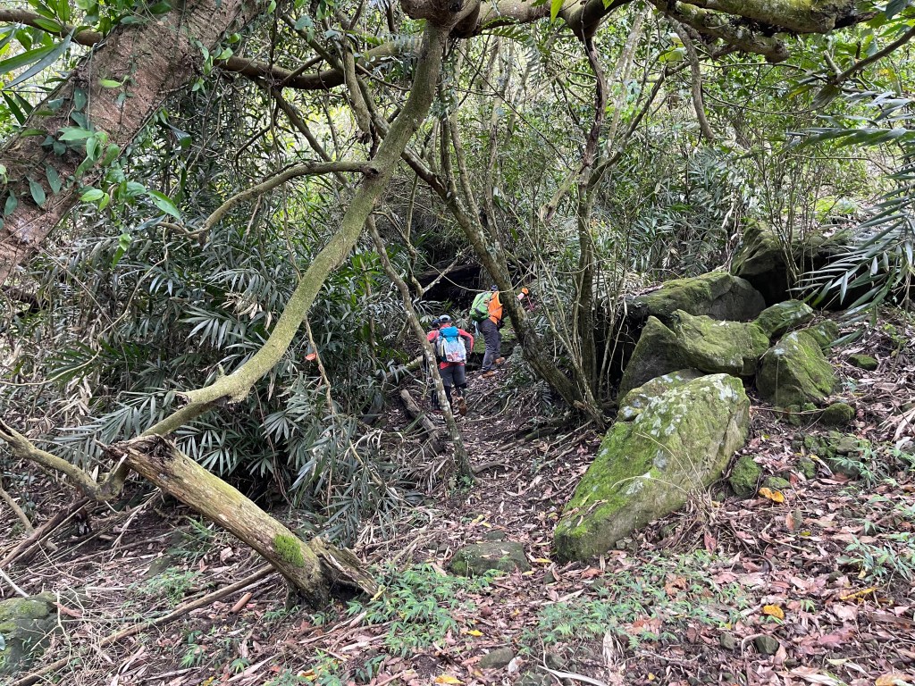 接著要走1K的距離才能今天的第五峰:茶園山。這1K的過程,一開始就是直接拉繩且極滑的陡下,一般我們爬登山步道,如果遇到極陡下,除了拉繩就是利用兩側的樹木來支持,但是這一段的陡下過程中,兩側有很多刺人且大量的黃藤,不能隨便想扶樹幹或拉草莖,一不小心就會讓你刺傷!陡下後接著鞍部再接上稜線路,但沿路倒木仍然沒有少過,其實就是一段「阿雜」的路段。