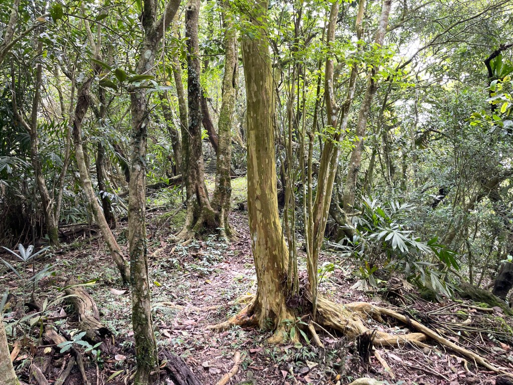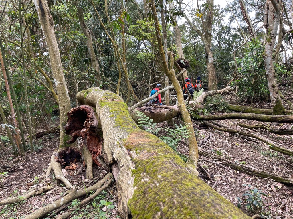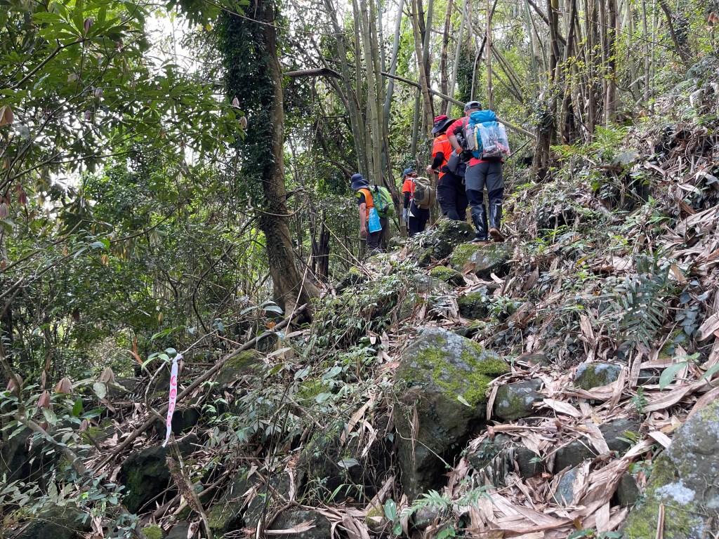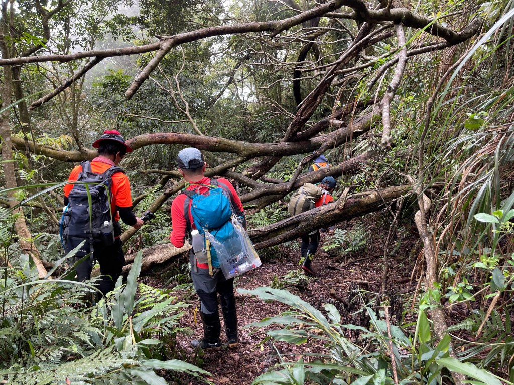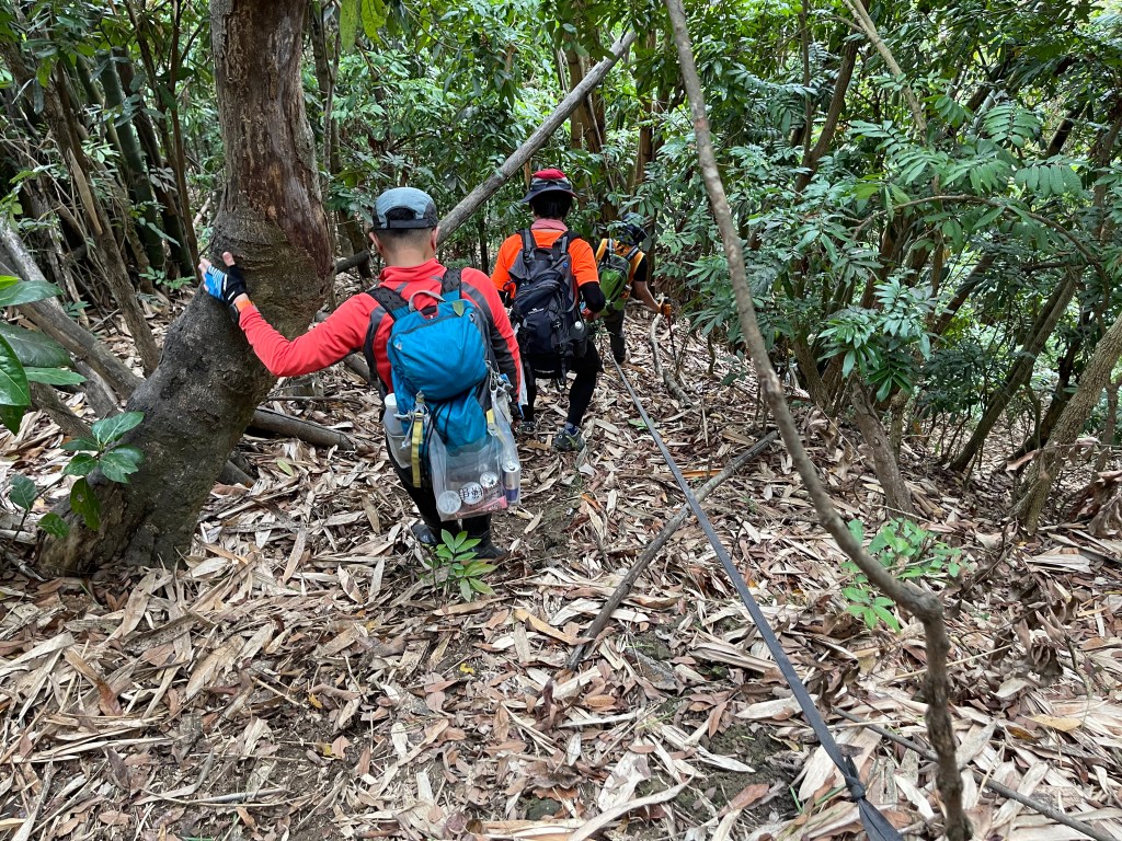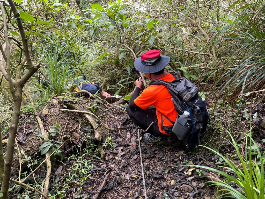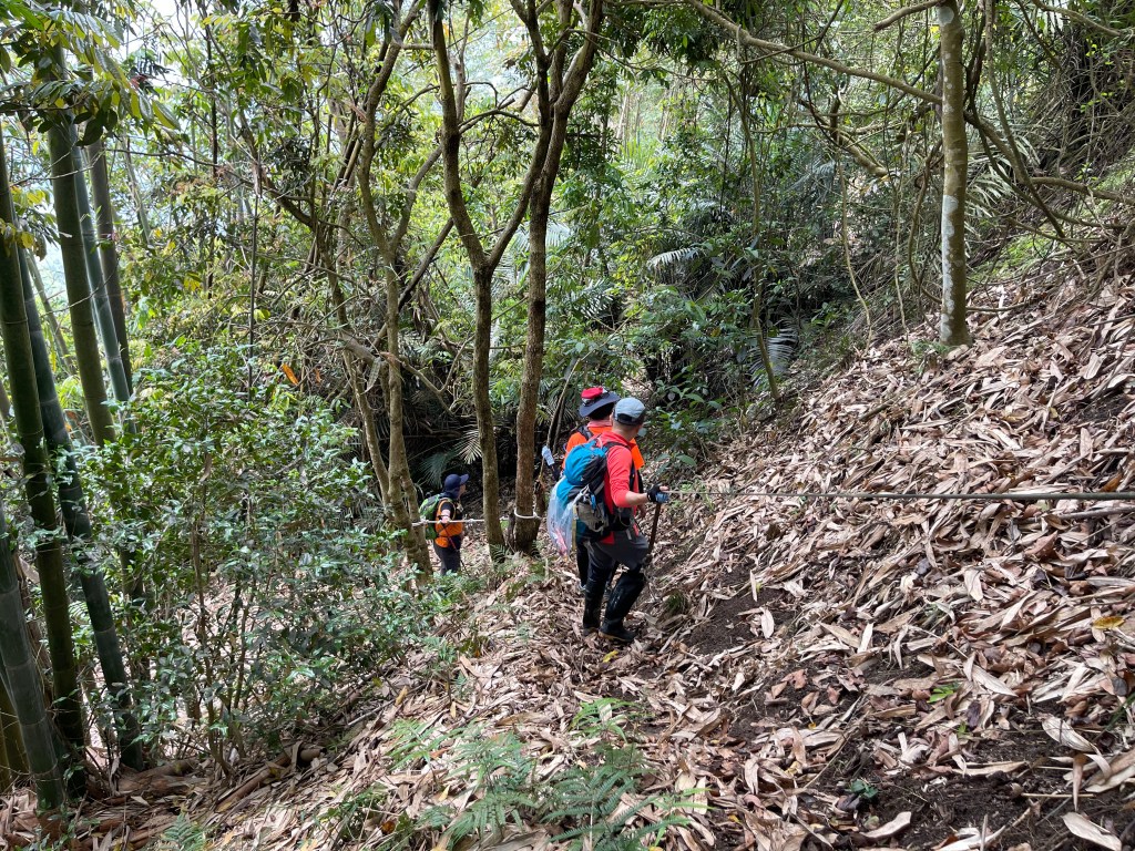 接著要走1K的距離才能今天的第五峰:茶園山。這1K的過程,一開始就是直接拉繩且極滑的陡下,一般我們爬登山步道,如果遇到極陡下,除了拉繩就是利用兩側的樹木來支持,但是這一段的陡下過程中,兩側有很多刺人且大量的黃藤,不能隨便想扶樹幹或拉草莖,一不小心就會讓你刺傷!陡下後接著鞍部再接上稜線路,但沿路倒木仍然沒有少過,其實就是一段「阿雜」的路段。