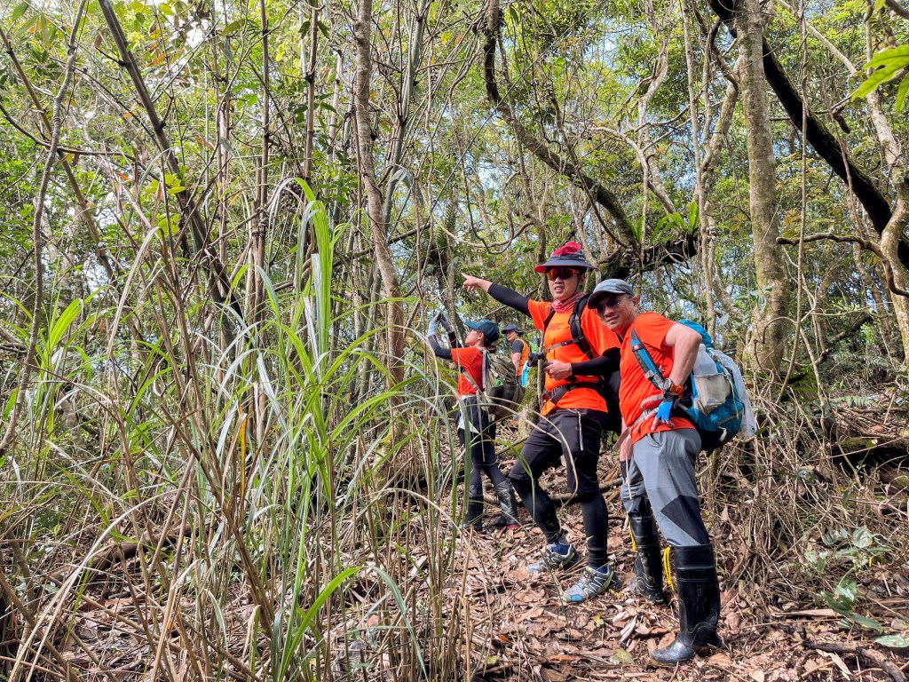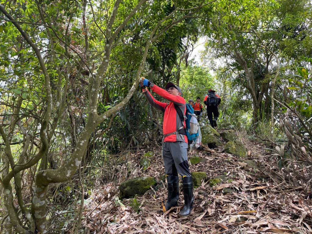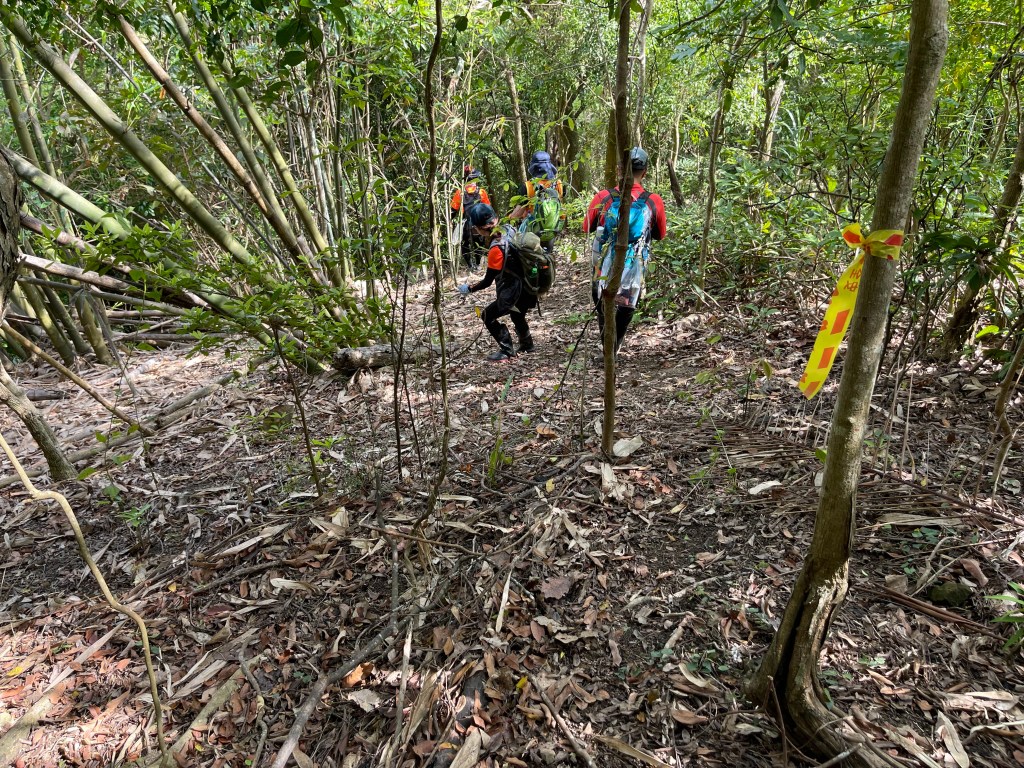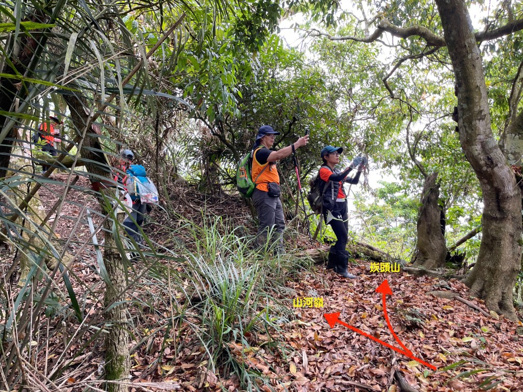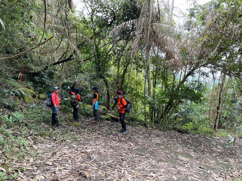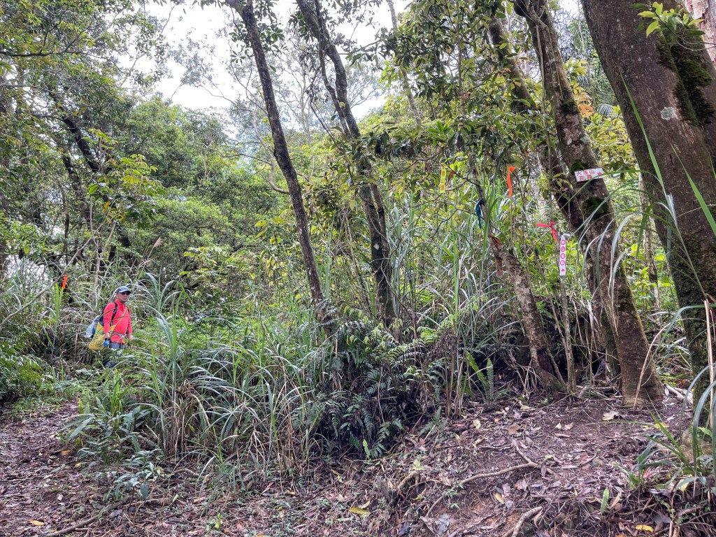 續走400m上一個小山頭,此地就是山河嶺,今天的第十峰,在山河嶺這裡,有一條右岔的路線可以經過獅尾嶺而到崁頭山,但因為我們要完成大凍山縱走曾文水庫,因此我們選擇往左前繼續走。往前走300m後,會抵達截彎取直處,這裡有布條是往左方走再繞一個小U型,之前看了山友德的Youtube影片,也是在此有一個小O繞,因此抵達此處時,我刻意走在最前方,直接稍微往右下走,這時小六反應很快,馬上叫住我,說明布條往左走,我跟小六說明我們可以截彎取直,為了方便,Smile此時已經直接綁上好幾條黃色布條,相信未來再走的朋友就不用小O繞了。