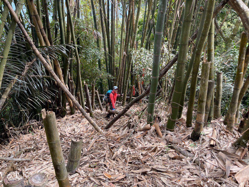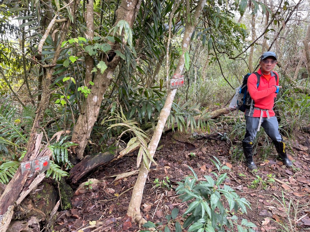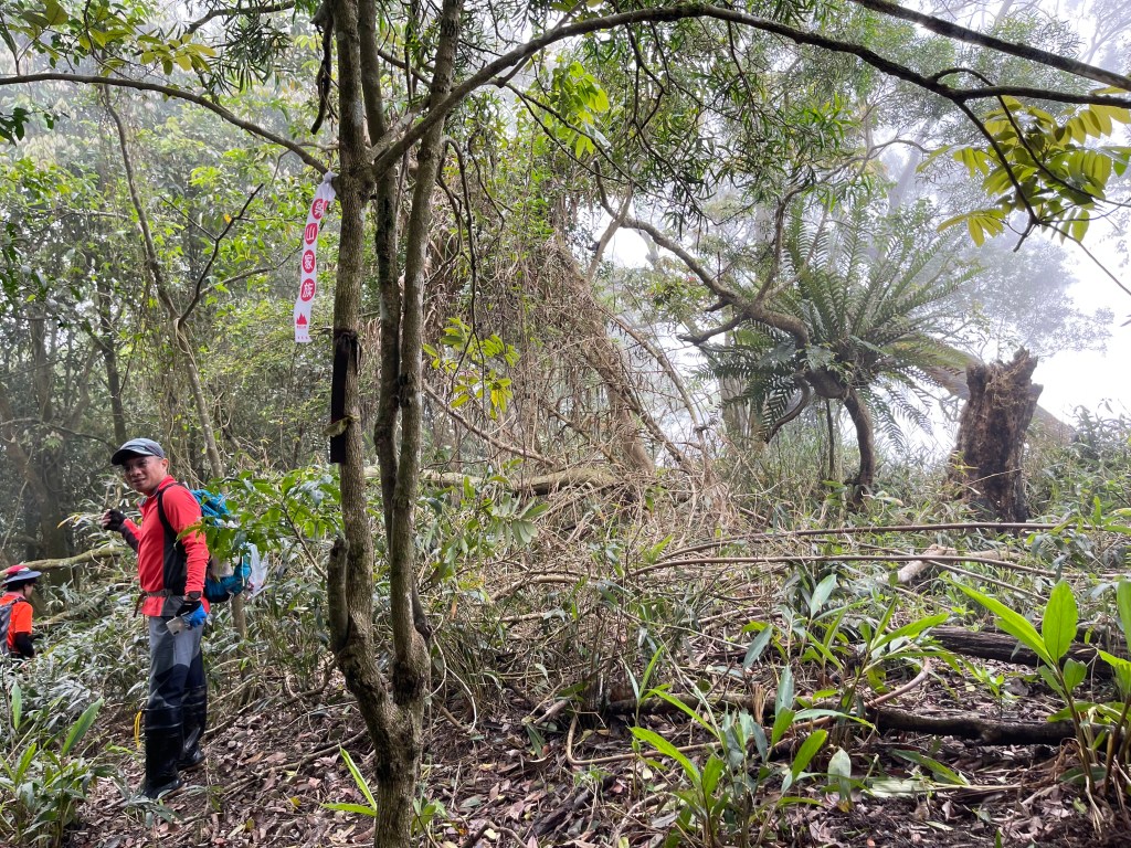 接著,持續陡下中,再繼續走1.2K可抵達竹崙山南峰,這裡有一個三角點,但是沒有任何名牌?我們也無法確定是否是竹崙山南峰,這就是我們今天的第十二峰,拍完照就繼續往下走。在竹崙山與竹崙山南峰之間,有其他山友在此綁了不少的黃色工安布條,因此再走這一段路徑時,不太需要找路就可以很快下山,還蠻感謝綁布條的山友。