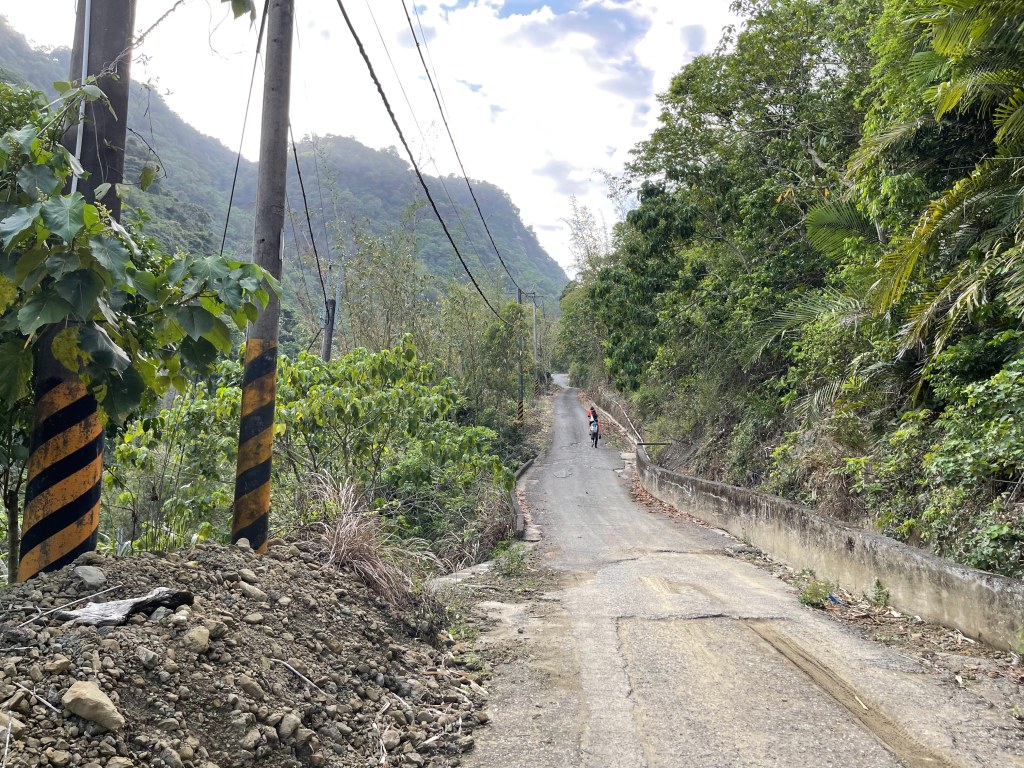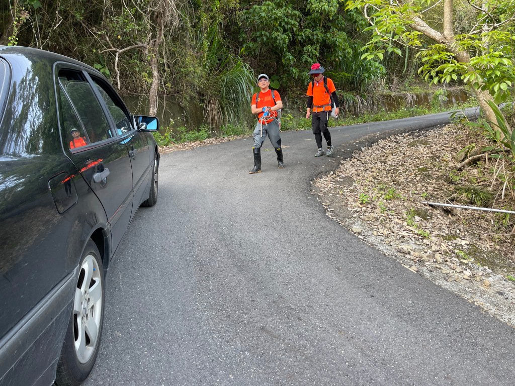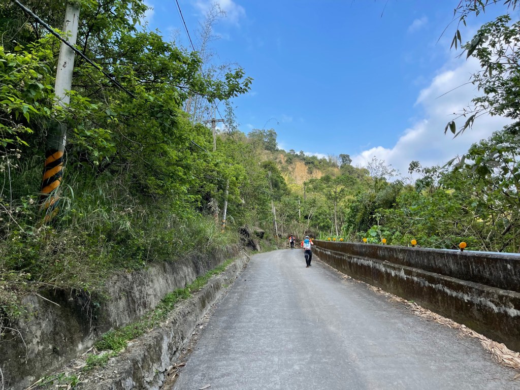 由曾文水庫壩頂走到崁馬鞍部需要7.1K的距離,而由崁馬鞍部走上至崁頭山需要1.7K往返需要3.4K,故總距離需要10.5K。小六、Smile與我(Gosen)三人由壩頂沿著曾庫公路下走700m後,來到今天整日行程的海拔最低點,接著就右轉進入往求福宮的產業道路,要由海拔187公尺上升至崁頭山的海拔844公尺。走了3.4K後,突然看到一台車開過我們,裡面坐了國國與Sonia,原來他們兩人運氣真好,遇到當地人願意載他們到仙公廟孚佑宮去取車,但沒有辦法讓我們三人上車,因此我們三人仍繼續賣力往前,經過20分鐘後就看到國國開車過來載我們。