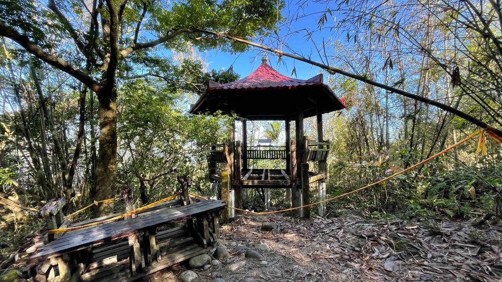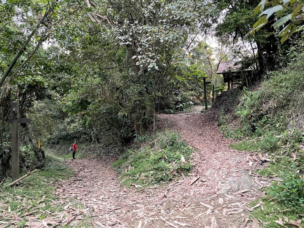停好車後,先不急往大凍山方向走,由離線地圖上來看,只要往土地公廟後方的路徑走0.4K就可以先撿黃牛山,再回程回到土地公廟,接著就開始往大凍山方向走,需要3.5K的距離,一開始的路徑都是水泥路徑,經過幾個岔路後(請朋友們一定要下載離線地圖或注意指示路牌),走一段約500m的鵝卵石陡上路徑後,再度接回水泥路徑,一段之後轉為較陡的泥土石頭路徑,經過橫石亭、曉風亭,一路陡上到有涼亭的大凍山岔,往左繼續陡上200m的距離即可到達大凍山,今天的第二峰。