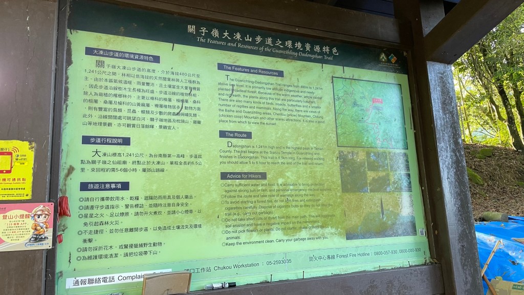 前一晚我們就先將一台車放在台南市東山區仙公廟孚佑宮,以方便完成路線時再開車回到大凍山登山停車場,再回到高雄內門紫竹寺至善會館入住。這一天清晨,我們先將汽車開至關仔嶺紫雲殿仙祖廟,大部份攀登大凍山的朋友們都是把車子停在紫雲殿仙祖廟這裡路邊的兩側,我們決定再繼續將車子往上開到大凍山土地公廟,大凍山登山停車場就在土地公廟旁,但這一段陡上路徑狹窄不易會車,還好今天土地公廟上的車子不多。