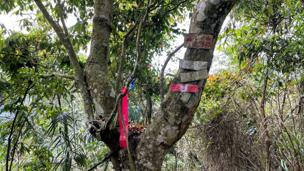 由李子園山繼續往前走0.7K的距離,且持續的拉繩陡下即可到小獅嶺,今天的第九峰。這一段過程黃藤也隨伺在身,此時國國不小心拉了黃藤一下,當場就流了一些血,Sonia馬上拿出OK繃及碘酒給他消炎一下。再往前300m就是容易走錯的位置,此時過了一棵倒木後,不要因為在稜線上看起來是路徑就繼續往前走,而是要注意右側樹幹上有指標寫著:崁頭山,此時要往右轉彎續行。