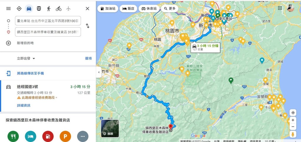 上圖:利用Google地圖由台北車站導航到鎮西堡巨木森林停車收費及雜貨店。直接點按圖片可以進入Google導航畫面 。