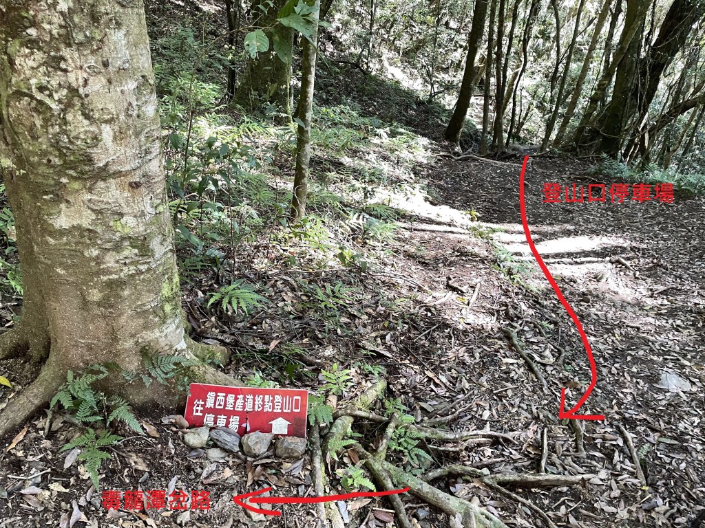 接著往上續行一段,當看到一塊反插著牌子寫著「往鎮西堡產道終點登山口停車場」,便是抵達了AB區神木岔路,又稱毒龍潭岔路。