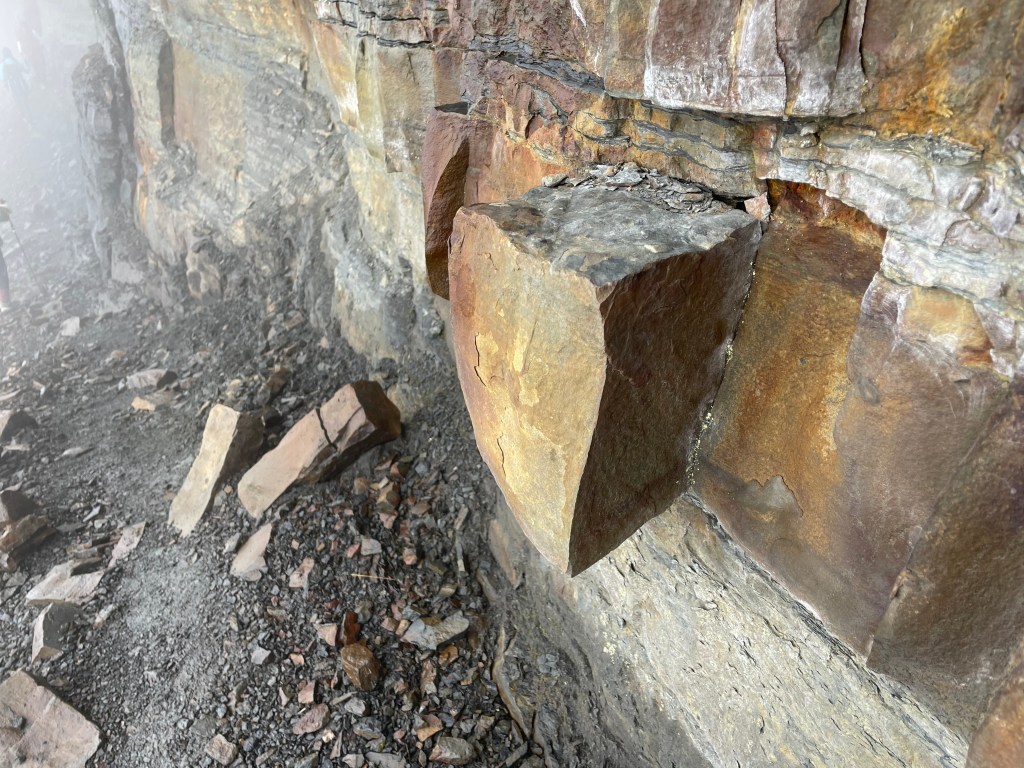 上圖:特寫大霸尖山特殊的岩層結構,是堅硬的四稜砂岩,而霸基則是台灣最古老的沉積岩,400萬年前隨著雪山山脈造山運動一起由海底搖身一變成為孤立挺拔的高山。