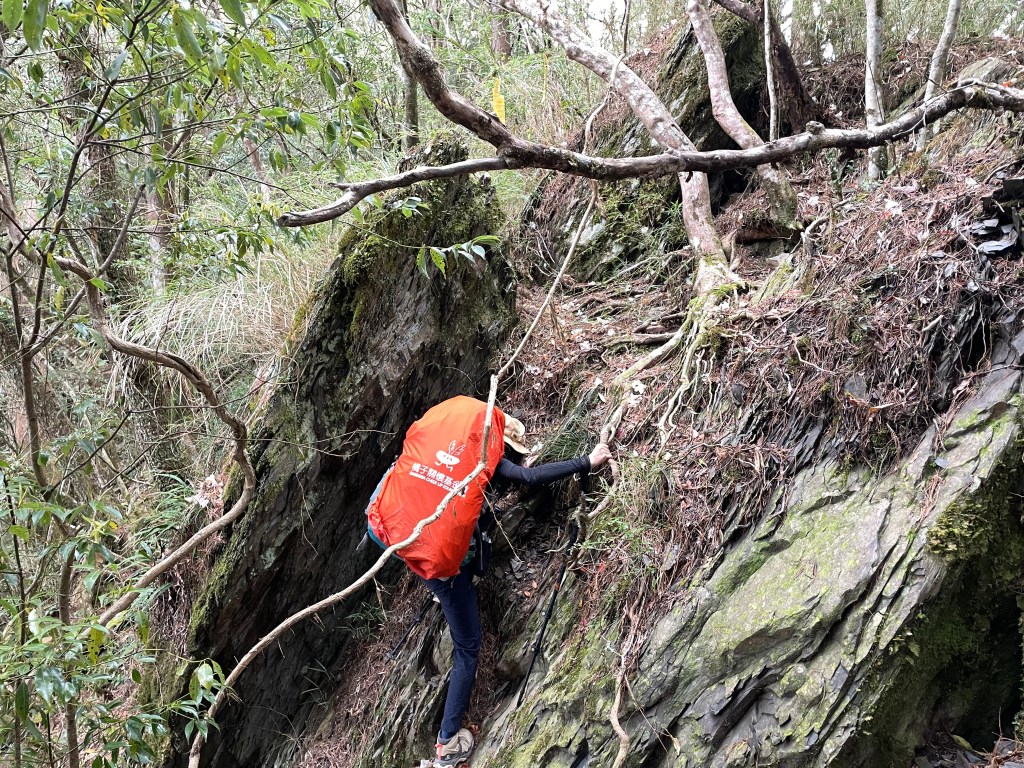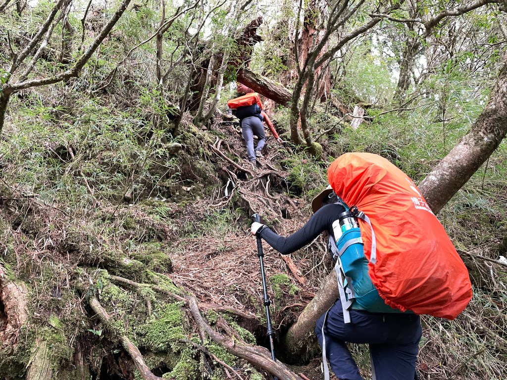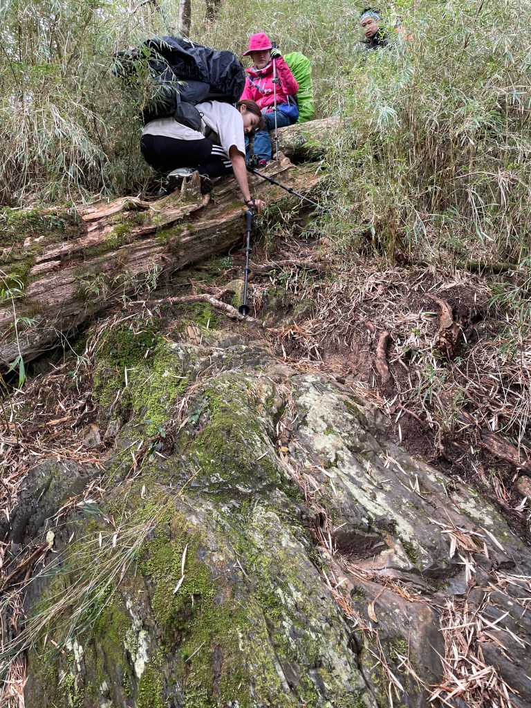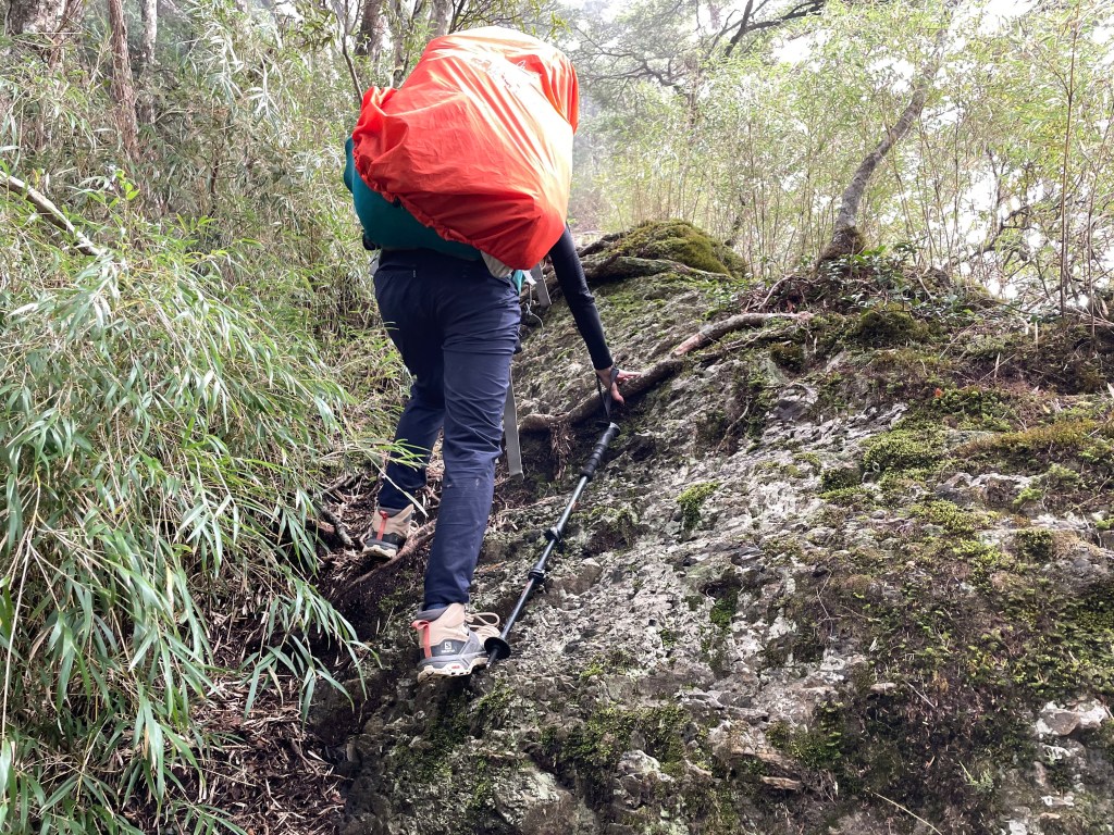 上圖:很快就碰到第二營地前的大片岩石爬坡,D1上來時就已小心翼翼,D2一夜大雨後讓D3下行時更加困難,幾乎只能沿著岩石邊緣緊抓著箭竹緩慢而下。