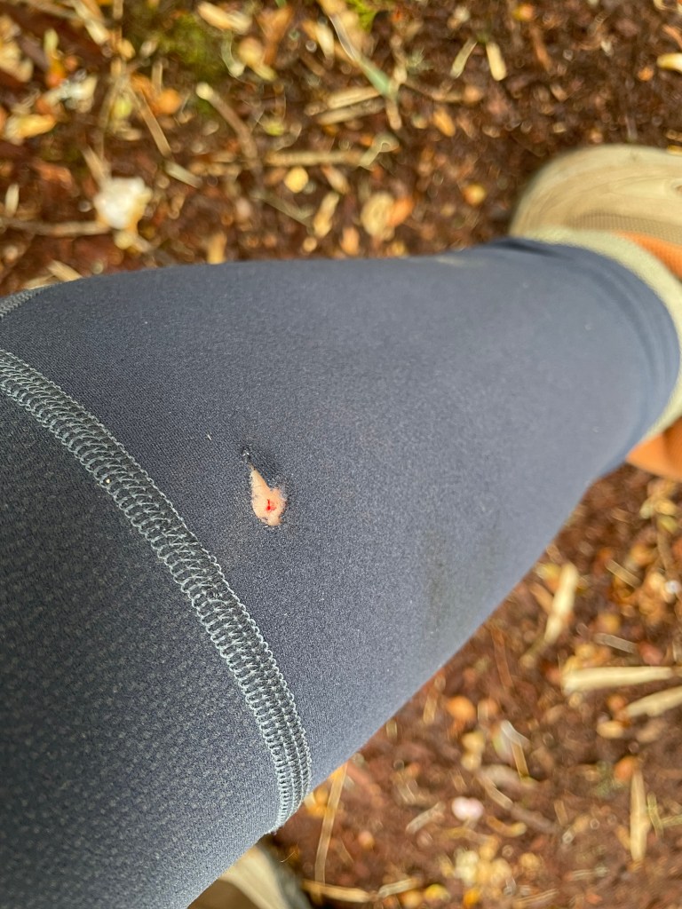 上圖:David 5千多元的小狐狸登山壓力褲被暗藏的樹枝陷阱直接貫穿。