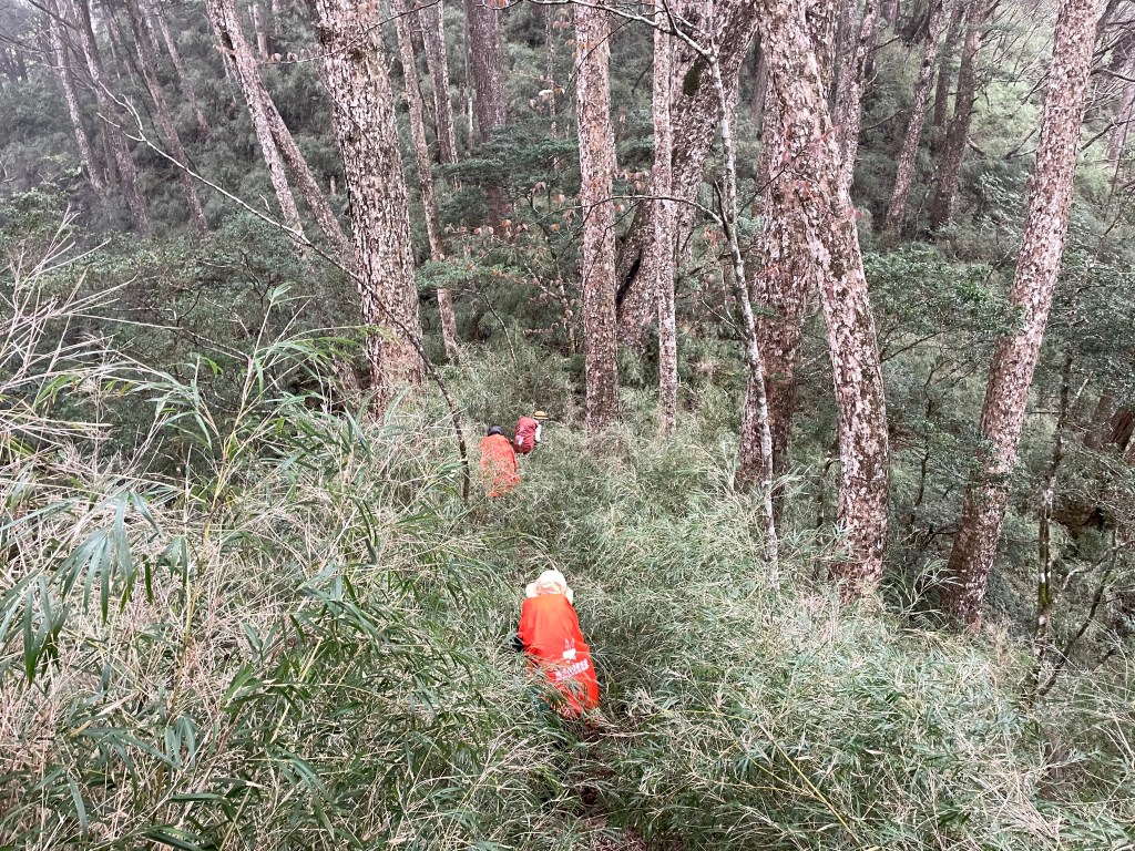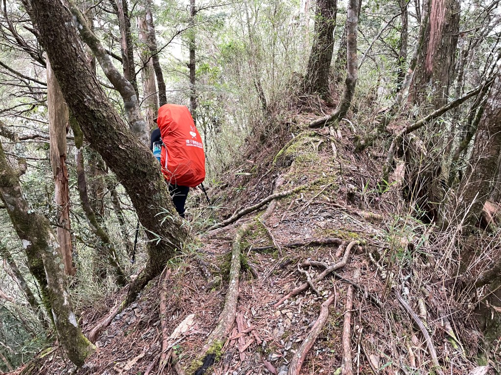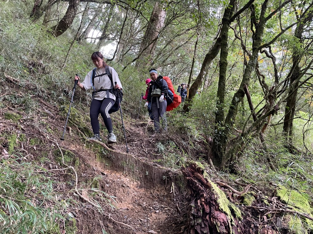 上圖:此時過午霧氣變得更加濃厚,似乎隨時都會下雨,但因為昨夜大雨,由馬洋山岔路口至神木區的陡下路段變得十分濕滑,4人也無法隨意加快速度。