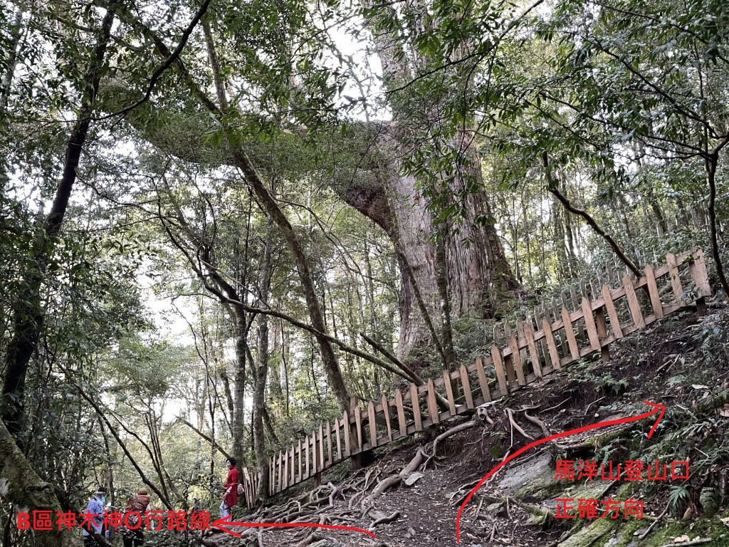 抵達B區神木群的標誌即為見到一顆巨大且被木製柵欄包圍的神木,此為B區神木區第一棵神木,而大霸北稜的路線卻在面對神木的後方,代表在觸碰到第一棵神木柵欄前便要往右上切,有山友紀錄顯示若是沿著柵欄邊緣硬往上切,路徑十分難走,應提前10-20公尺處往右上斜切。David一行人先是超過神木50公尺後發現是遊覽B區神木群的道路,才又退回到第一顆神木柵欄前10-20公尺處上切。