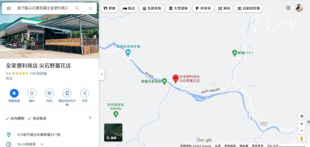 上圖:最後的補給點,全家便利商店尖石野薑花店。直接點按圖片可以進入Google導航畫面 。