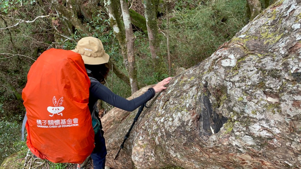 上圖:回到了這棵斜臥在邊坡上的巨木,David上前觀察一下後,嘗試走路線一過去,整個人斜趴在巨木上靠雙手反撐2個手點,但因為巨木往下就直落邊坡了,暴露感實在太重,最後先由古師傅示範如何通過路線一,然而David考量自身能力且要示範走法給後方湘諭,所以改往下切一步嘗試用腳跨過去,無奈巨木實在太大,以David的身高亦無法讓跨出去的腳踩到腳點,必須由古師傅空出一手做手點給David,用向上拉的力讓身體躍過去。