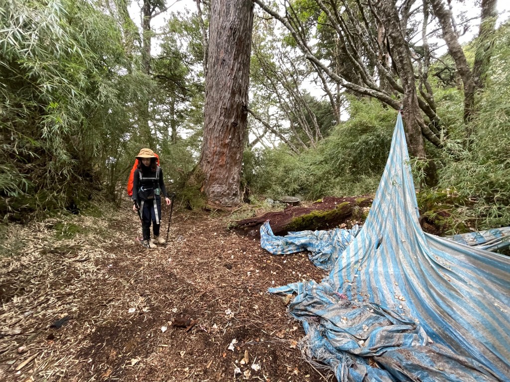 3.第一營地 營地潮濕,砂石地,大約容納4T*1+2T*1,有藍色大帆布及朽木棄置於地,過營地後約1分鐘有標示水源處500m,但地圖上附近並無溪流,可能是山壁水源(無確認),無訊號