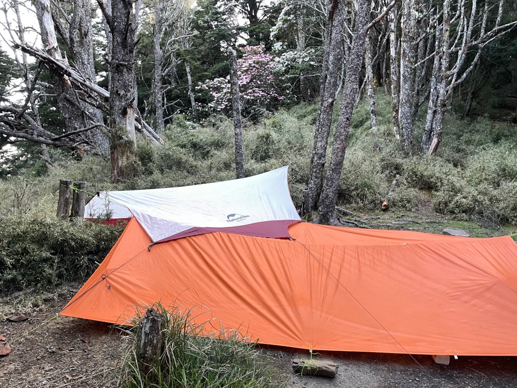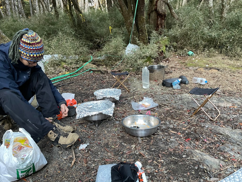 一夜大雨,所幸隊友營地建設良好,且地布都有向內捲起,因此天幕下仍是一片乾爽,而David昨夜用外套在頭上蓋了一個小帳棚抵禦寒風,因此一夜好眠,時間一到便準時起床燒水煮飯,幫隊友準備早餐。
