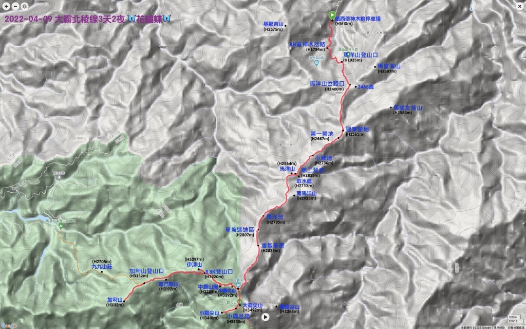 登山日期:2022年04月09日至04月11日 參與人員:David ……………….古師傅(David的嚮導教練) ……………….Bel (David同期學員兼同事) ……………….于倫(David同期學員) ……………….Ivy (已完訓學員兼David同事) ……………….智鈞(已完訓學員,也叫David) ……………….龍哥(David同事) ……………….湘諭(100%爬山新手) 男女比例:4男4女 新手比例:7老1全新 天氣狀況:D0晴,D1晴轉多雲,D2晴轉陰夜大雨,D3陰轉雨天✶ 當日氣溫:5度C~12度C 全程距離:53.8 km。D1:12.5km,D2:28.8km,D3:12.5km 海拔落差:1809 m (H1610m~H3419m) 累計爬升:3621 m (Garmin) 累計爬降:3656 m (Garmin) 難易程度:高 (C+級)✶ 起登前3~5天雨天,起登前2天晴天