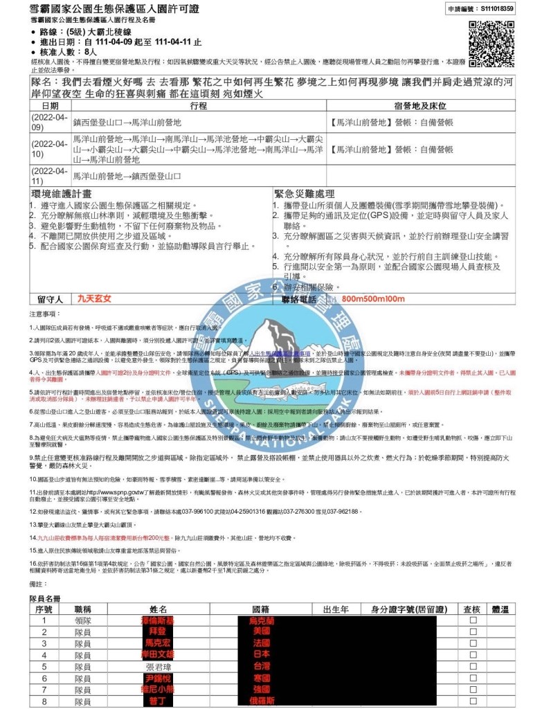 進入雪霸國家公園生態保護區需要申請入園證,許可證範本如下: