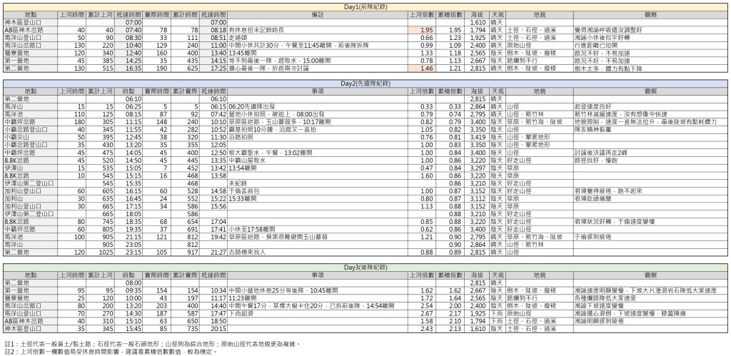 而David此次是與高山嚮導訓的部分同期/前期隊員協同教練上山,另有一名爬山新手由教練負責指導,由於隊伍遵循團體行動不落單,因此除D2由David及2名隊友組成的「先遣隊」可自由行動攻取大霸群峰外,其餘D1各大點均有整隊,D3則是由David全程指導湘諭下山步伐,因此紀錄的時間十分緩慢,實際行進時間應更短,故時程部分山友不應全盤參考。