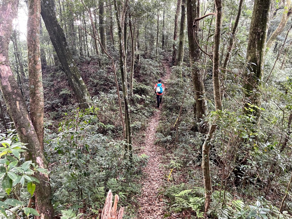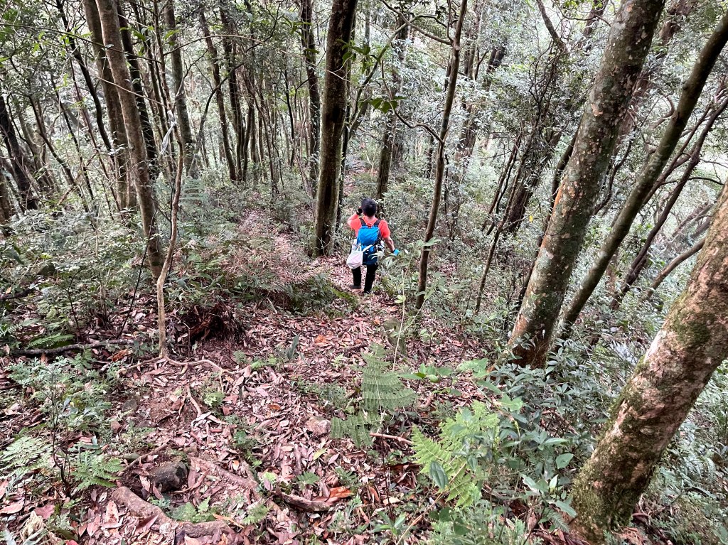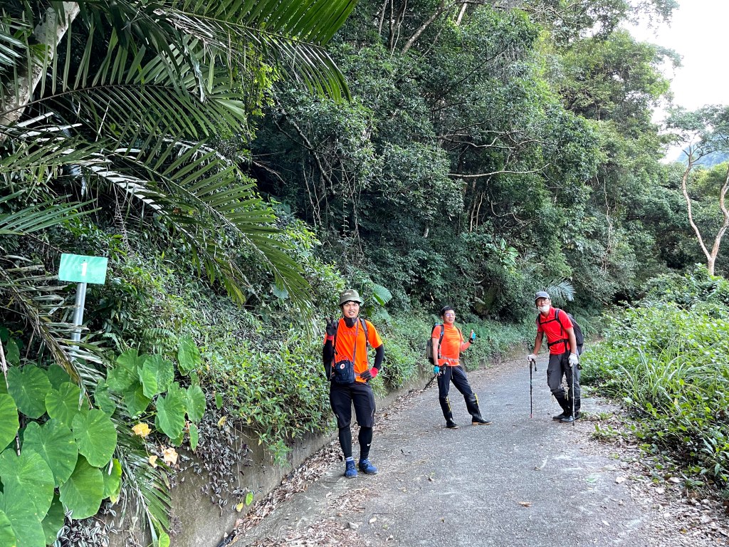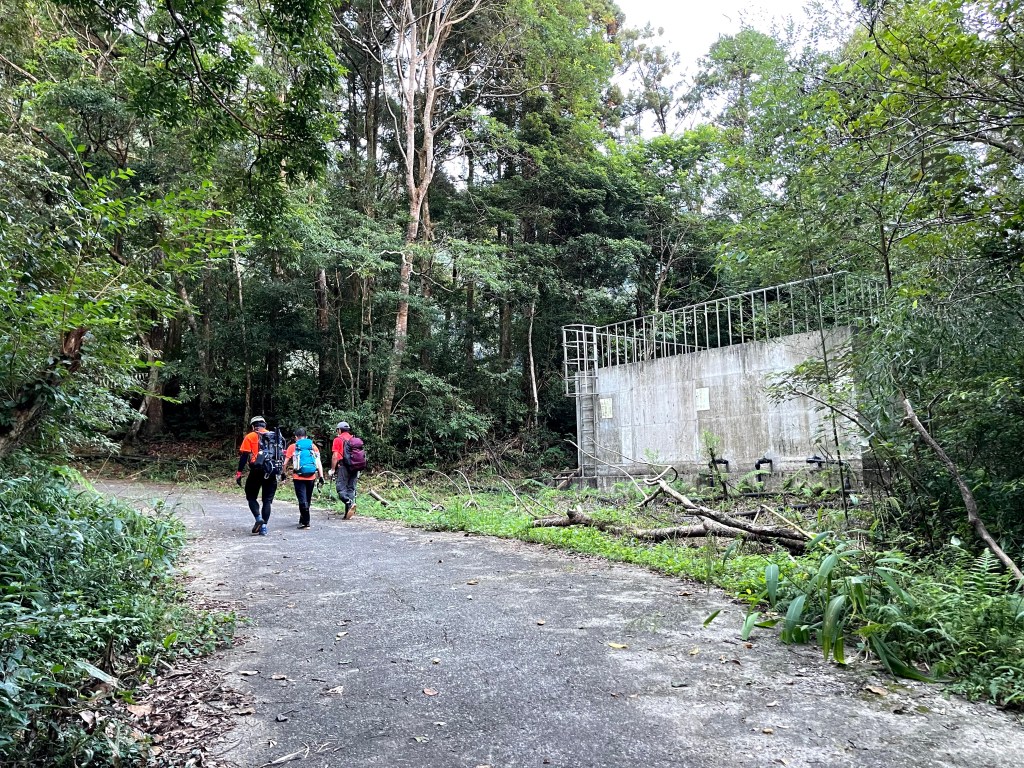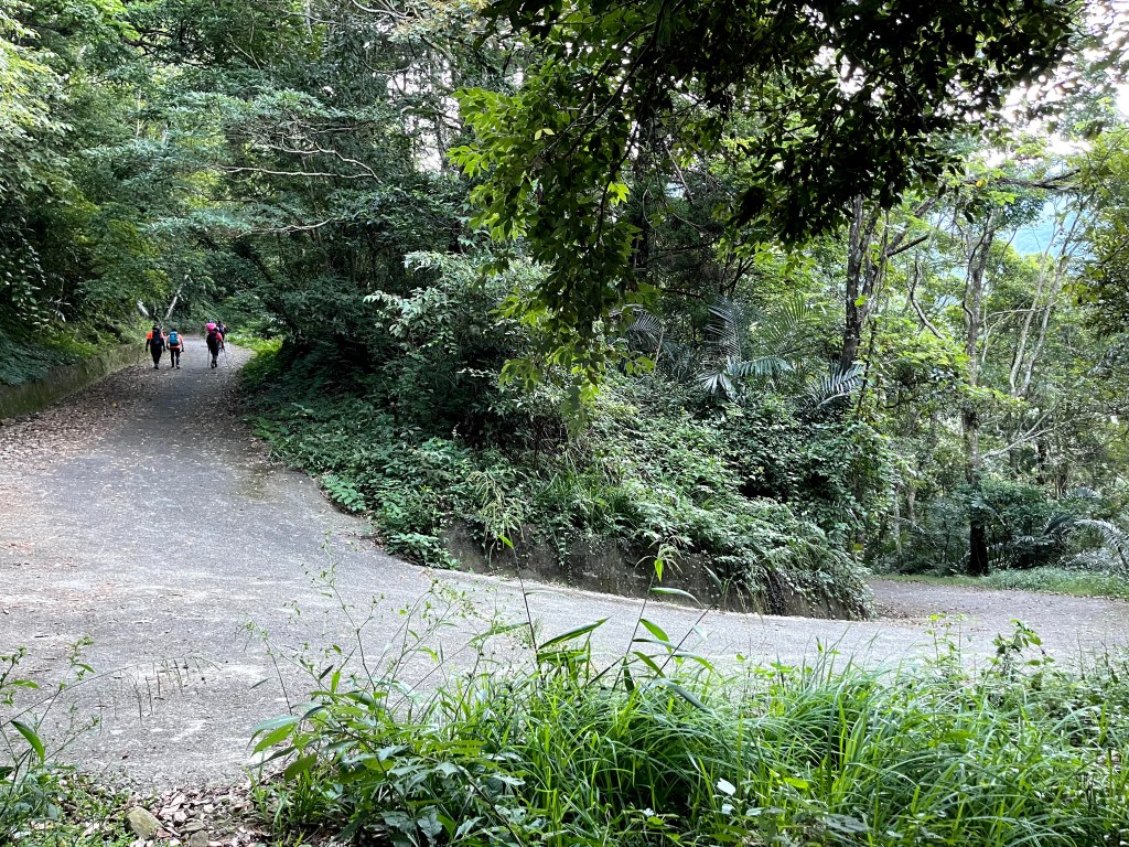 接著,由蓮包山往停車場走,要先陡上過馬武督山岔(K點),再經過鴛鴦谷瀑布岔(M點),記得在此岔路要往右走!,接著就會接上水田林道(N點),再走不到300m就回到水田林道第一停車場。