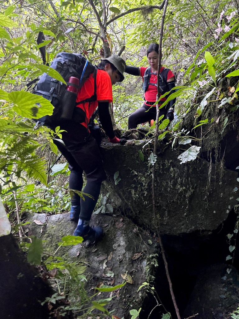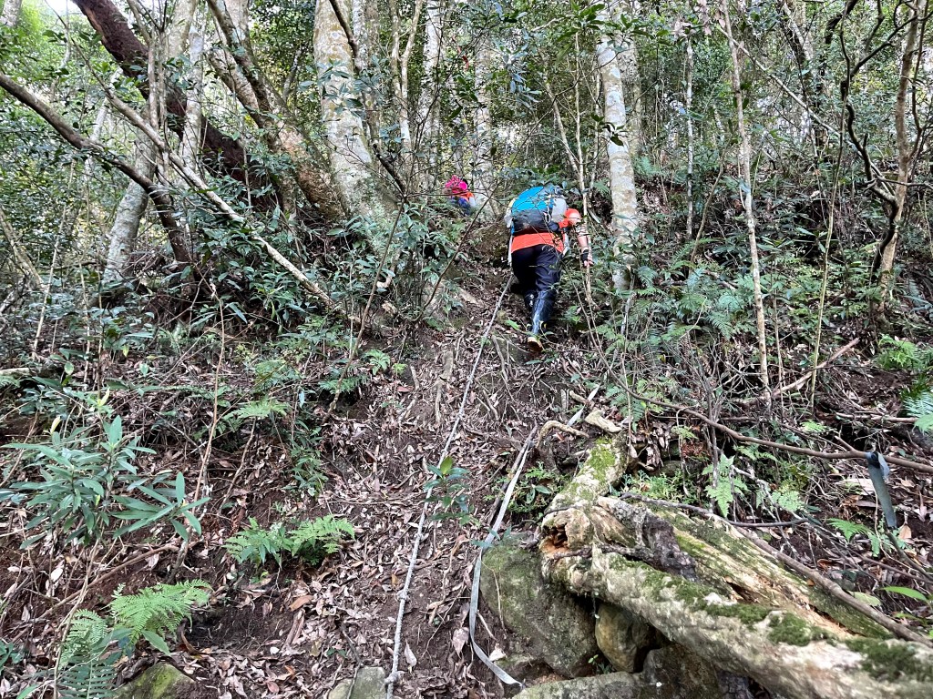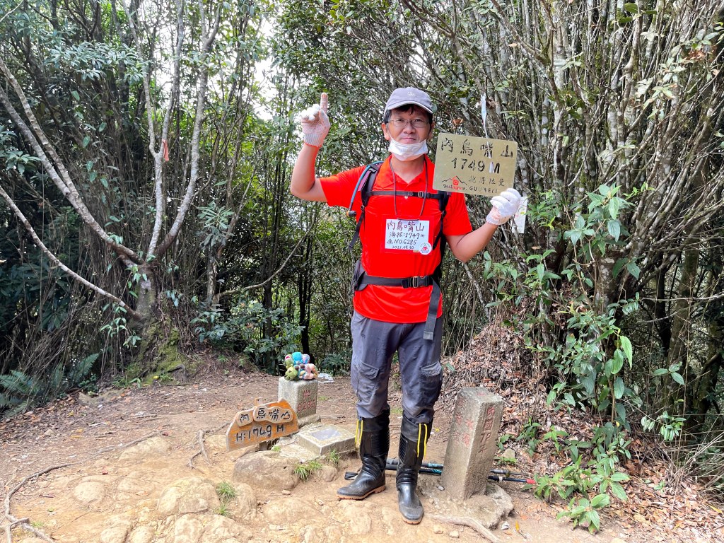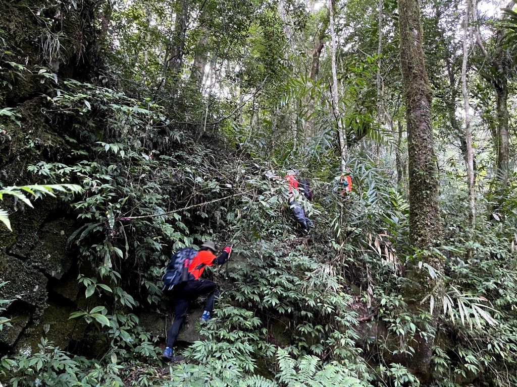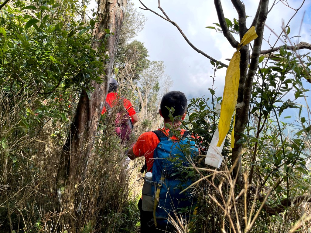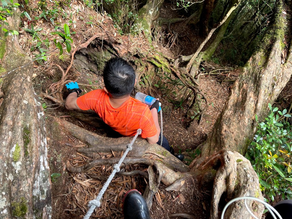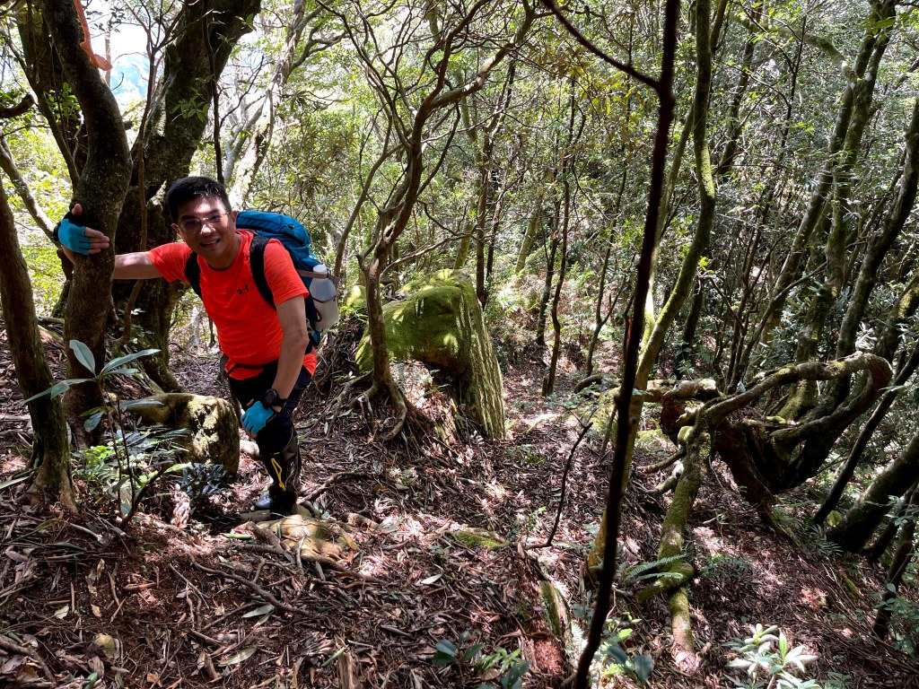 由三岔路口上那結山,要先陡上到假山頭再陡下到鞍部再陡上到那結山,也就是這段短短的300m的距離裡,要走N型的上沖下洗路線。來到那結山後,阿泰說之前那結山三角點脫離了,所以他花了兩次的時間,背水泥上來把它固定好,齁齁,真有你的!背水泥上來可不是容易的事情啊!因此,我們的文章特以阿泰為封面,向你致敬一下!