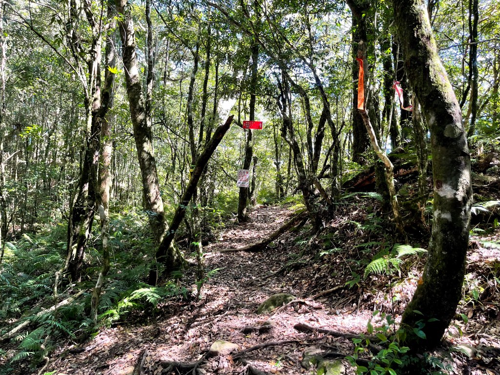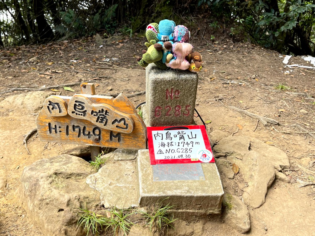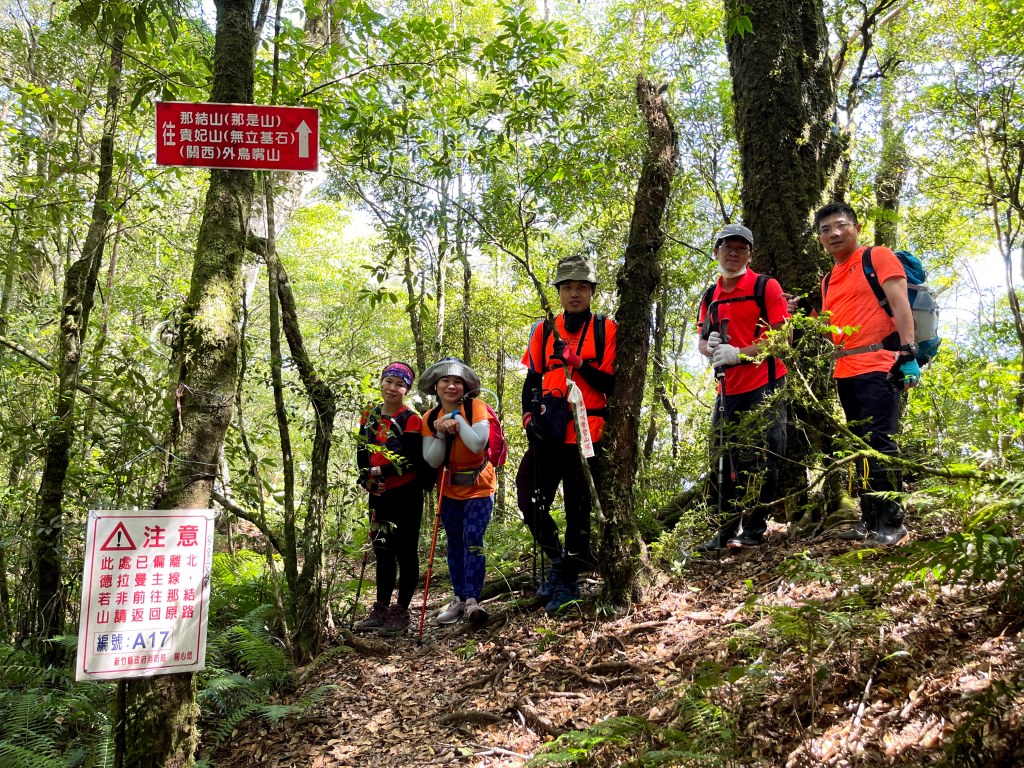 在這一段抵內鳥嘴山的路徑上,與之前來過的感覺不同,路徑上被整理得比較寬大乾淨。內鳥嘴山三角點這裡,展望不開只有局部。休息後,往回走,先經過等高線圖的B點、A點、過C點、貴妃山岔的D點,而來到三岔路口的E點,我們的菲律賓兩位女生,說她們肚子餓了,所以,我們在三岔路口(就是內鳥嘴山、那結山與外鳥嘴山的岔路口)休息吃午餐,並決定輕裝上那結山,故每人都將背包放置於此,只帶著一瓶水上那結山。