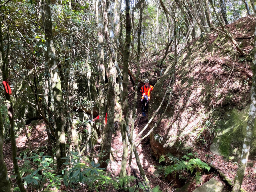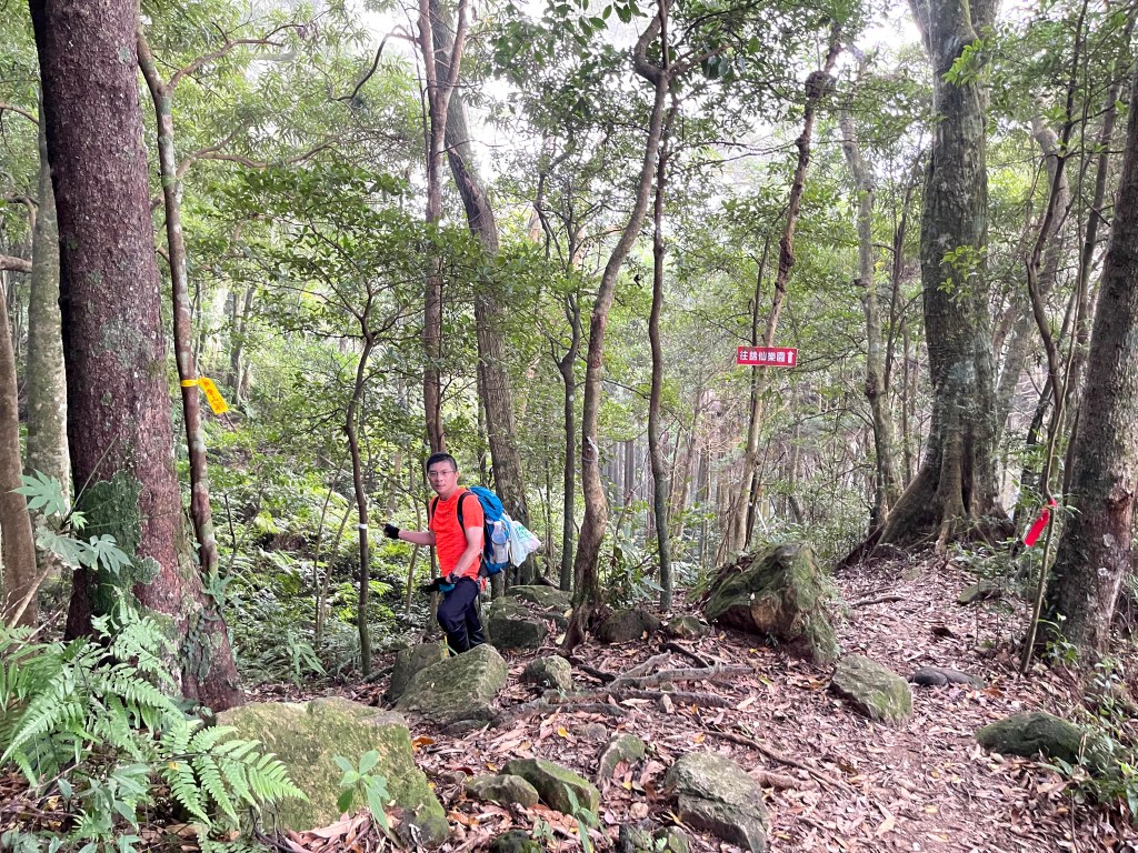 由那結山回程,再走一次倒N路徑回到三岔路口,各人取回各自的背包,繼續往下接上外鳥嘴山與林道岔,也就是等高線圖中的F點,接著下右岔往外鳥嘴山走,這一段要經過四個假山頭的淬煉後,才能抵達外鳥嘴山。外鳥嘴山,沒有三角點,就是以裸岩稜線為三角點,此時阿泰又說,這個名牌也是他做的!喔?這附近的紅色名牌都是你阿泰做的吧?沒錯!