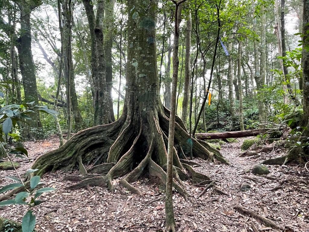 清晨,我們分別由台北與台中兵分兩路到水田林道第一停車場會合,起登後沿著水田林道逐漸緩上,途中經過蓮包山岔(N點)、外鳥嘴山第一登山口、外鳥嘴山第二登山口,在接近水田林道2.5K時,就會看到一個不太起眼,但有路牌及布條的狂風嶺登山口,由此往右下切,過第一段水不多的溪,陡上後再走很濕滑的陡下段,就會在過第二段溪,接著就開始往上爬,會看到一棵大神木後就會開始脫離潮濕的路徑,但也開始要一路陡上到內鳥嘴山。