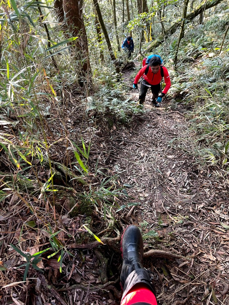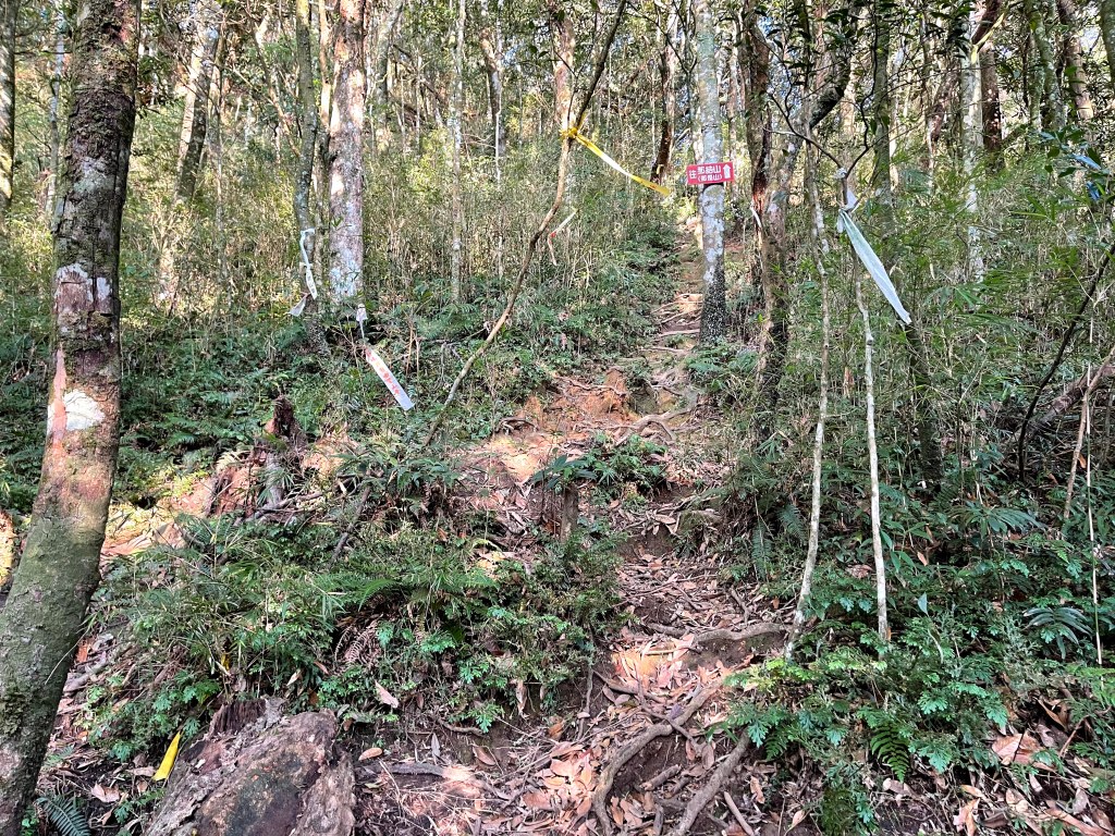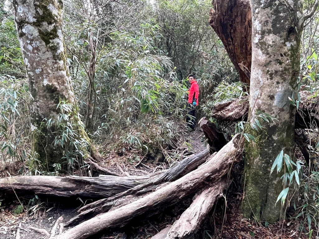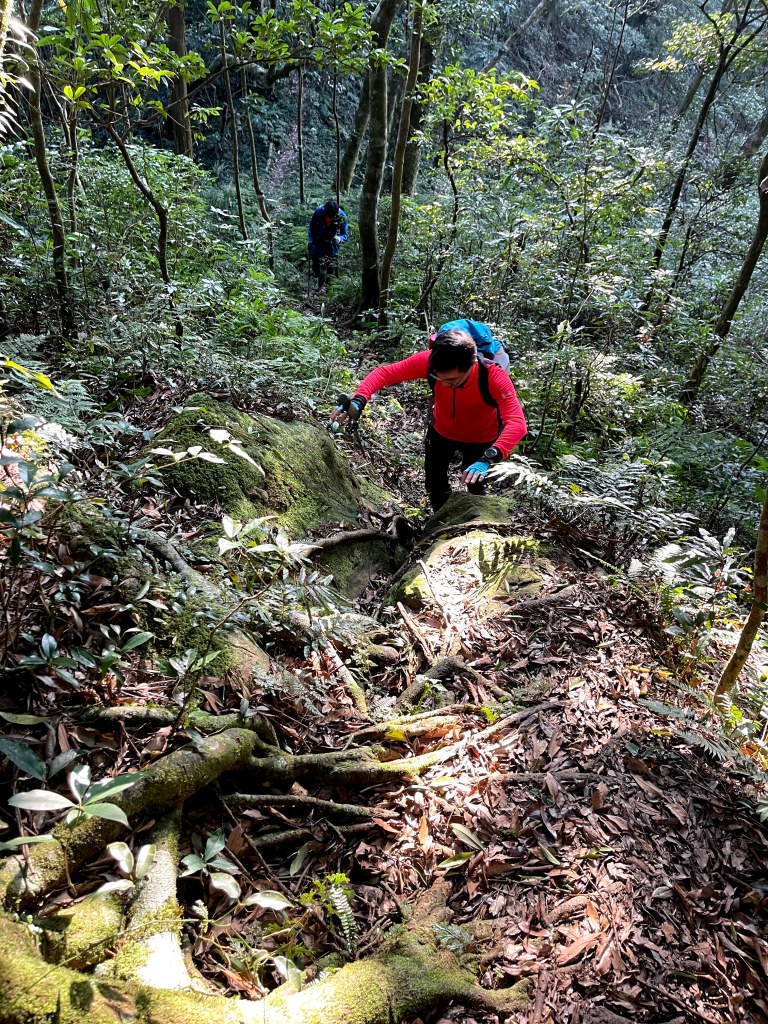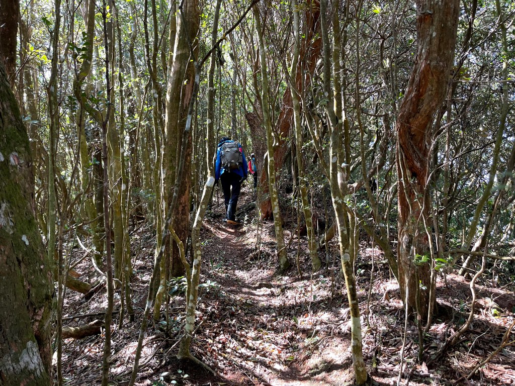 這個陡上的過程,大約在海拔1200m時會陡上到一處假山頭,兩側都是瘦稜且位於杜鵑林內,路徑呈現鬆軟有彈性的鬆軟地形,林相算得上優美!通過瘦稜一段後路徑再度呈現陡上。