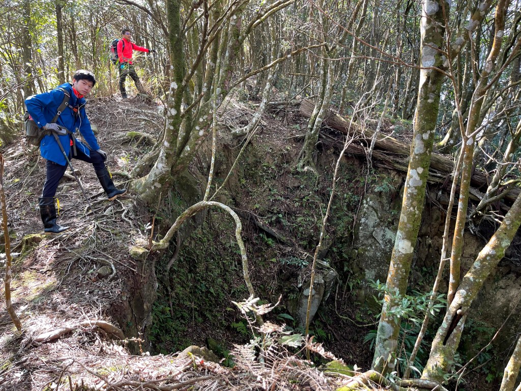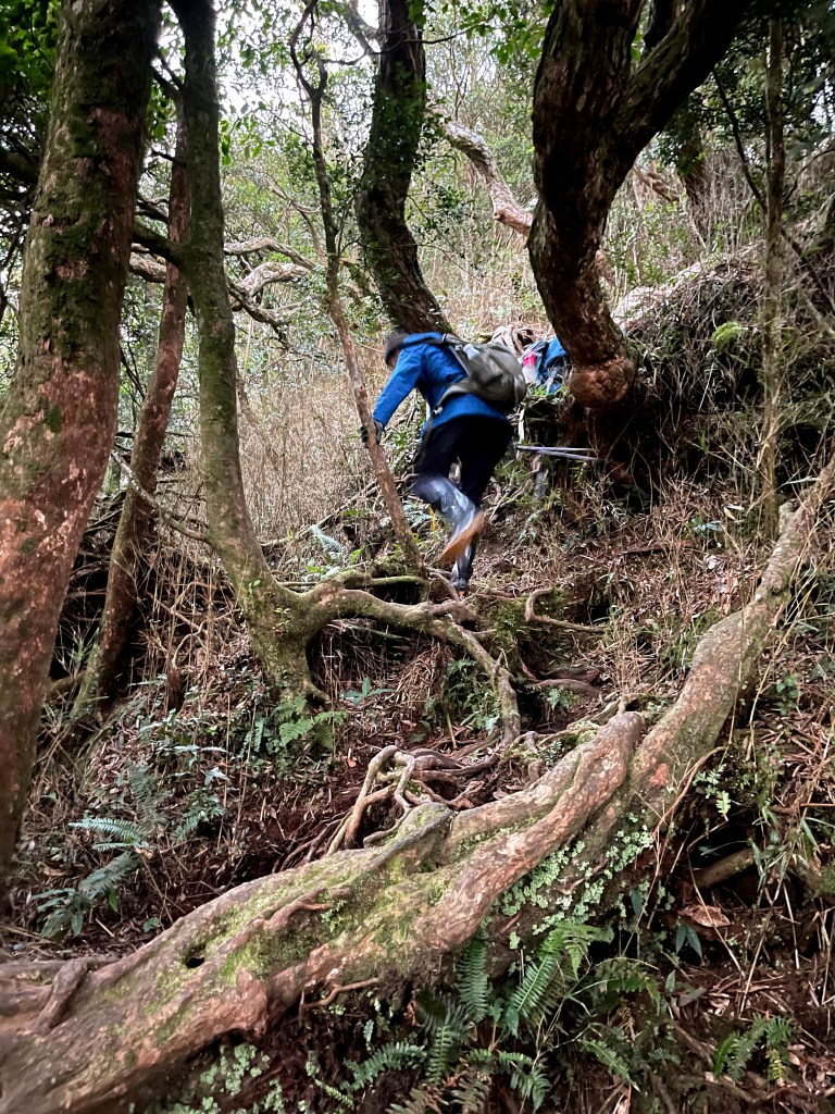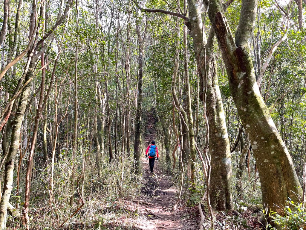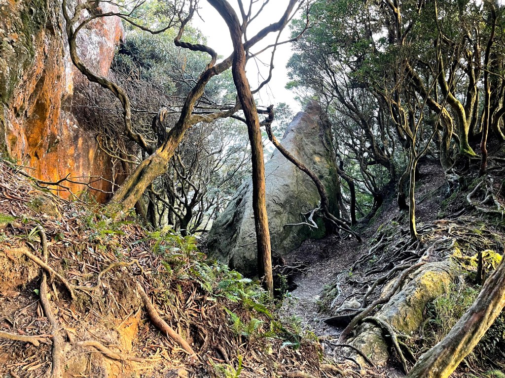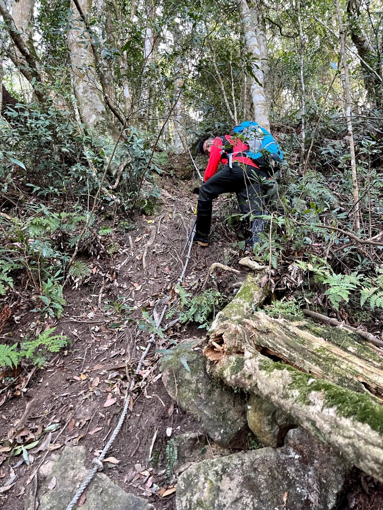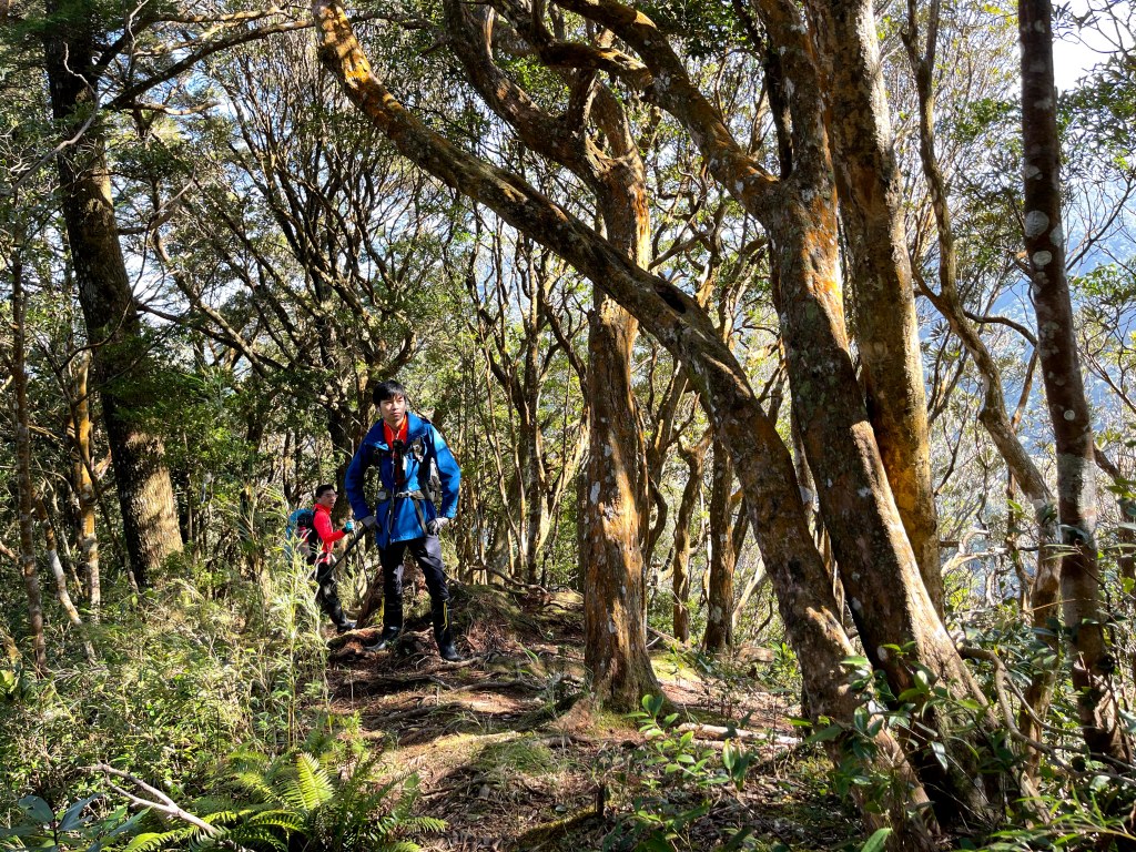 這個陡上的過程,大約在海拔1200m時會陡上到一處假山頭,兩側都是瘦稜且位於杜鵑林內,路徑呈現鬆軟有彈性的鬆軟地形,林相算得上優美!通過瘦稜一段後路徑再度呈現陡上。