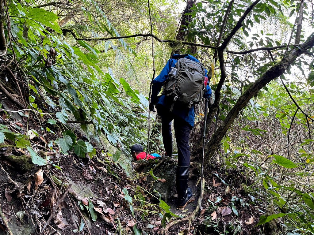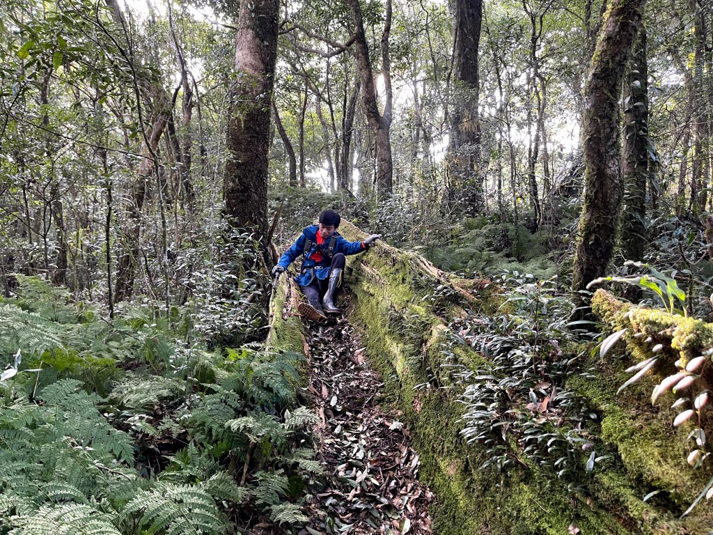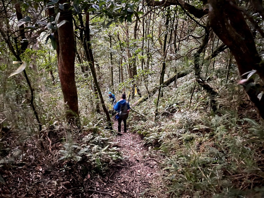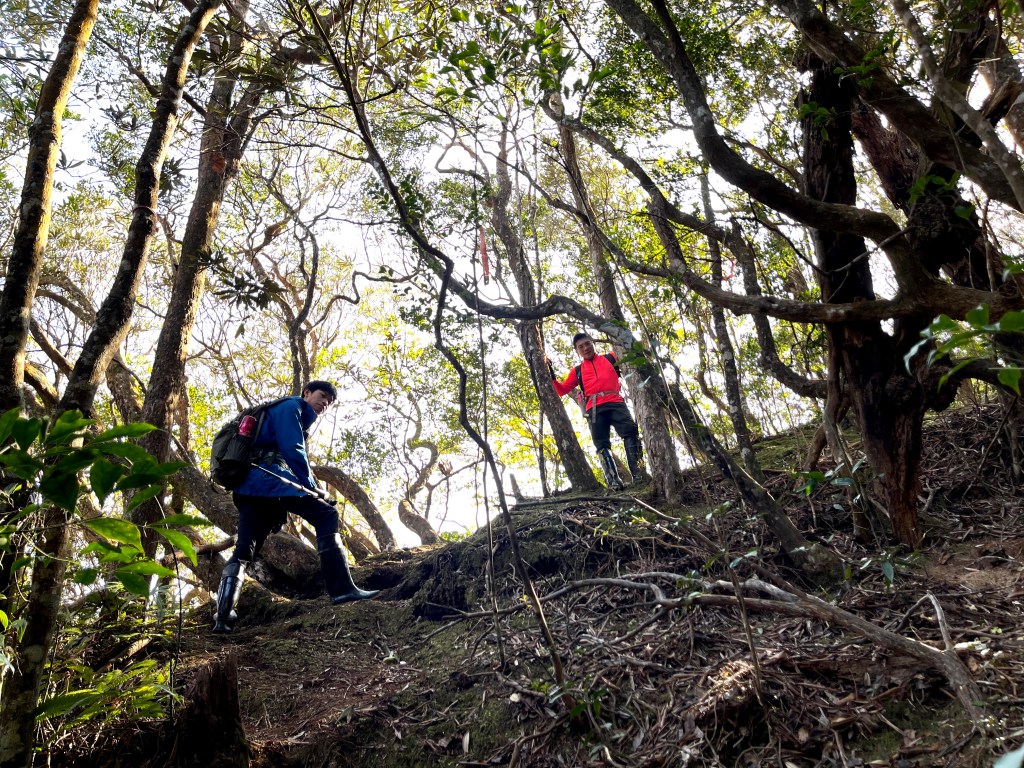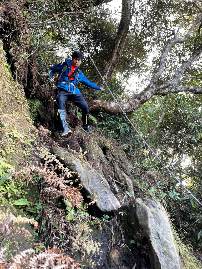 這個陡上的過程,大約在海拔1200m時會陡上到一處假山頭,兩側都是瘦稜且位於杜鵑林內,路徑呈現鬆軟有彈性的鬆軟地形,林相算得上優美!通過瘦稜一段後路徑再度呈現陡上。