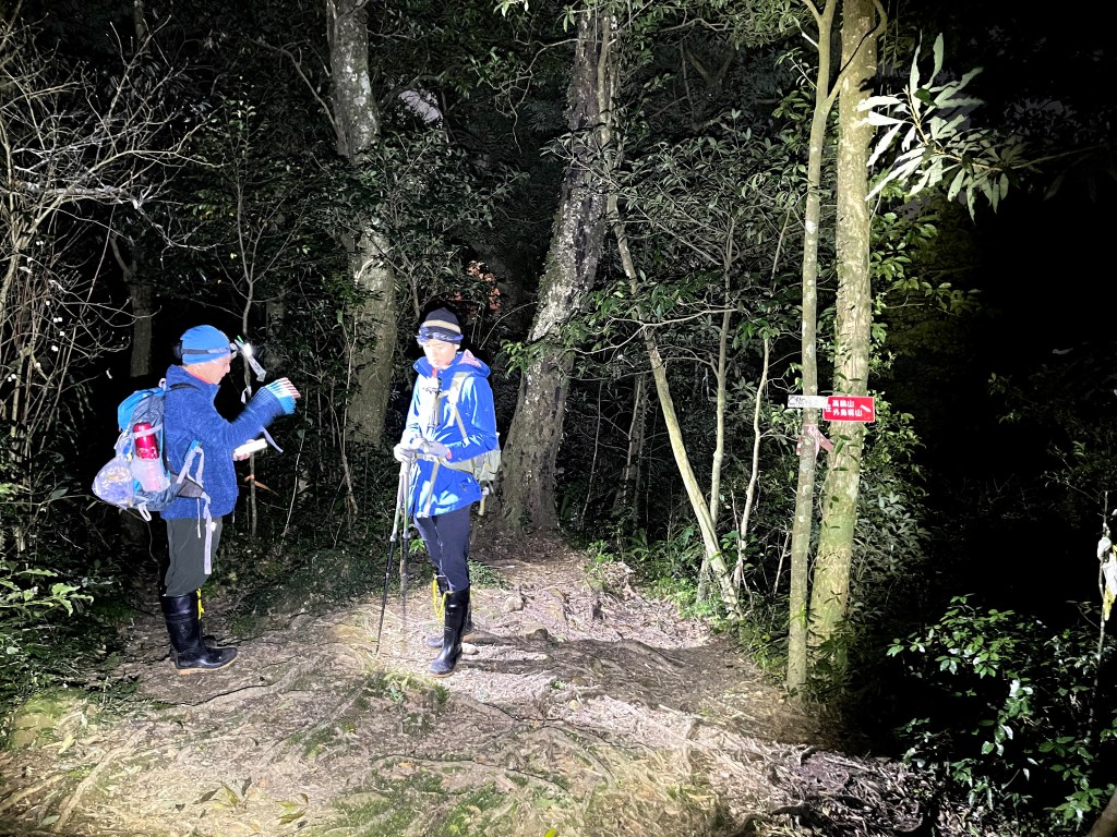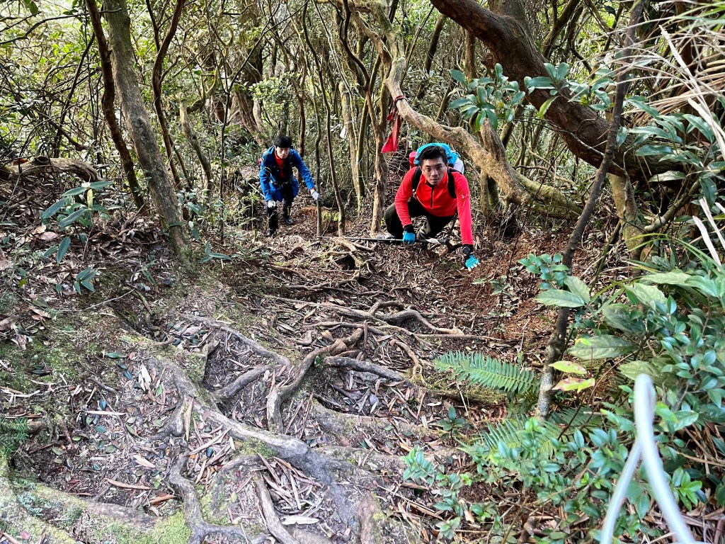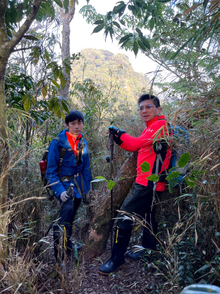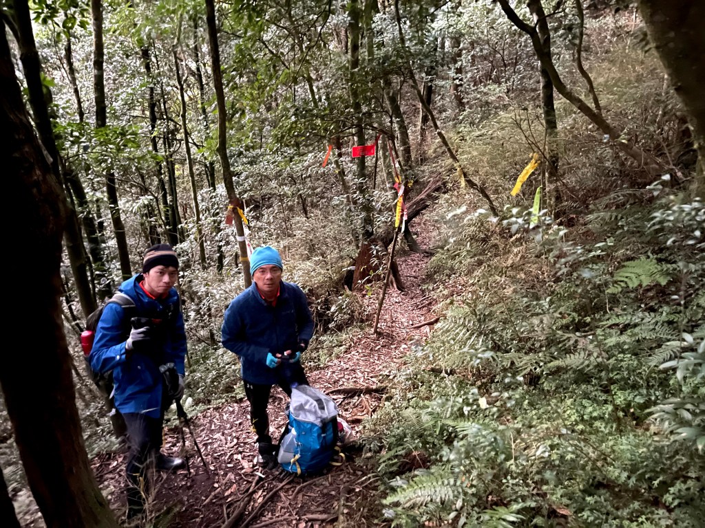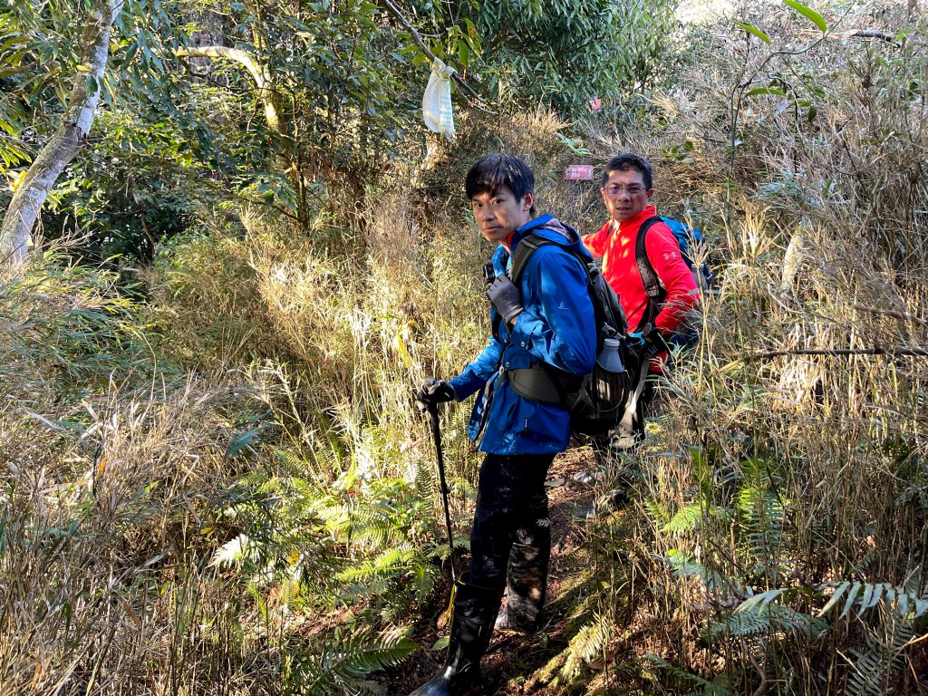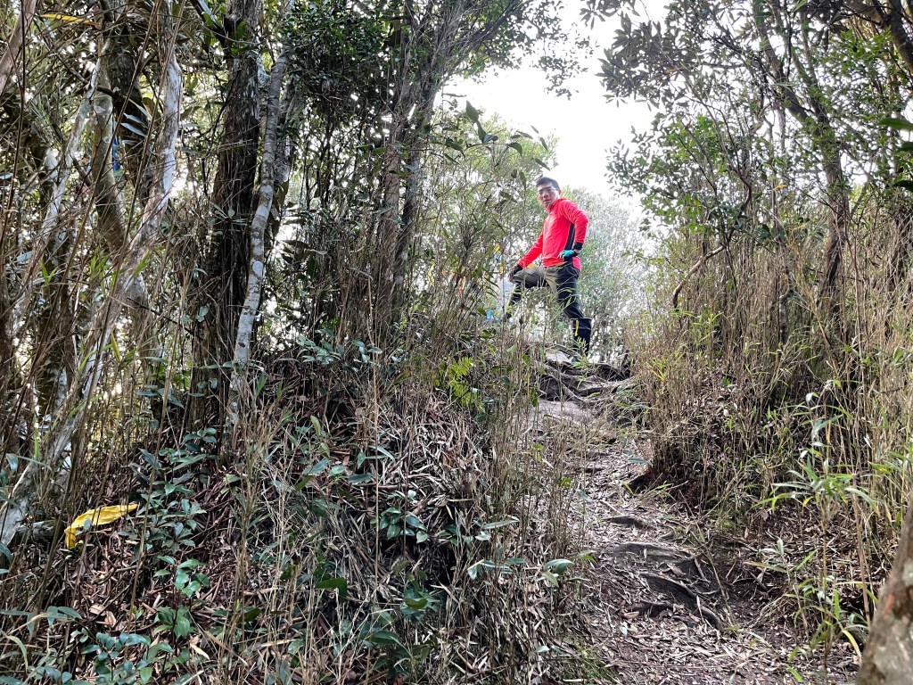 由三岔路口上那結山,要先陡上到假山頭再陡下到鞍部再陡上到那結山,也就是這段短短的300m的距離裡,要走N型的上沖下洗路線。這一天相當寒冷,來到那結山後,趕緊泡了一碗熱騰騰的泡麵來吃,也在此看著Steven進行黃昏那結山的空拍。