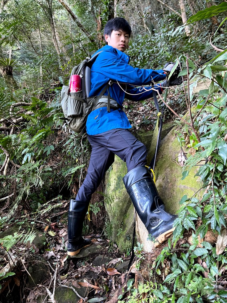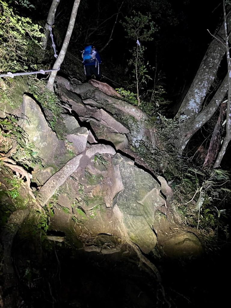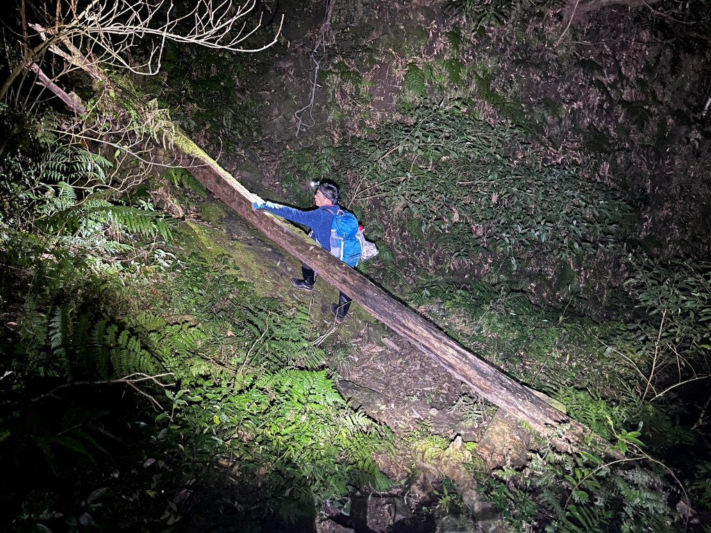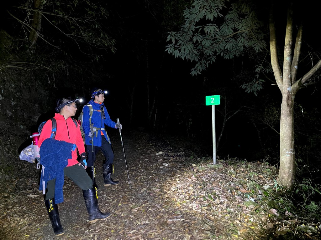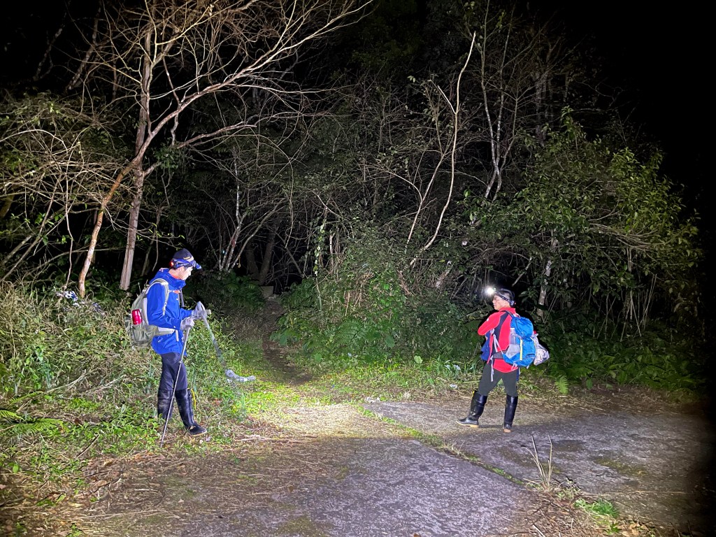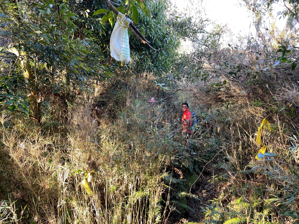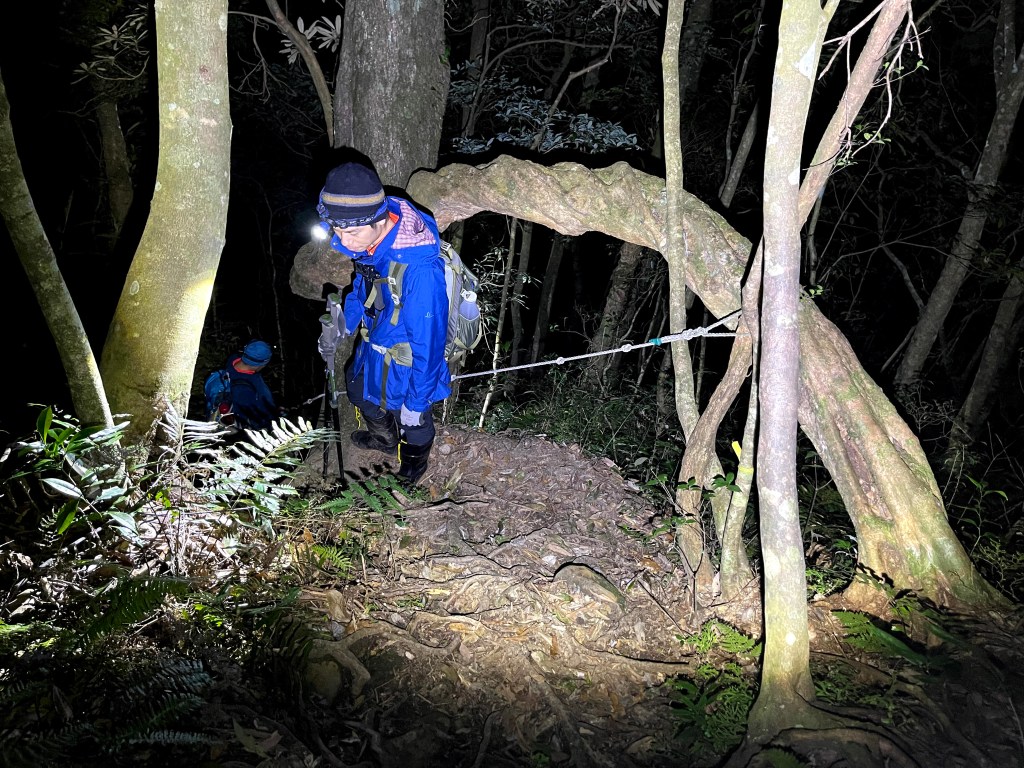 由三岔路口上那結山,要先陡上到假山頭再陡下到鞍部再陡上到那結山,也就是這段短短的300m的距離裡,要走N型的上沖下洗路線。這一天相當寒冷,來到那結山後,趕緊泡了一碗熱騰騰的泡麵來吃,也在此看著Steven進行黃昏那結山的空拍。